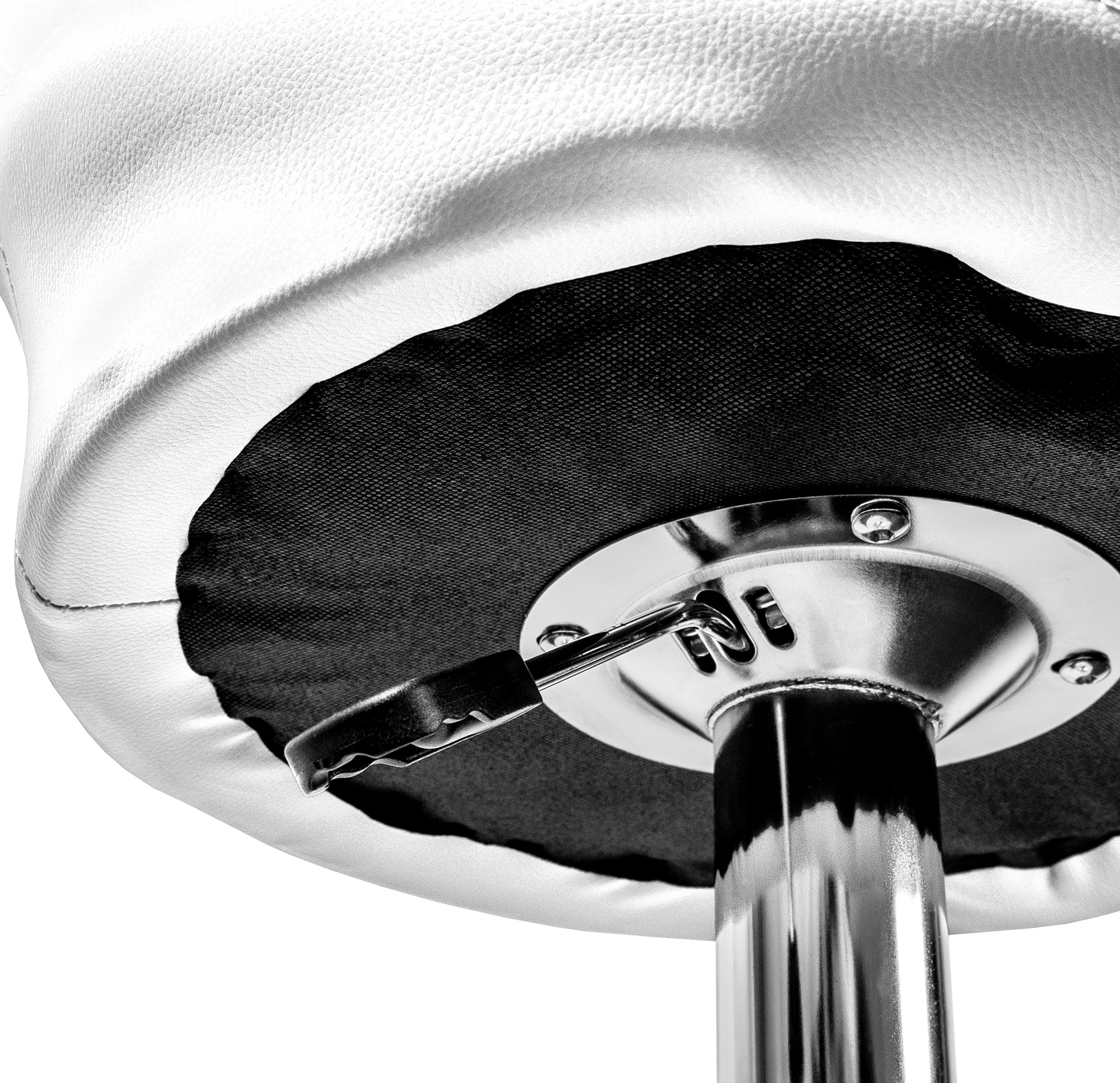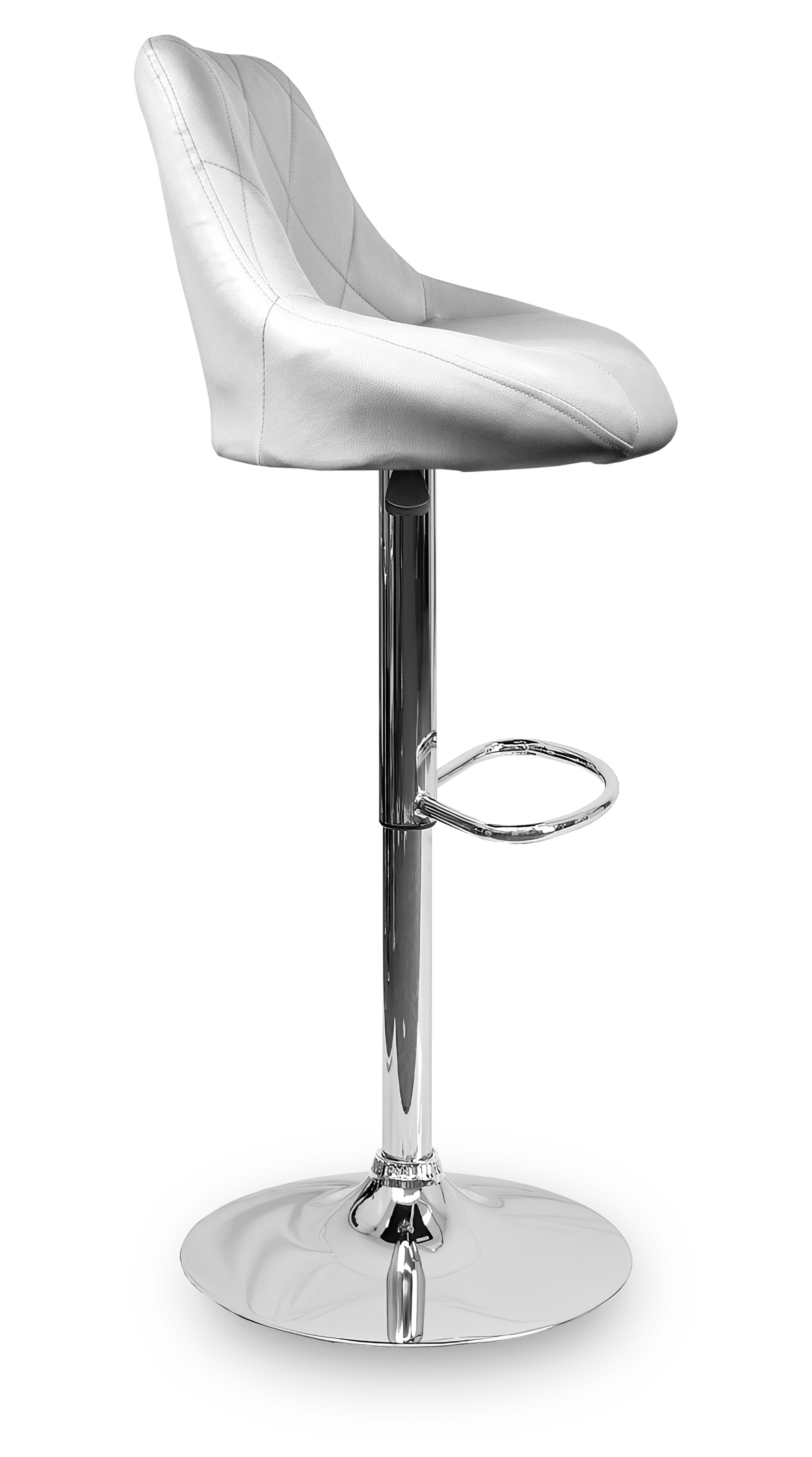 Stolička má praktickú opierku na nohy z pochrómovaného kovu. Kruhová podnož a centrálná noha sú z chrómu v lesku.