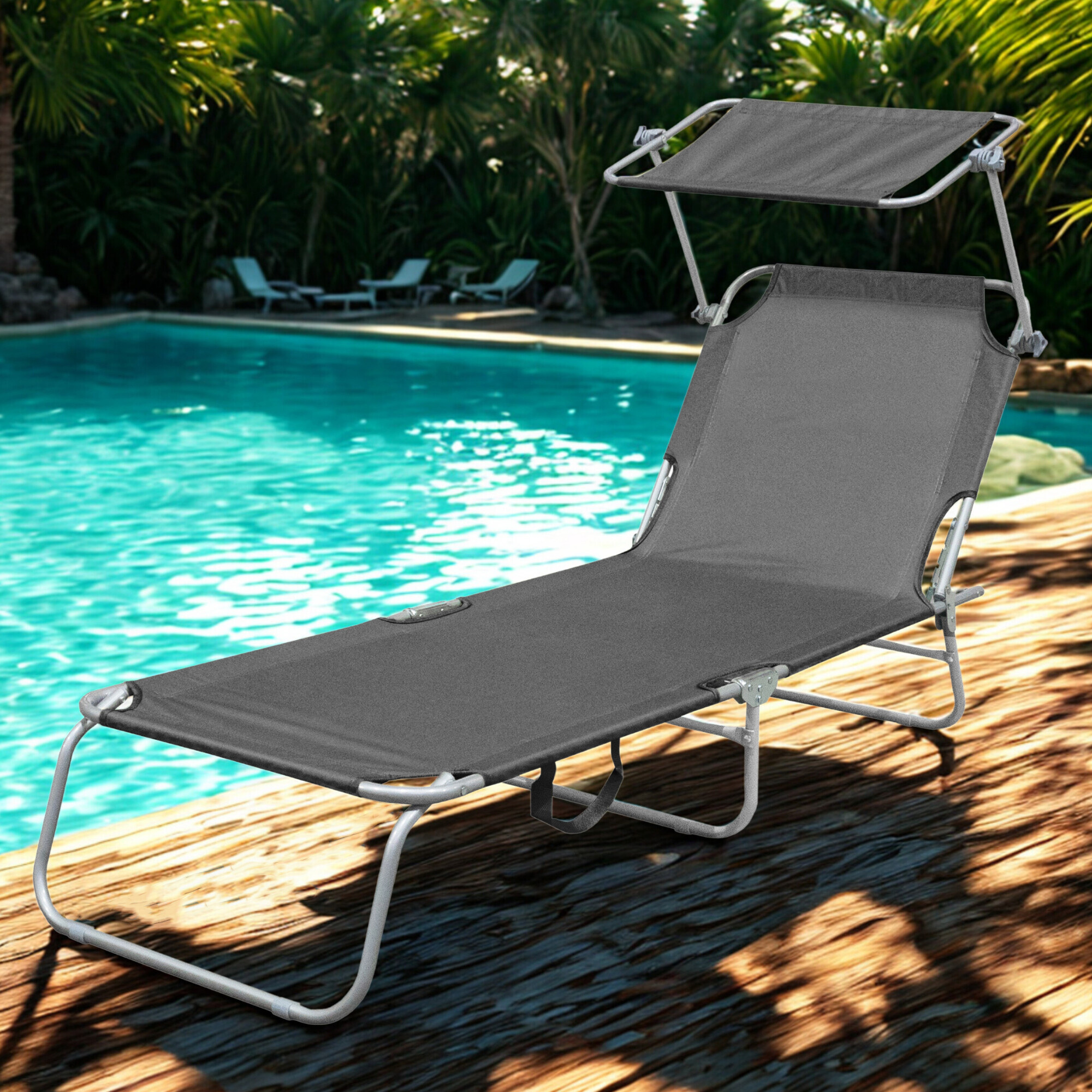 Skladacie záhradné lehátko so spevnenou oceľovou konštrukciou, v modernom dizajne, vhodné pre záhrady, na kempovanie či pláže.