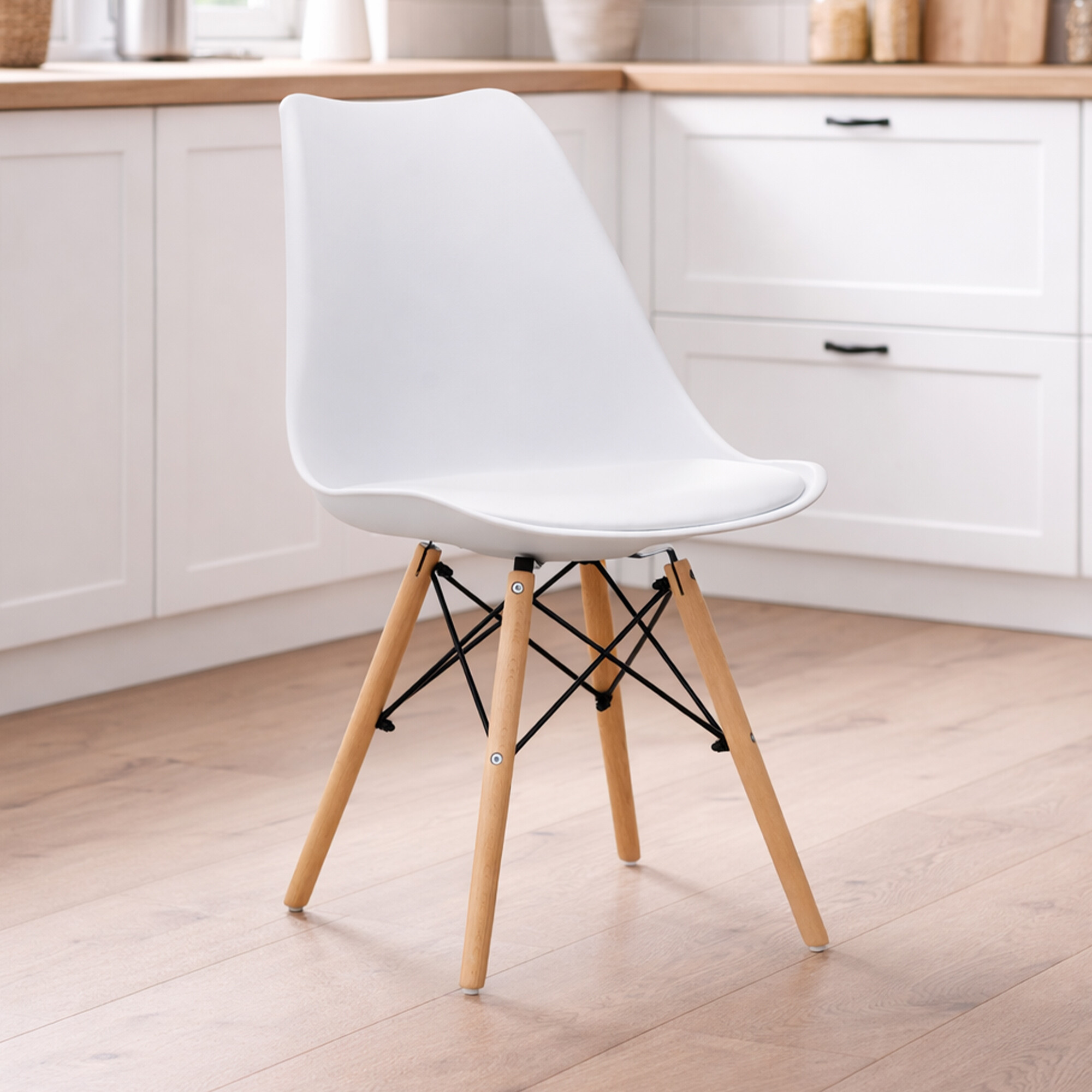 Stolička je vyrobená z kvalitného a odolného polypropylénu s vankúšom v poťahu z umelej kože v kombinácii s podnožou z bukového dreva.