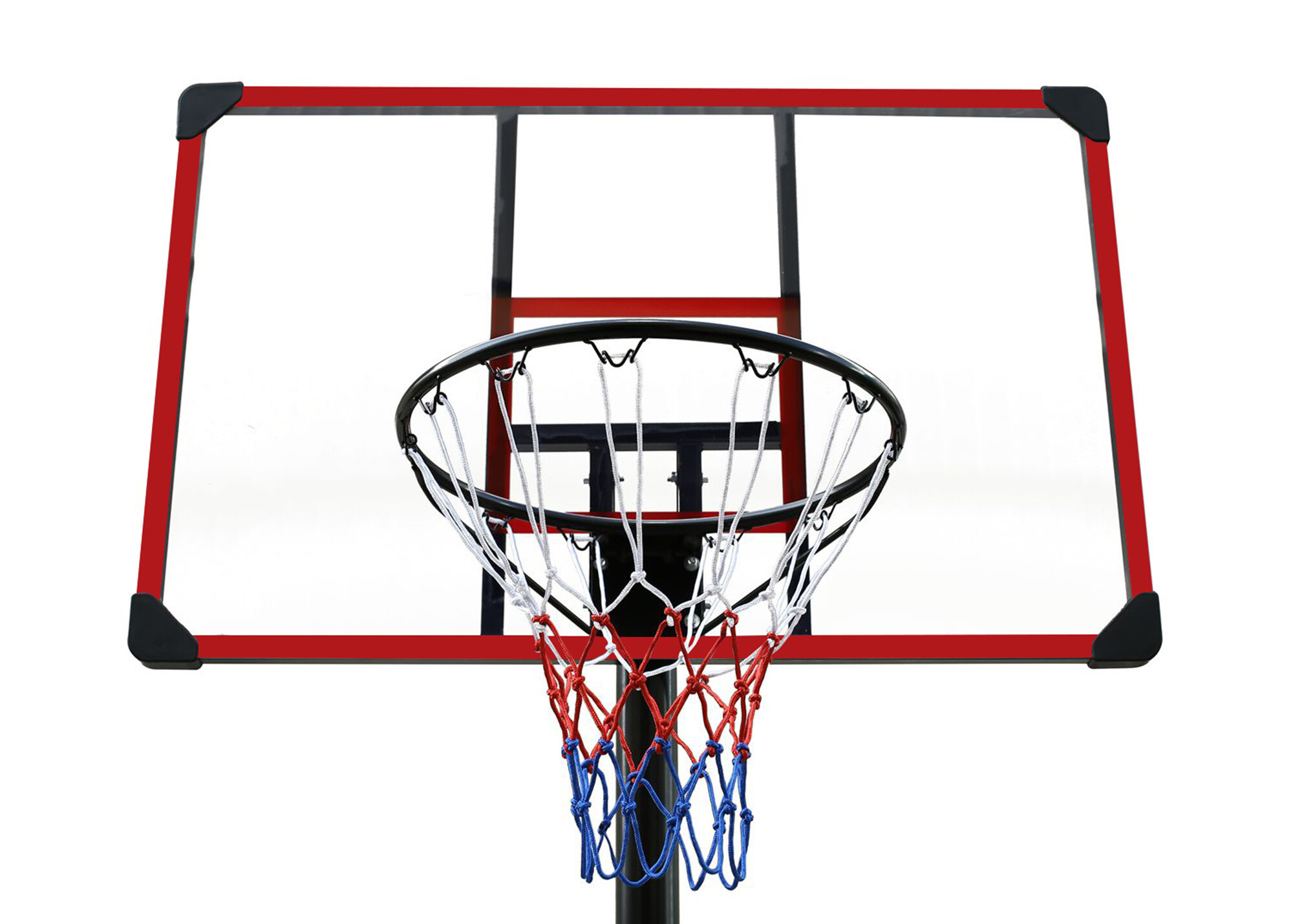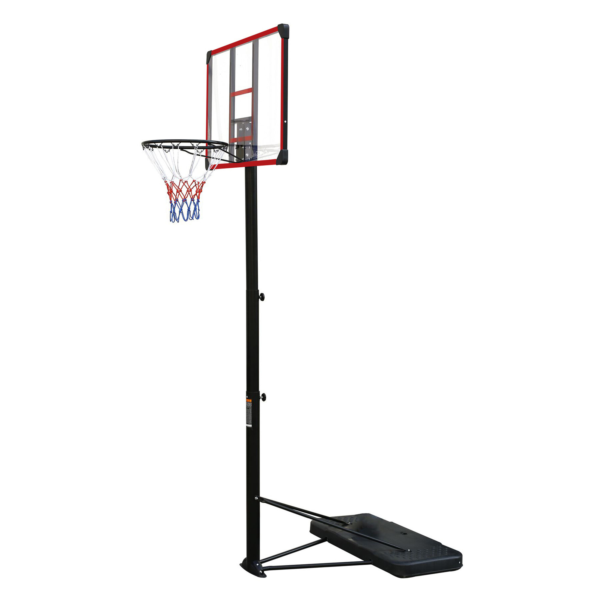 Mobilný basketbalový kôš s nastaviteľnou výškou, pevnou plastovou doskou a obručou so sieťou.