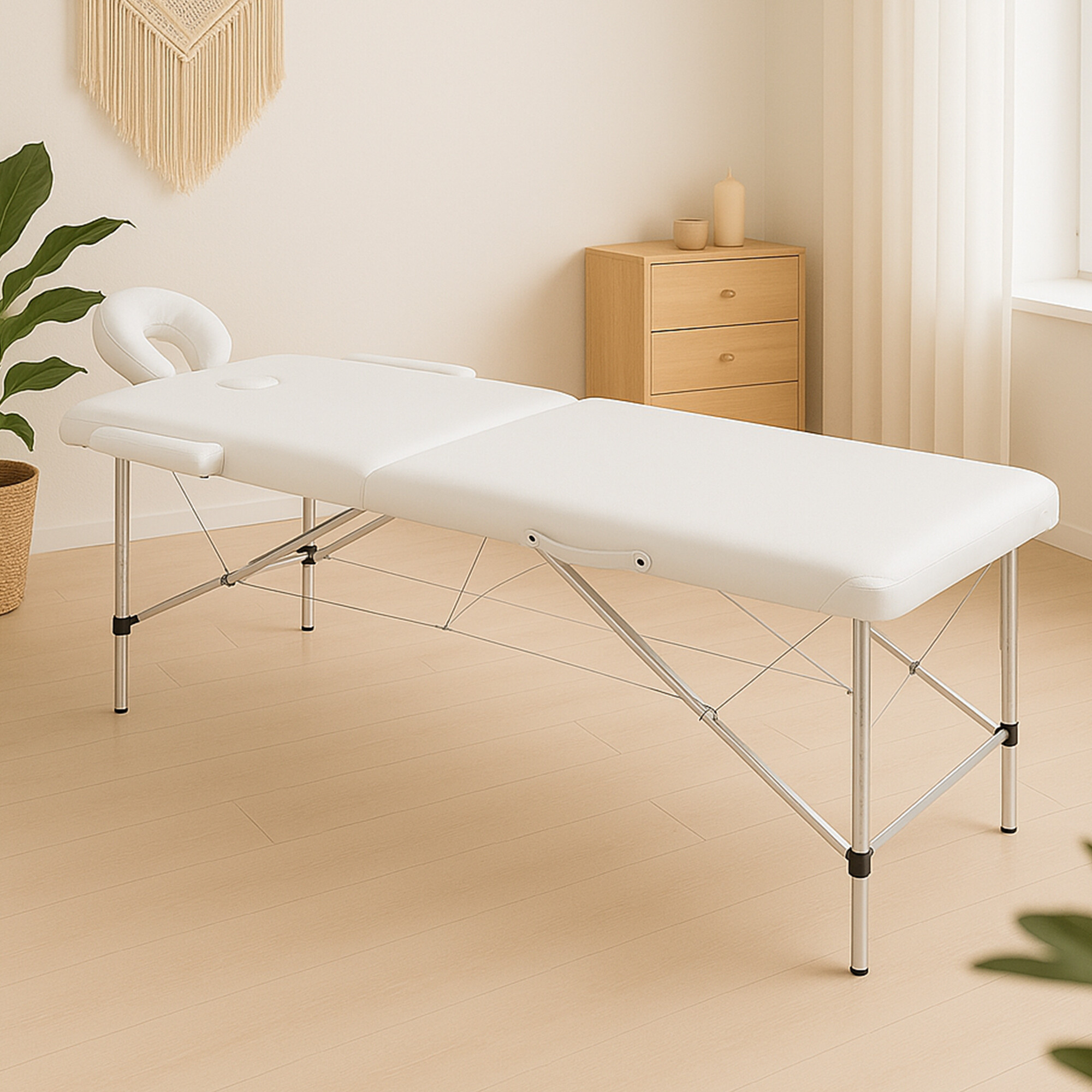Veľmi pohodlné prenosné dvojdielne masážne lehátko s opierkou hlavy, otvorom na tvár, lakťovými opierkami.