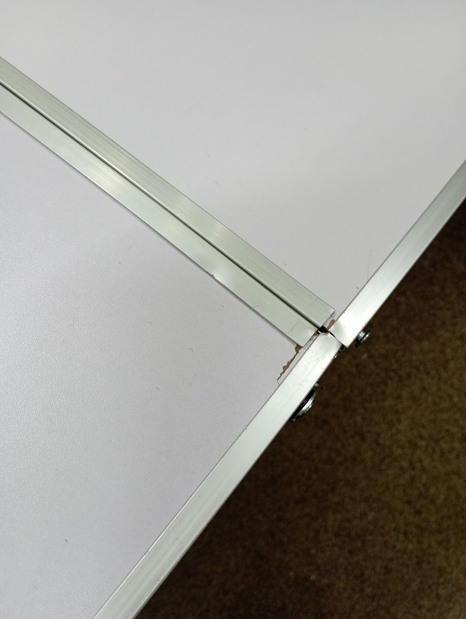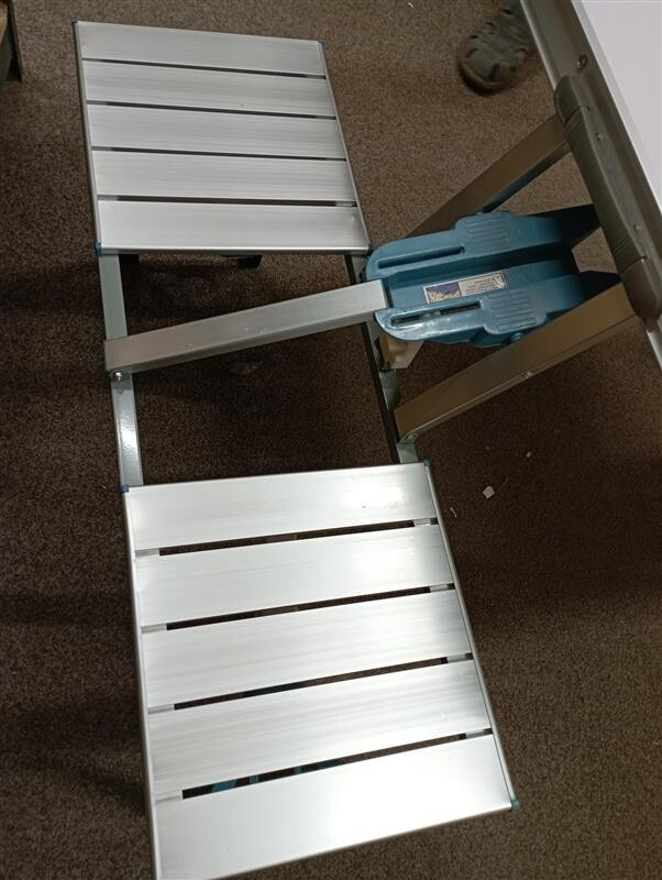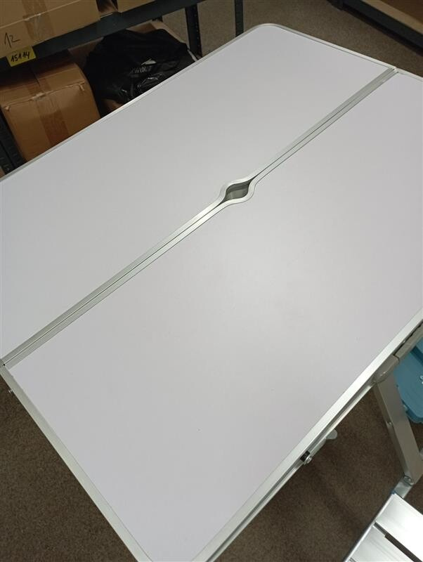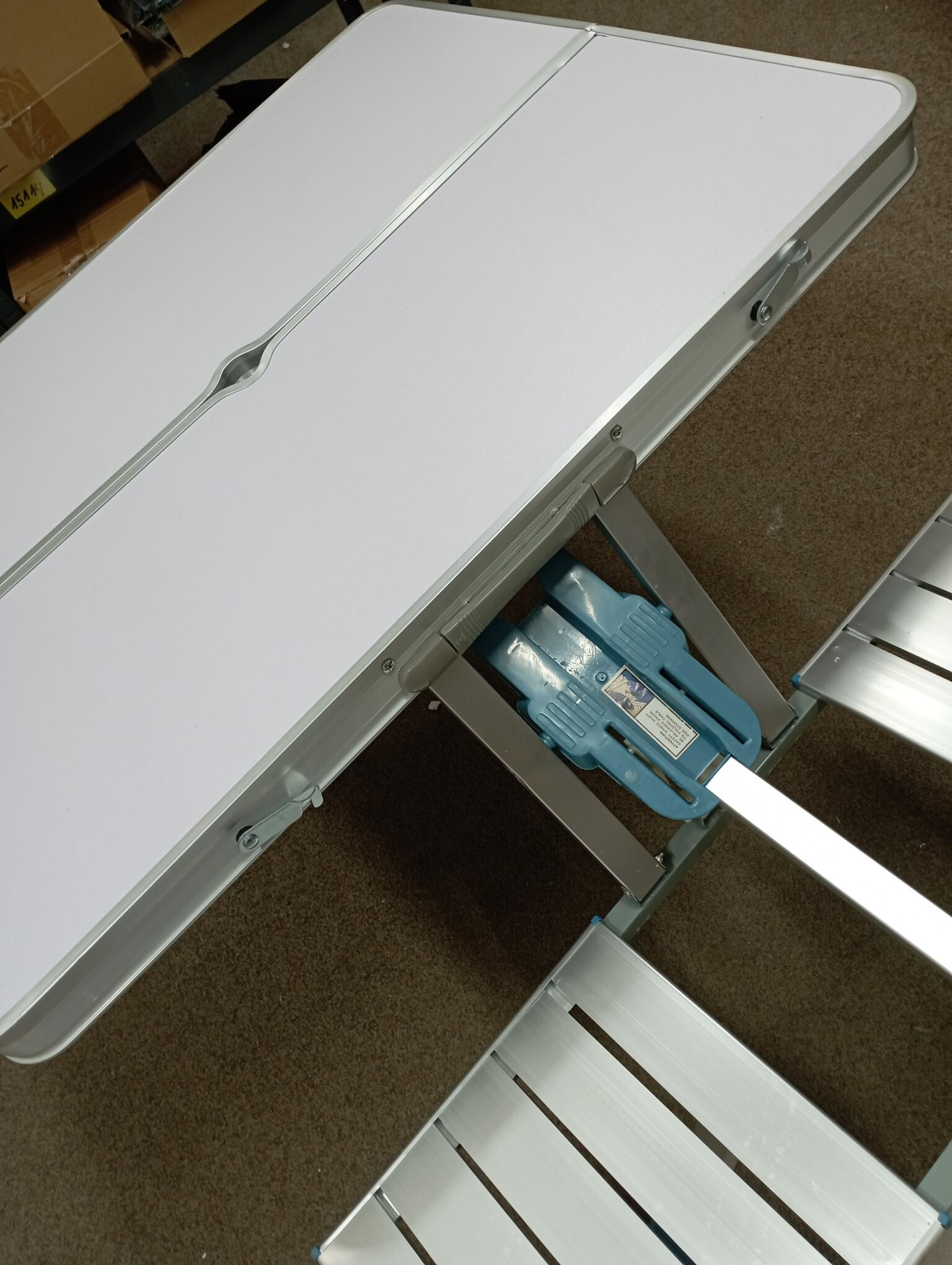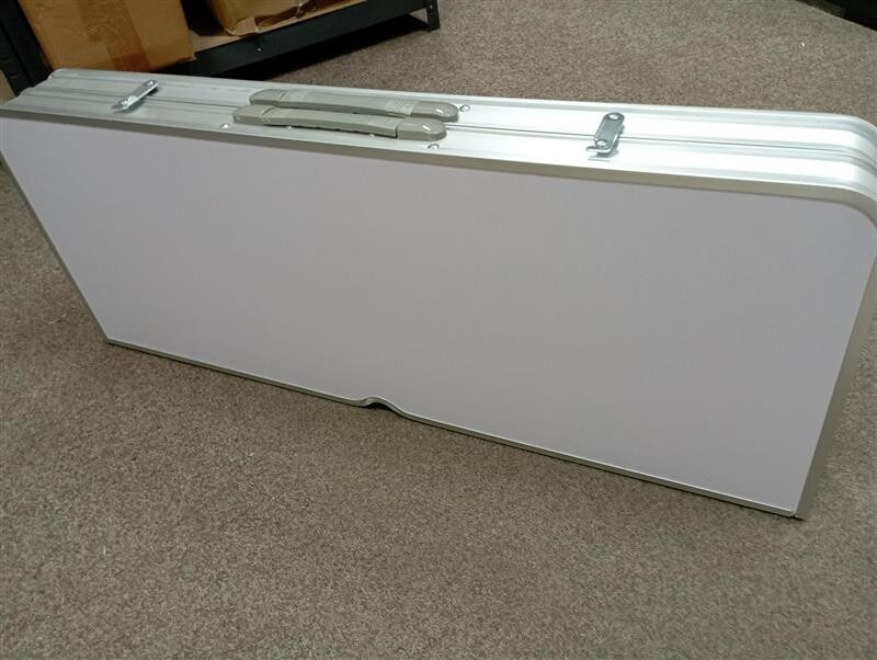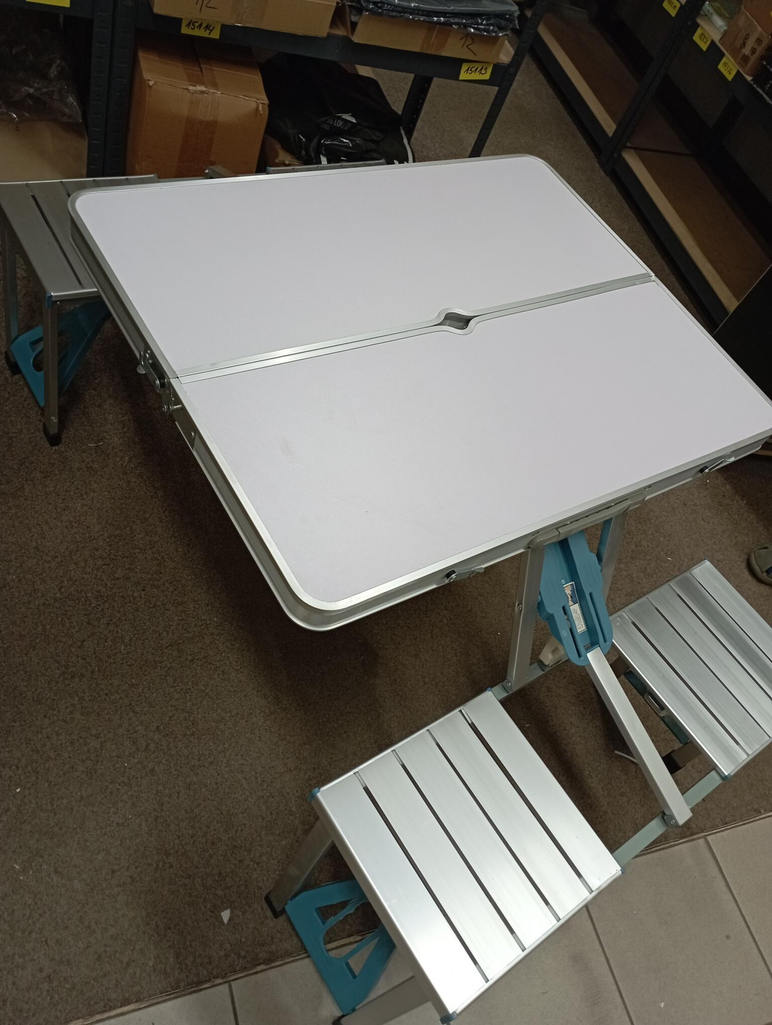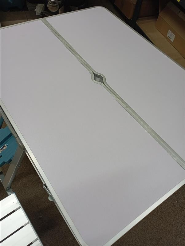Tento set bol rozbalený a nesie drobné známky manipulácie. Stôl má na bočnej strane odretú farbu a hliníkový okraj je mierne skrivený (viď fotografia).