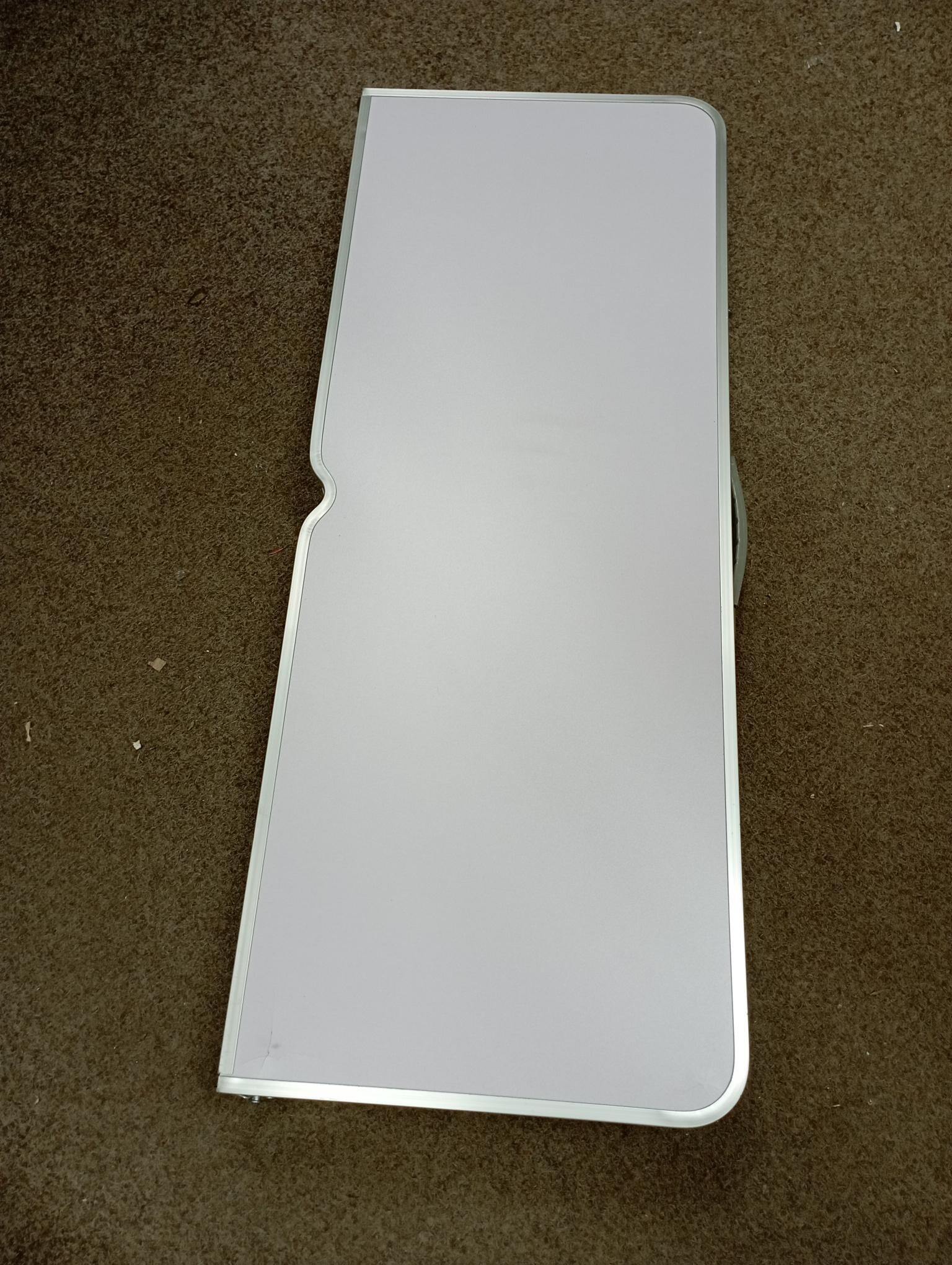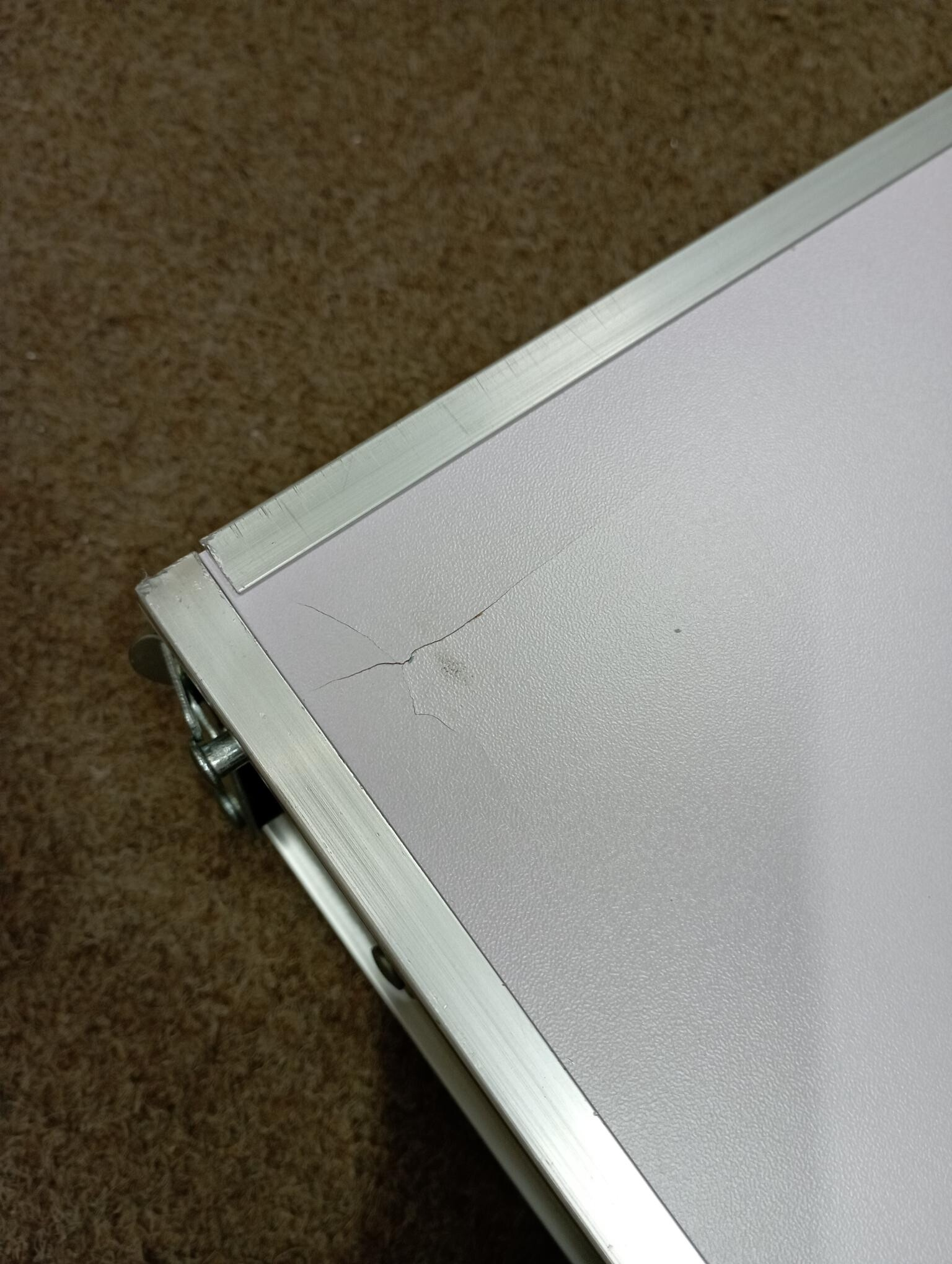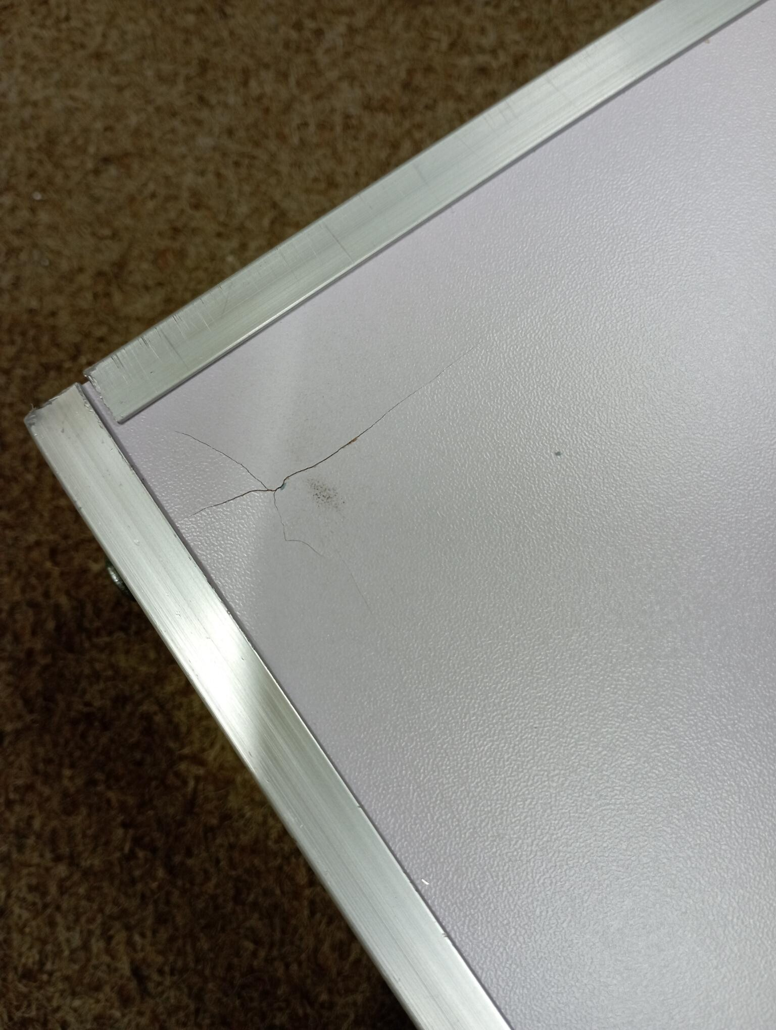 Stôl je kompletný a plne funkčný. Plocha stola je v jednom rohu prasknutá, povrch je mierne odretý a zaprášený.