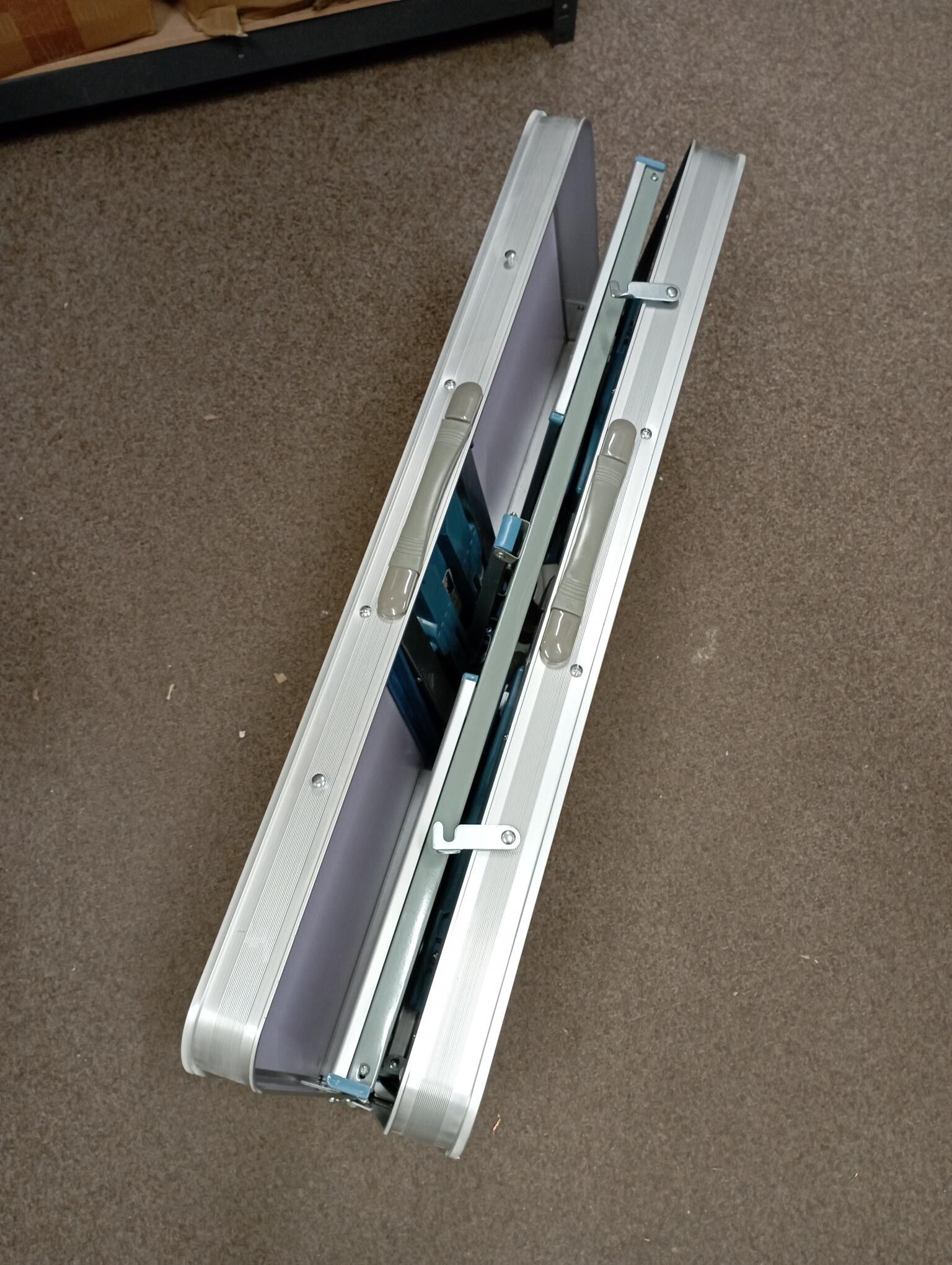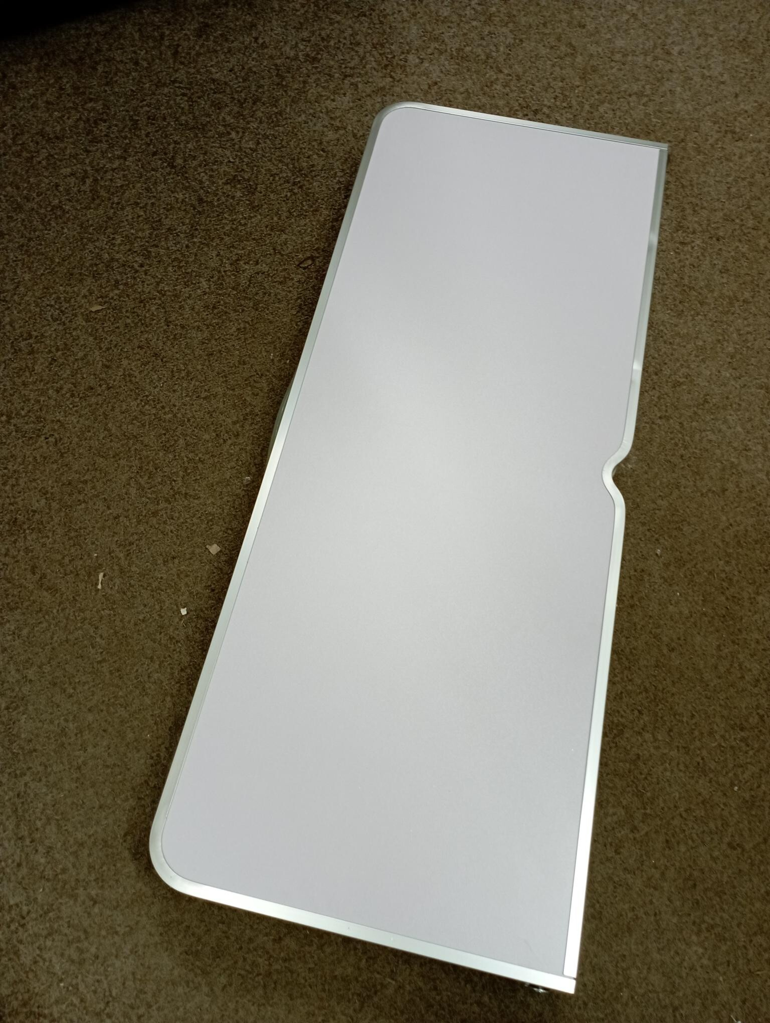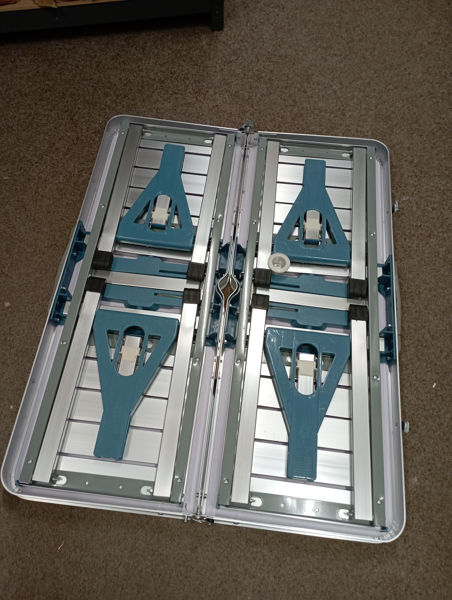 Stôl je kompletný a plne funkčný. Plocha stola je v jednom rohu prasknutá, povrch je mierne odretý a zaprášený.