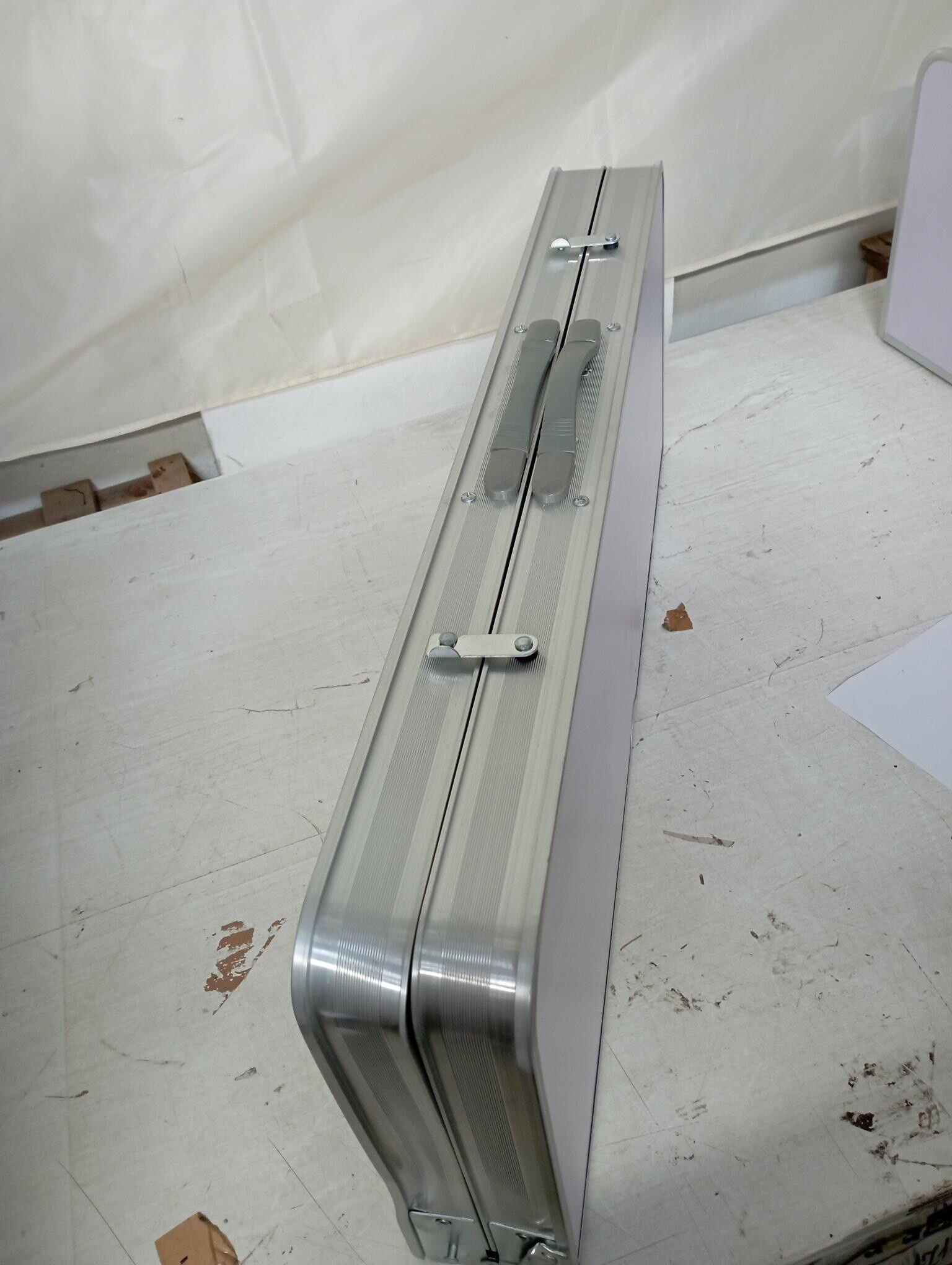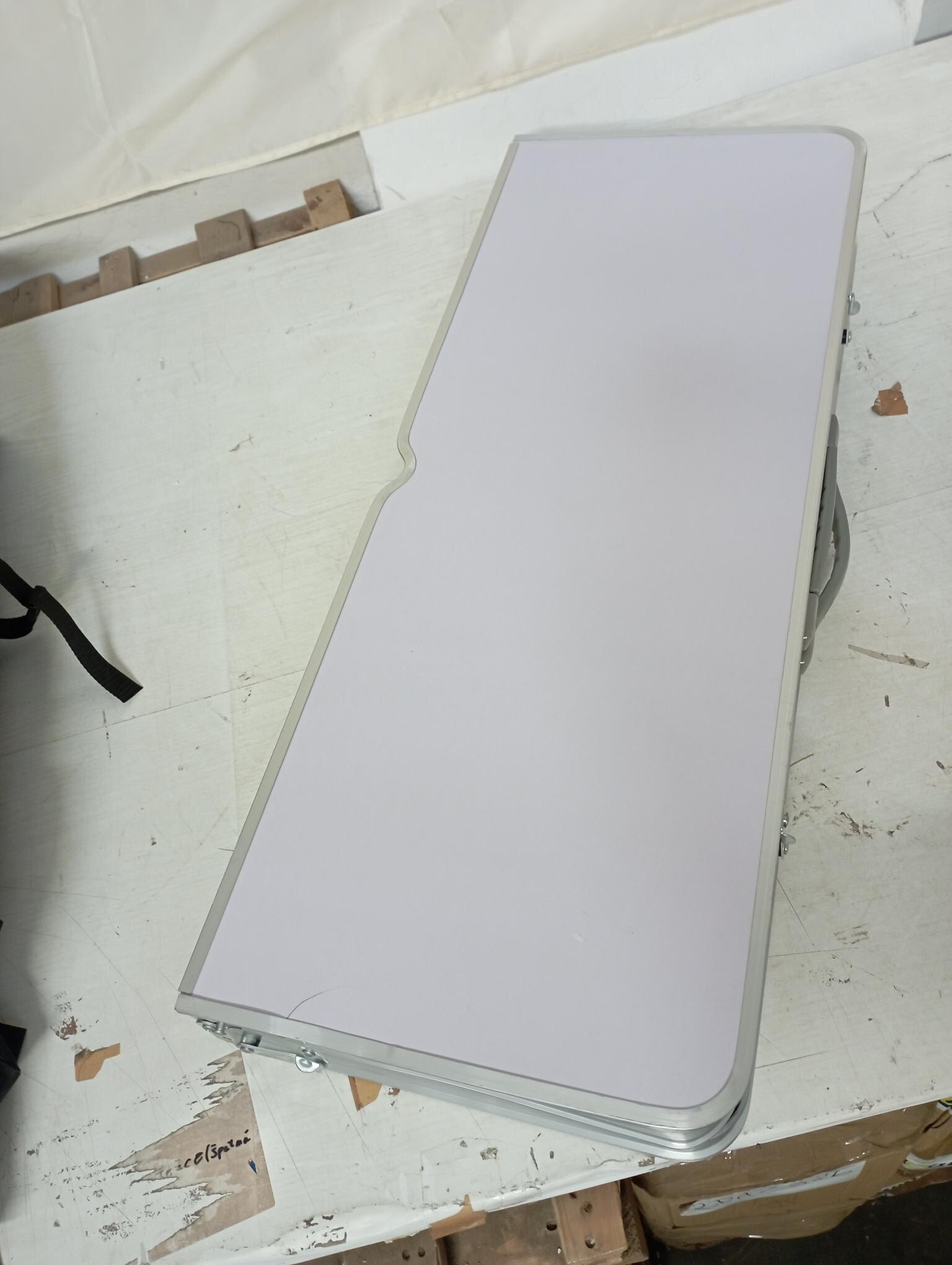 Kempingový set je kompletný a plne funkčný. Jedálenská plocha stola má prasklinu, ktorá však nemá vplyv na stabilitu ani využitie. Povrch je navyše mierne znečistený z uskladnenia.