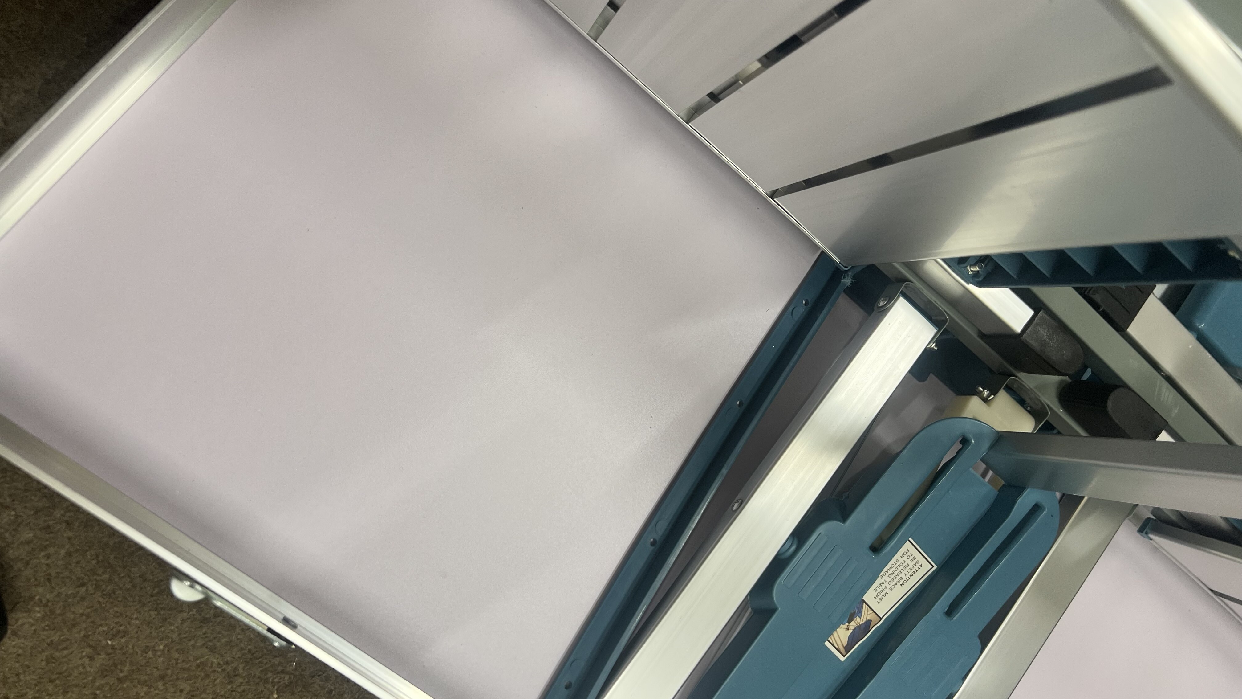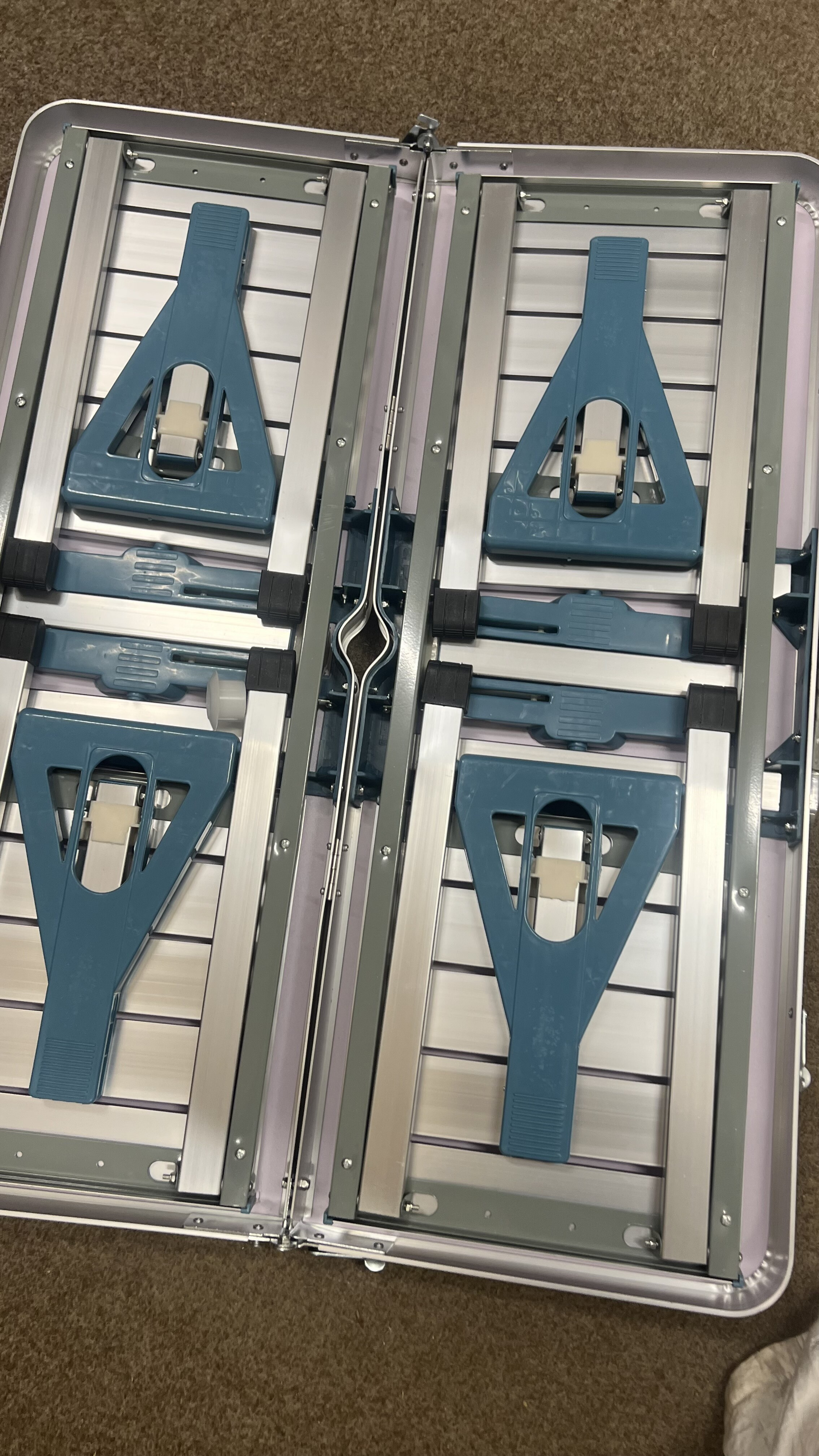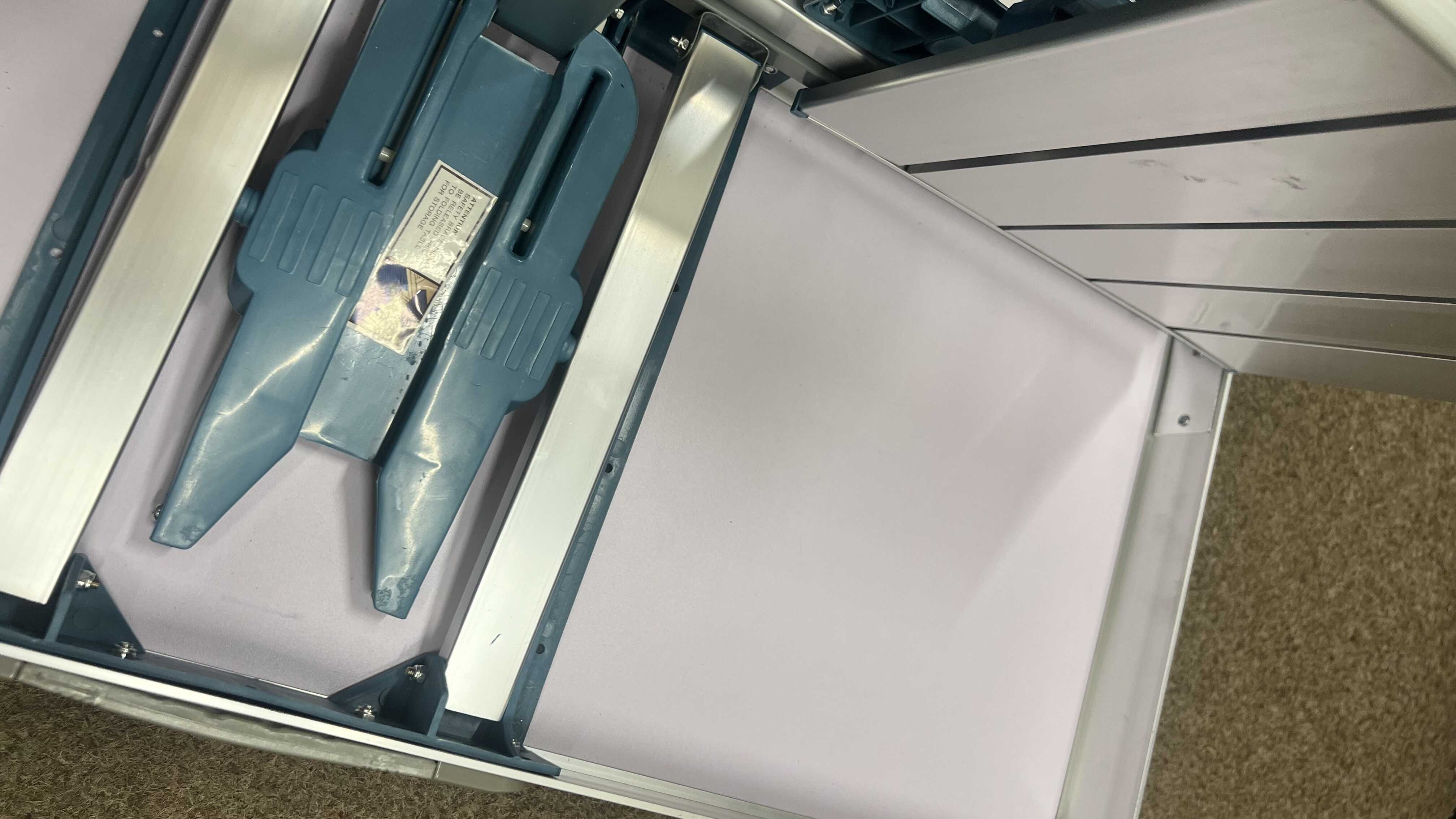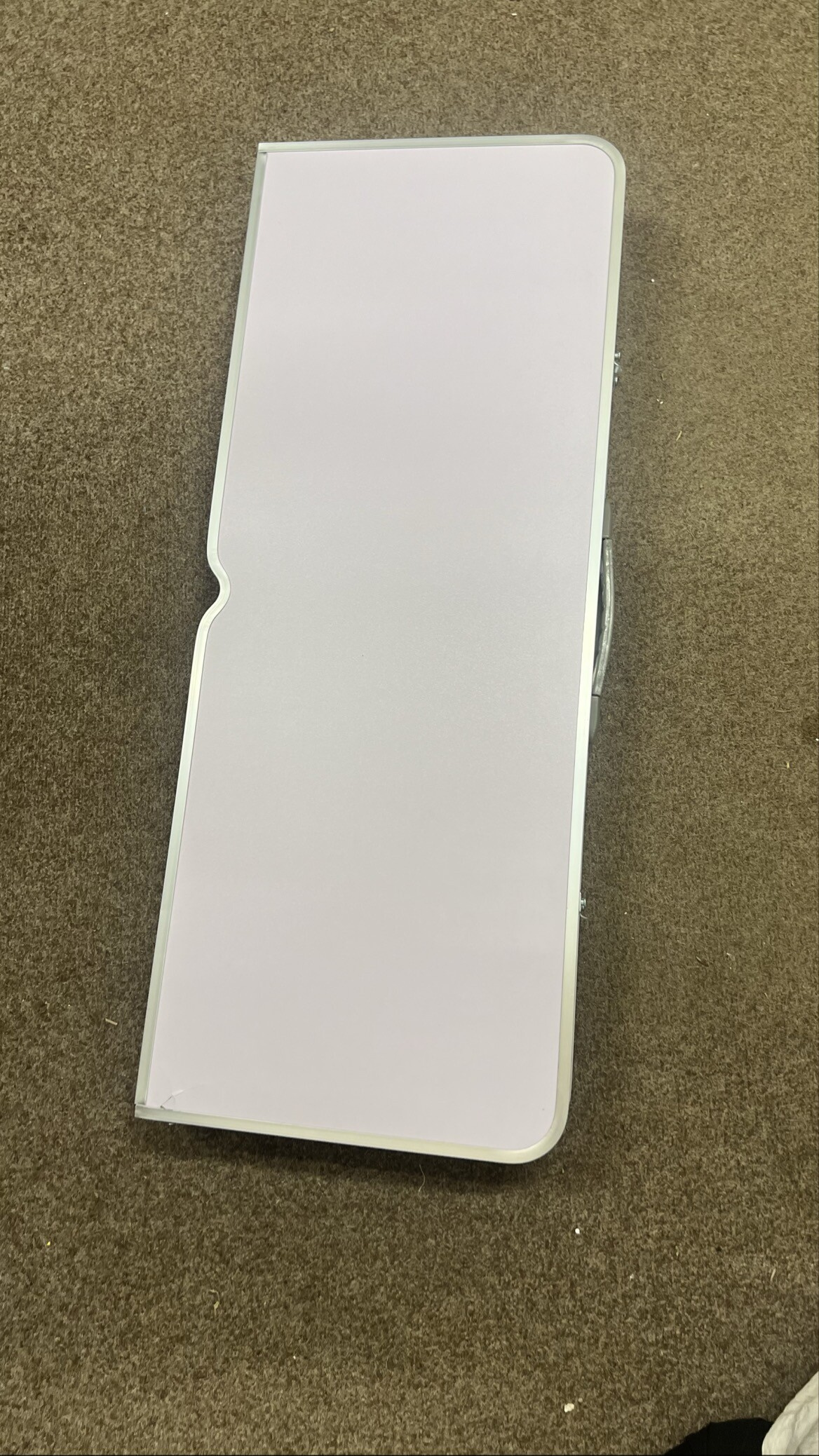 Kempingový skladací set je kompletný a plne funkčný. Vada spočíva v prasklinách na doske v dvoch rohoch, povrch je navyše miestami ľahko odretý a zaprášený.