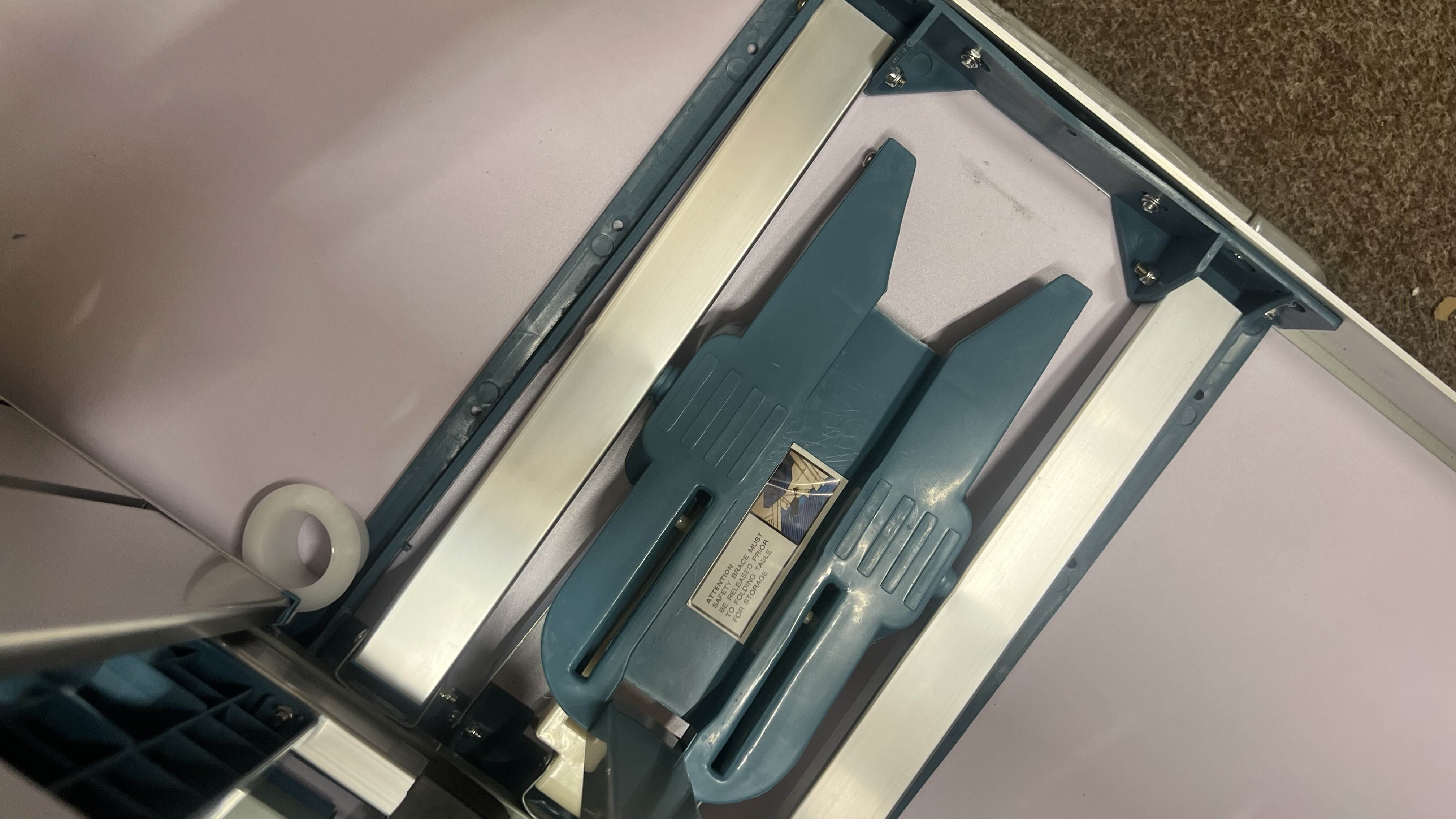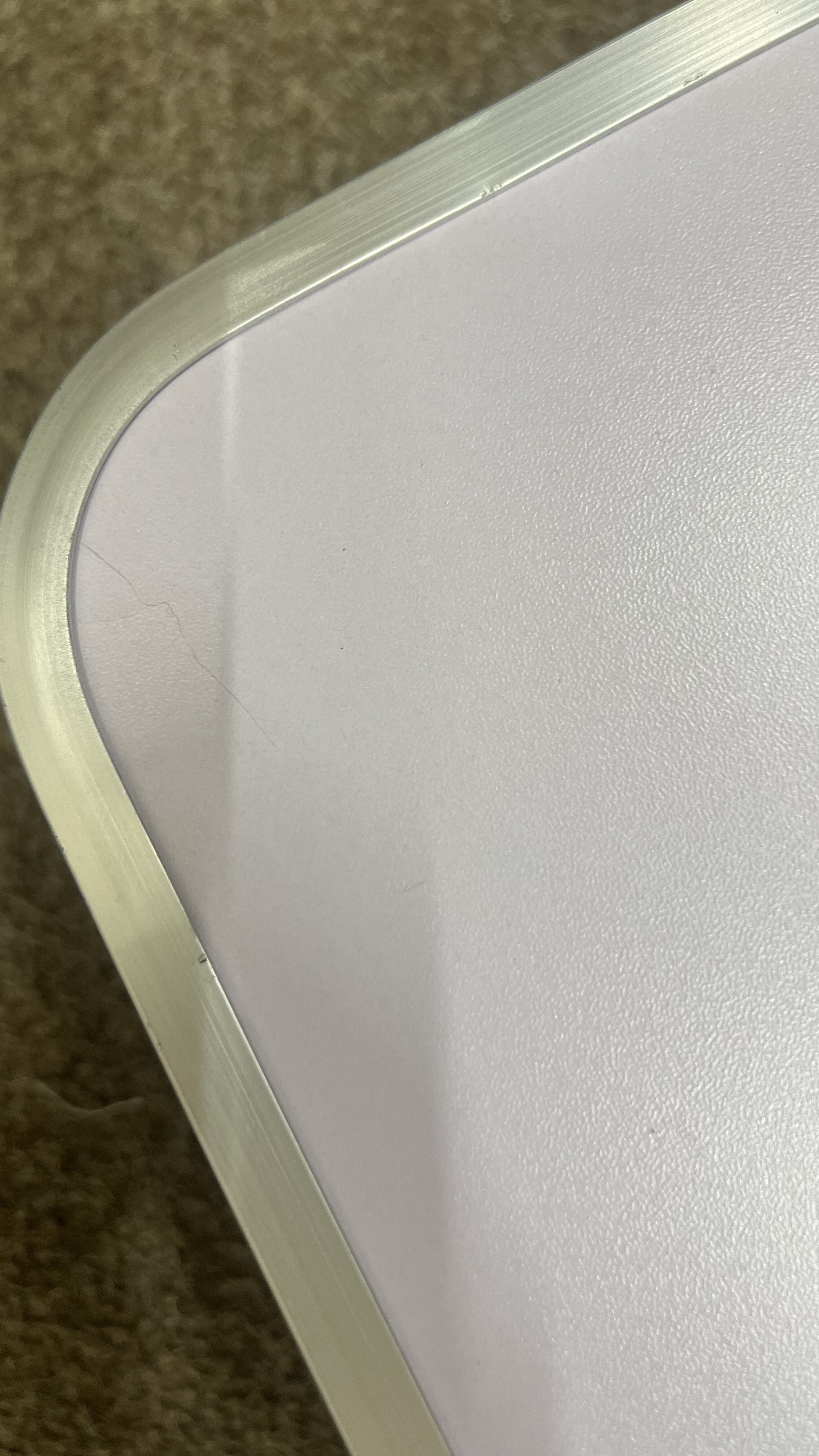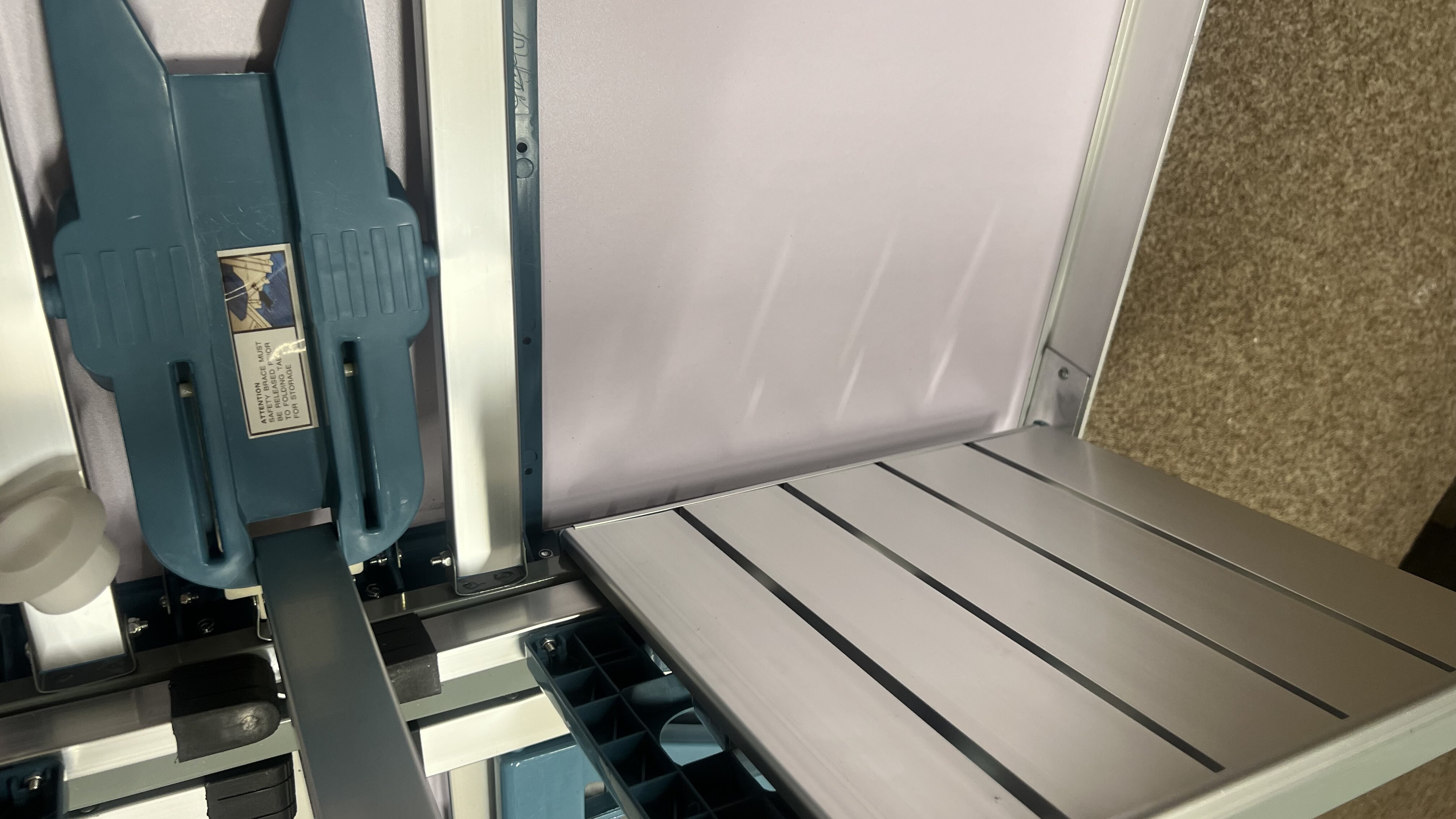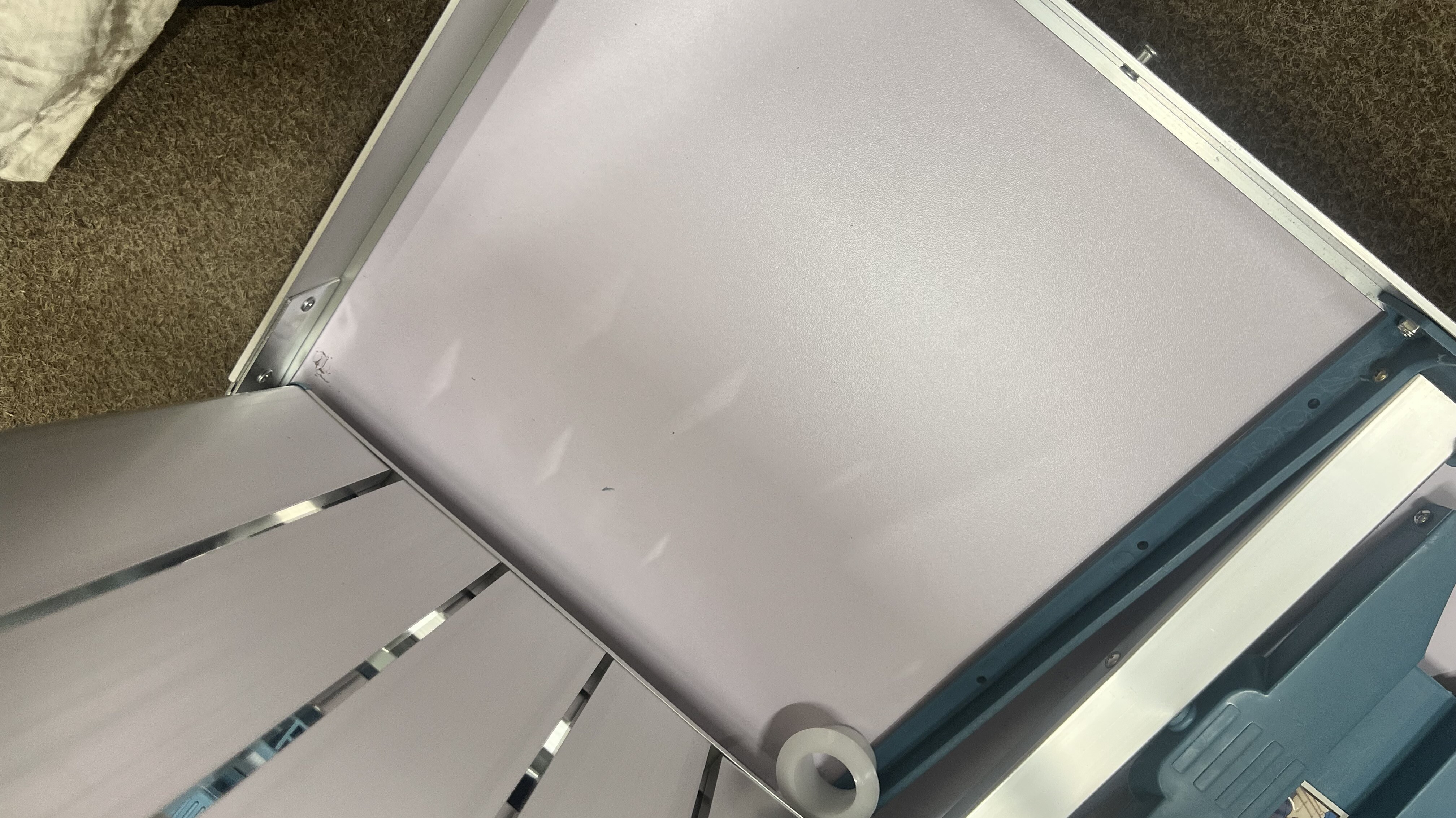 Kempingový skladací set je kompletný a plne funkčný. Vada spočíva v prasklinách na doske v dvoch rohoch, povrch je navyše miestami ľahko odretý a zaprášený.