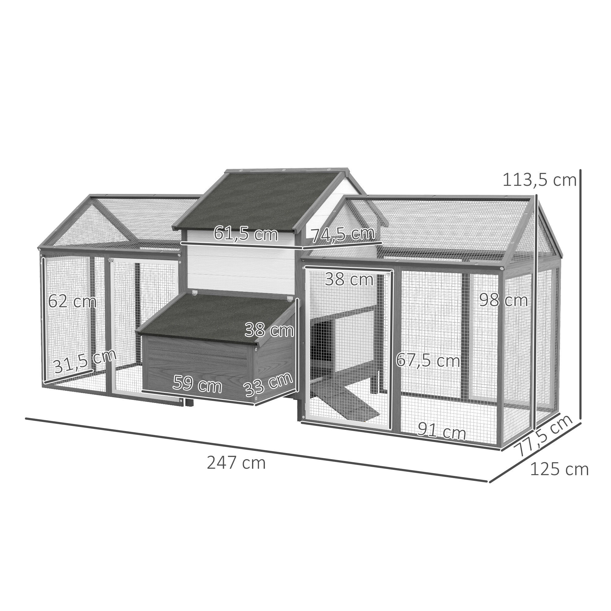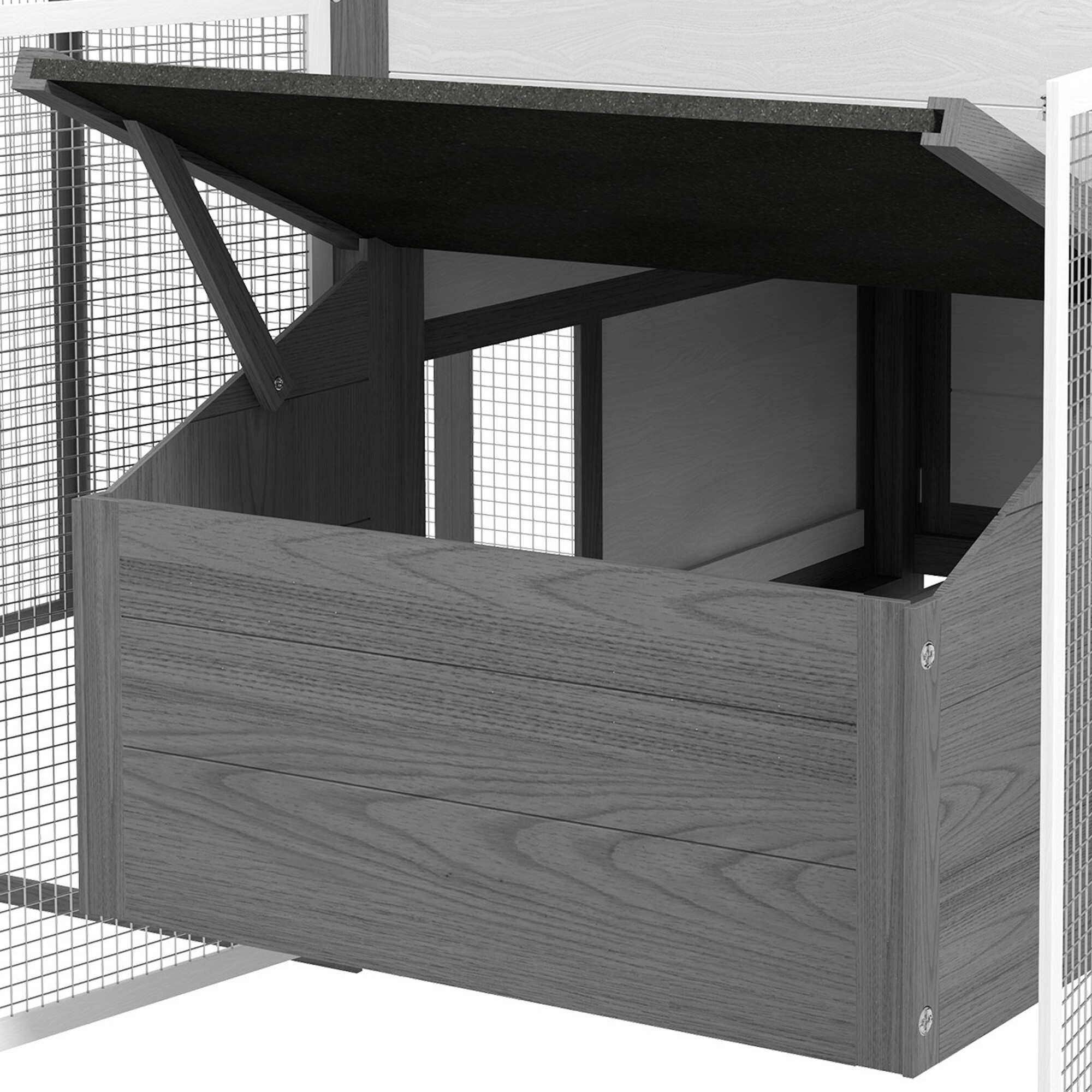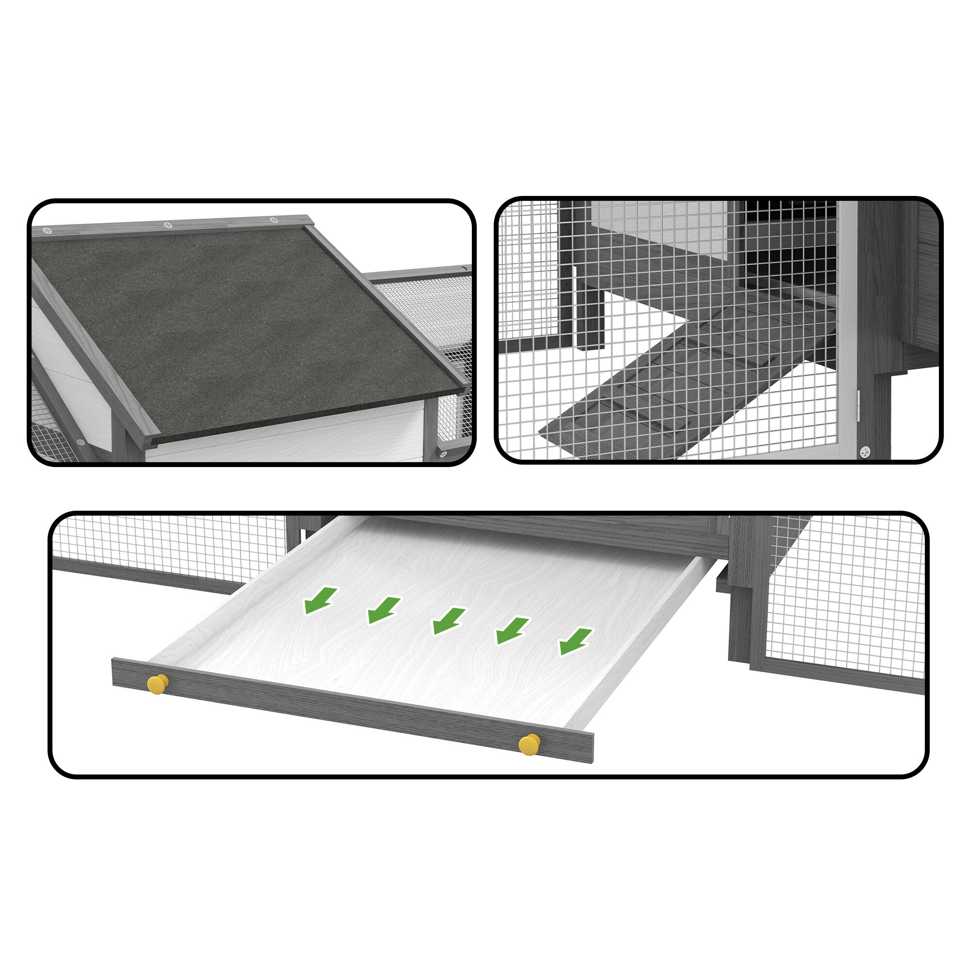 Strecha kurníka je vodeodolná a je vyrobená z materiálu odolného voči UV žiareniu.Bidlo je navrhnuté tak, aby bolo dostatočne vysoko a sliepky tak mali zodpovedajúci priestor na odpočinok.