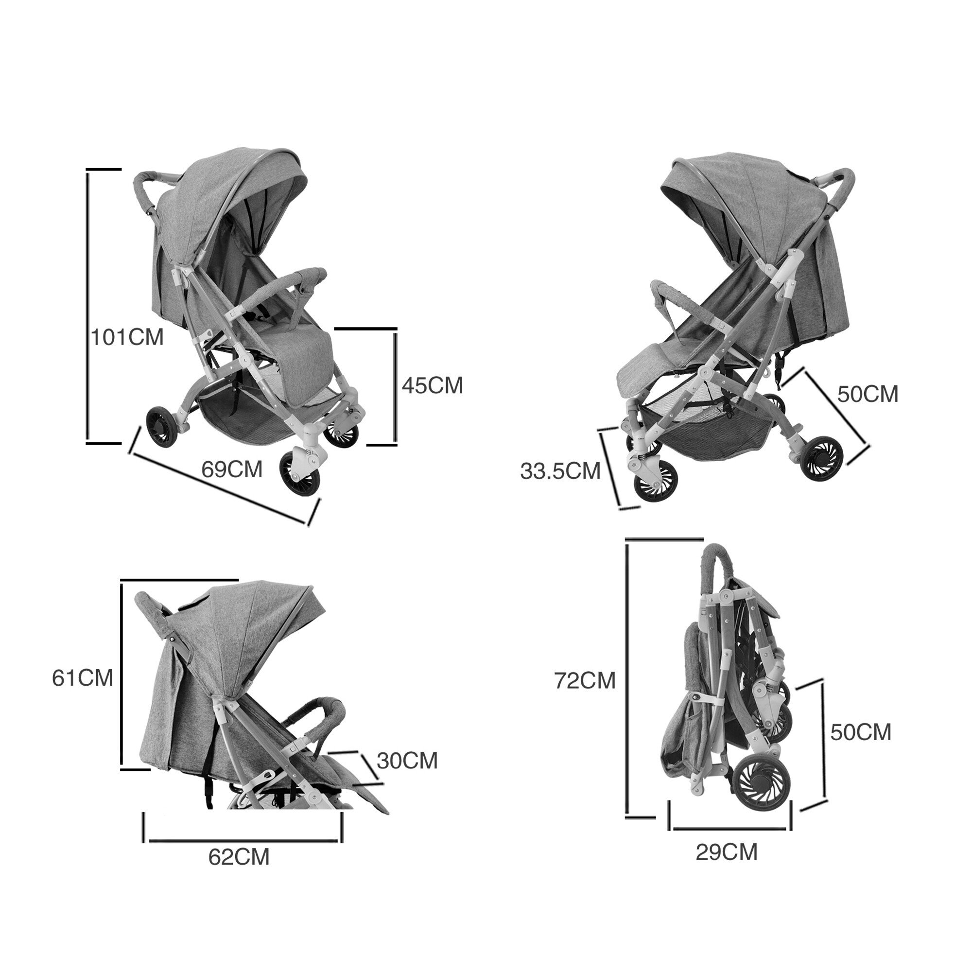 • Rozmery rozloženého kočíka: 101 x 50 x 69 cm