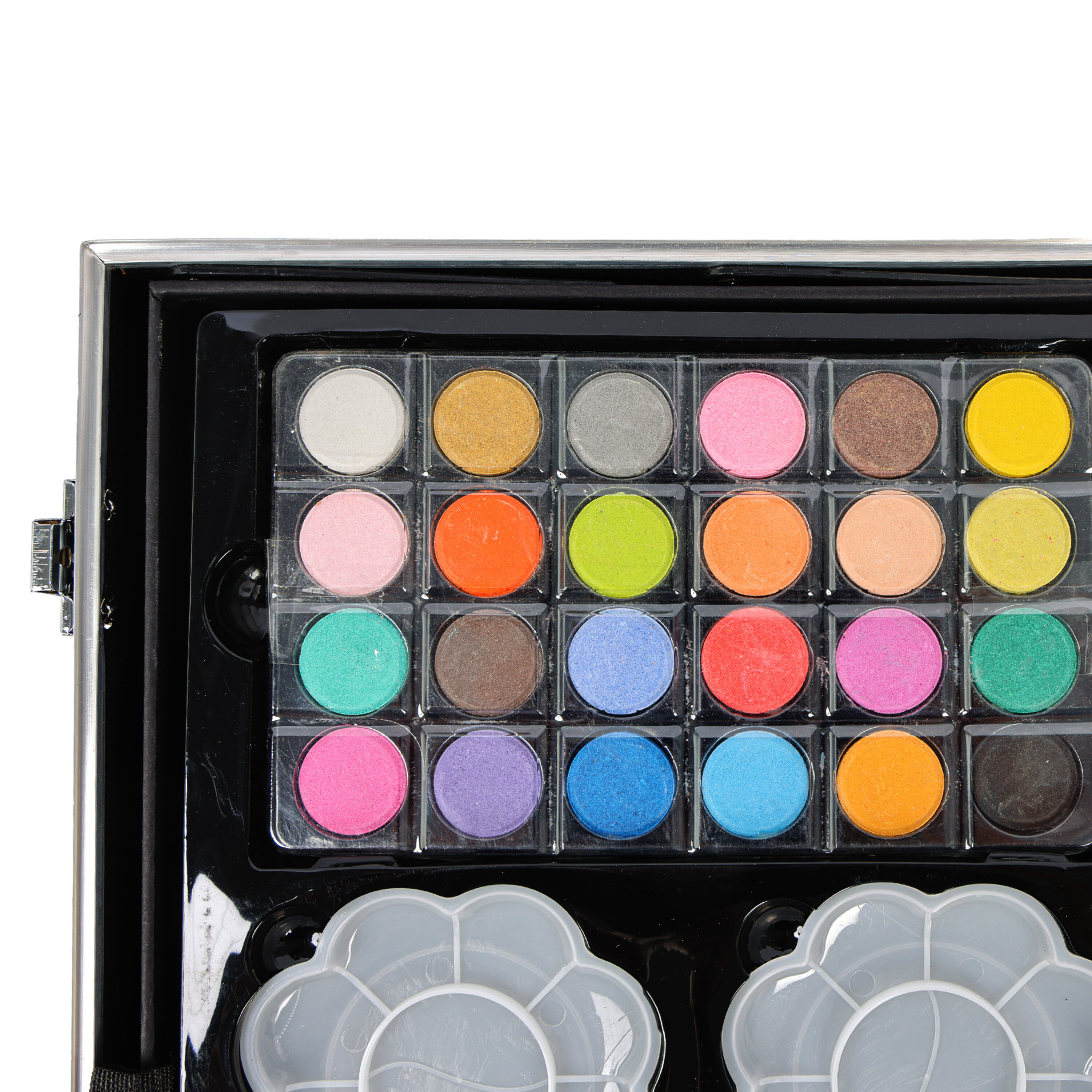 24 akvarelových farieb, 24 temperových farieb, 24 voskových pastelov, 28 pasteliek, 33 fixiek, 2 ceruzky, 2 gumy, 2 poháriky, 4 štetce, orezávač.