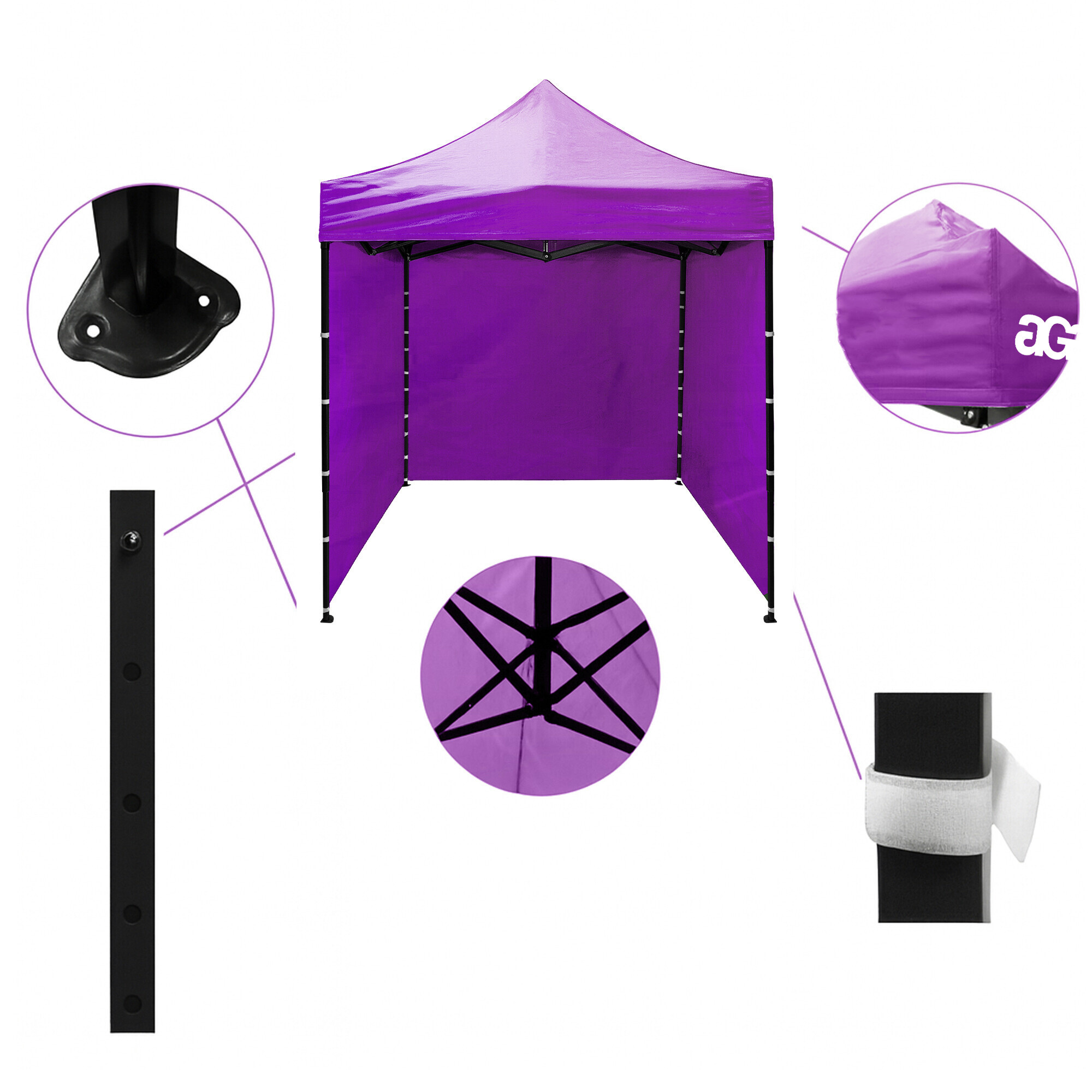 Strecha z 420D PU Oxfordu a bočnice z PVC Oxford 210D poskytujú ochranu pred vetrom aj dažďom a zároveň vytvárajú reprezentatívne zázemie pre predajcov aj zákazníkov. Vďaka praktickému suchému zipsu možno bočnice rýchlo zložiť alebo znovu upevniť.