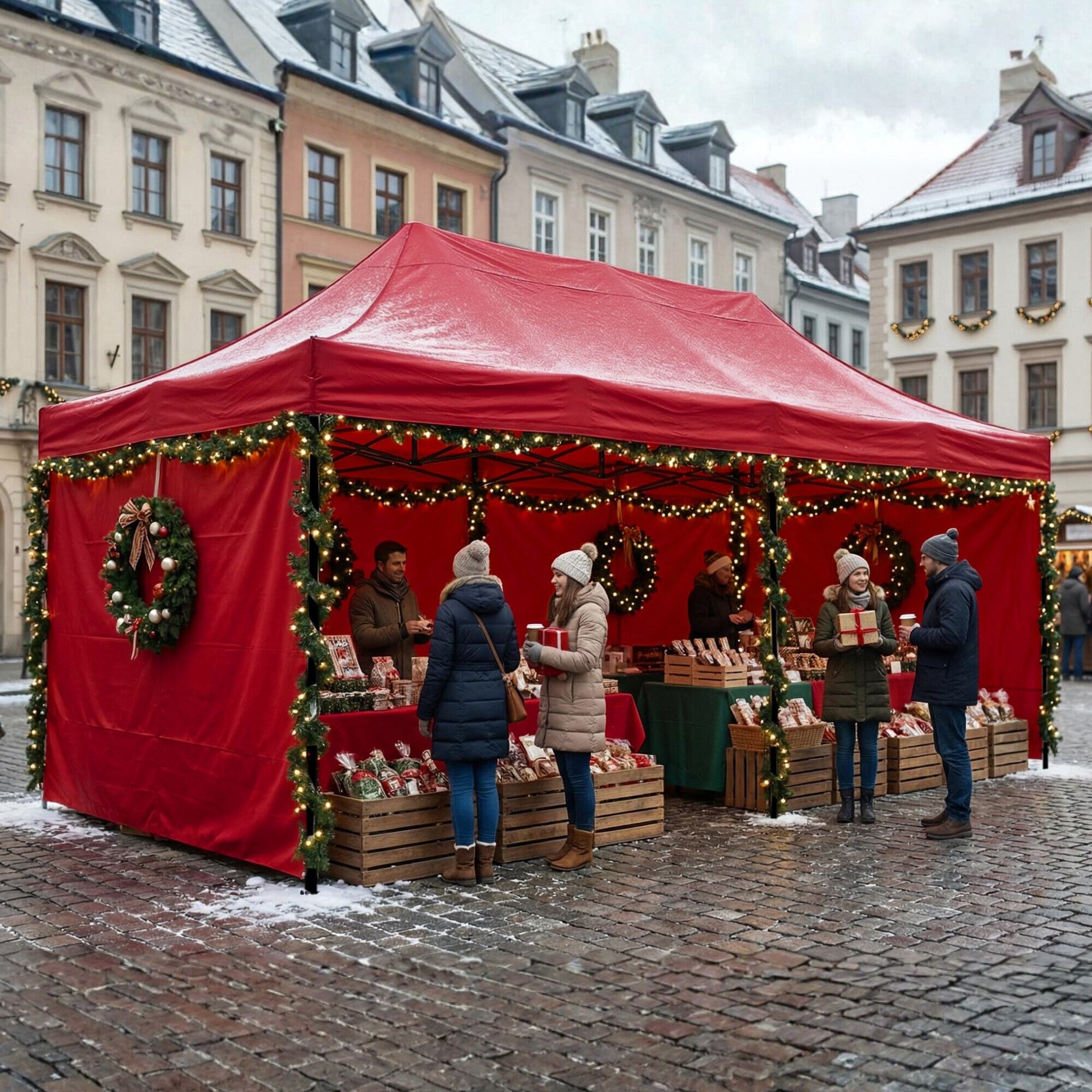 Nevystavujte stánok búrke, silnému vetru, alebo víchrici. V tomto počasí sa odporúča aspoň zložiť bočné steny, ale ideálne je, celý stánok zložiť a schovať.