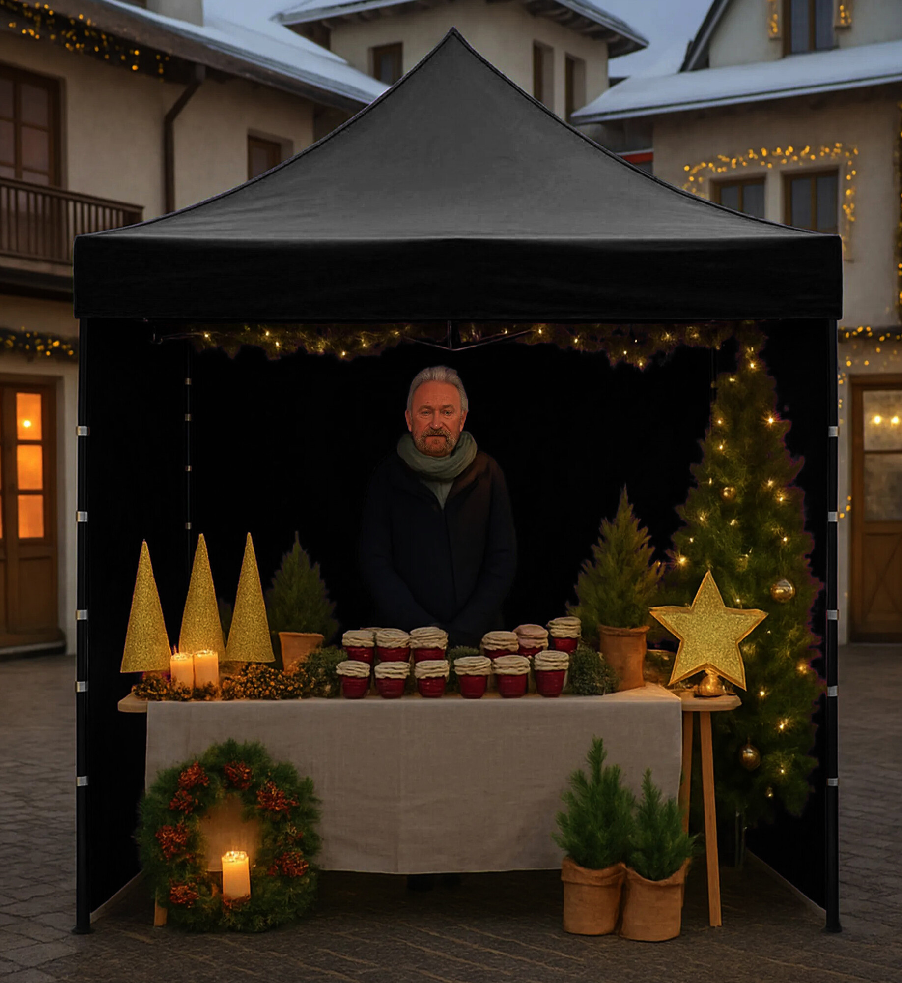 Predajný stánok 3×3 m s pevnou nožnicovou oceľovou konštrukciou patrí k najvyhľadávanejším modelom. Poskytuje dostatok priestoru pre predaj aj prezentáciu a zároveň sa ľahko prenáša a rýchlo skladá. Využijete ho pri vonkajších aj interiérových akciách od farmárskych trhov cez veľtrhy a výstavy až po promo akcie a firemné eventy.