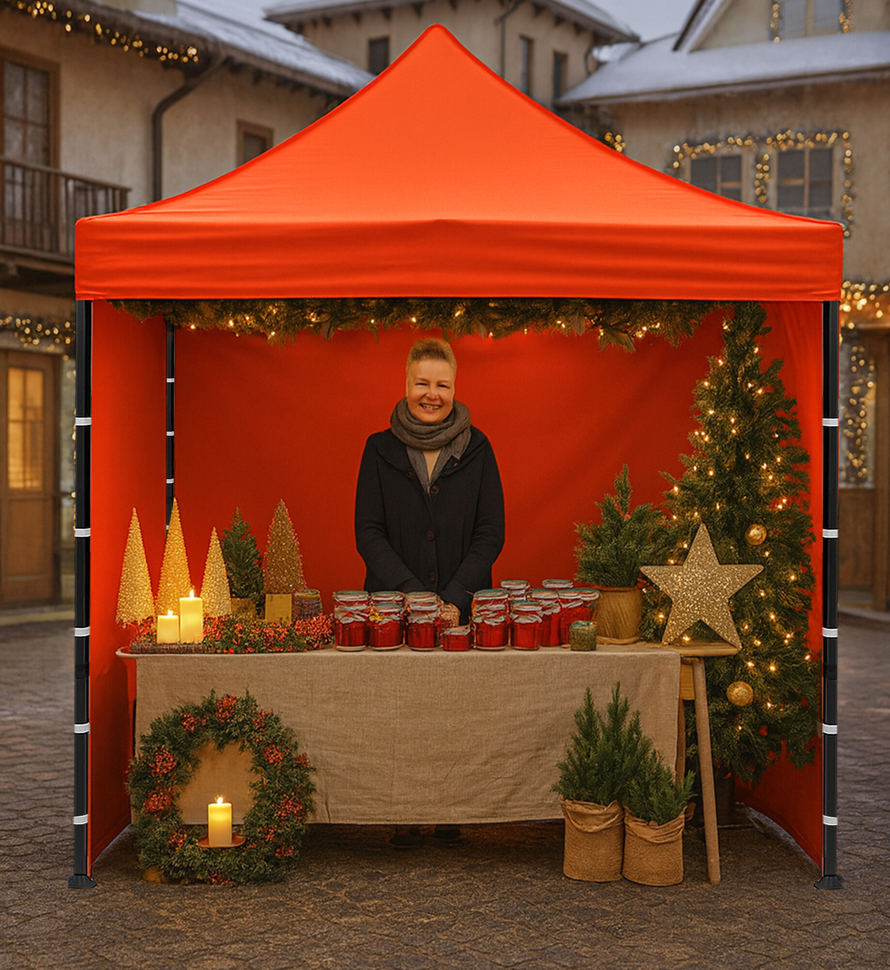 Strecha z 420D PU Oxfordu a bočnice z PVC Oxford 210D poskytujú ochranu pred vetrom aj dažďom a zároveň vytvárajú reprezentatívne zázemie pre predajcov aj zákazníkov. Vďaka praktickému suchému zipsu možno bočnice rýchlo zložiť alebo znovu upevniť.