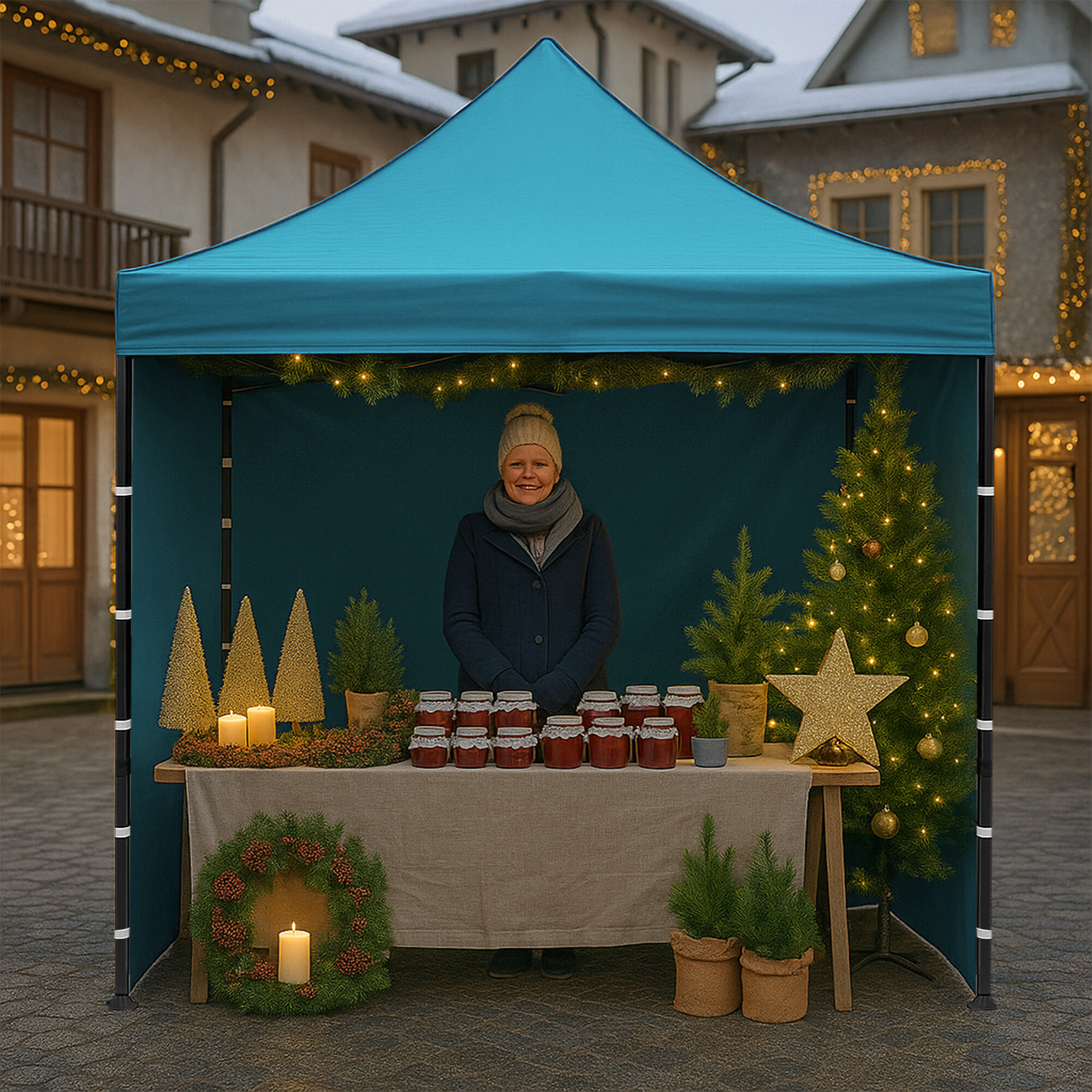 Strecha z 420D PU Oxfordu a bočnice z PVC Oxford 210D poskytujú ochranu pred vetrom aj dažďom a zároveň vytvárajú reprezentatívne zázemie pre predajcov aj zákazníkov. Vďaka praktickému suchému zipsu možno bočnice rýchlo zložiť alebo znovu upevniť.