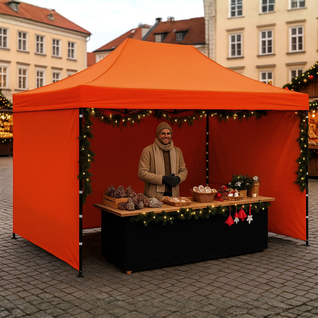 Strecha z odolného 420D PU Oxfordu a bočnice z PVC Oxford 210D poskytujú ochranu proti vetru aj slnku a vytvárajú pohodlné zázemie pre obchodníkov aj návštevníkov. Bočnice je možné kedykoľvek rýchlo zložiť alebo pripevniť vďaka suchým zipsom, takže stánok ľahko prispôsobíte situácii.