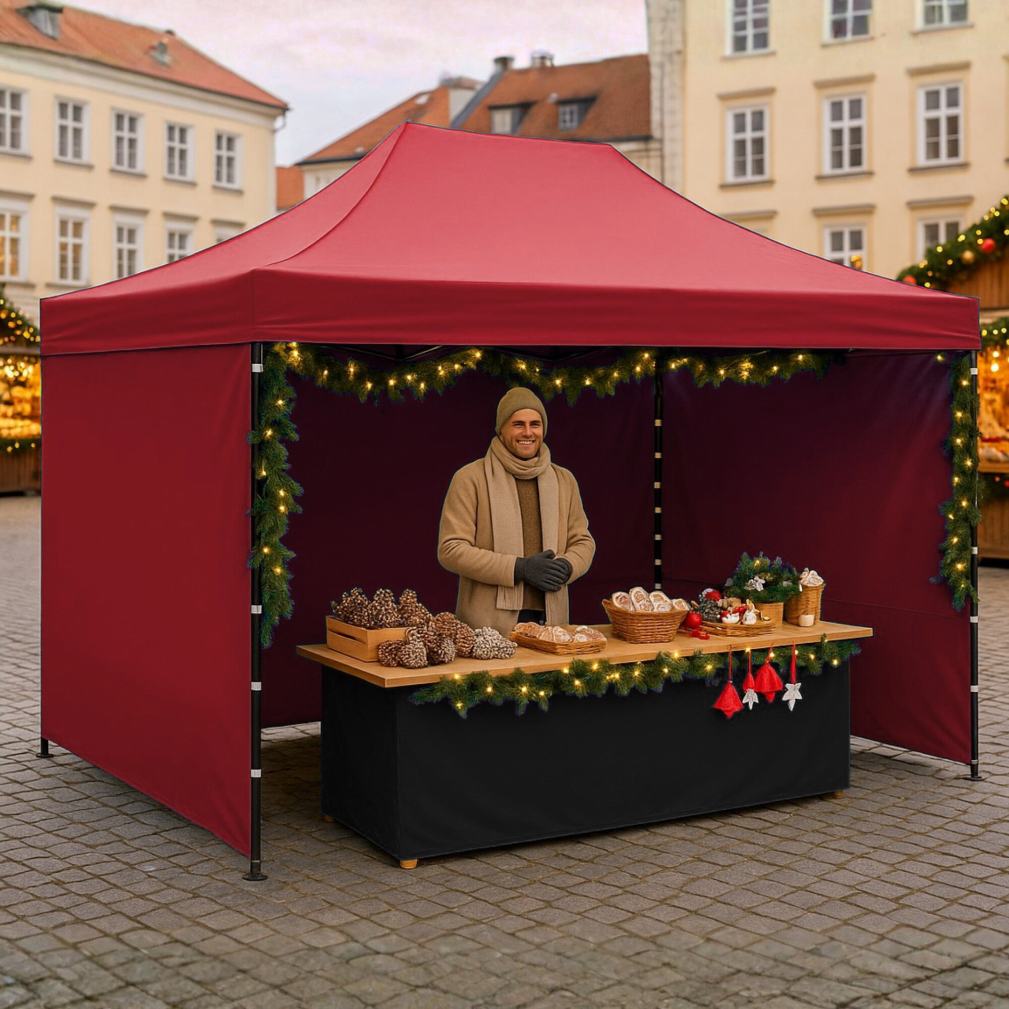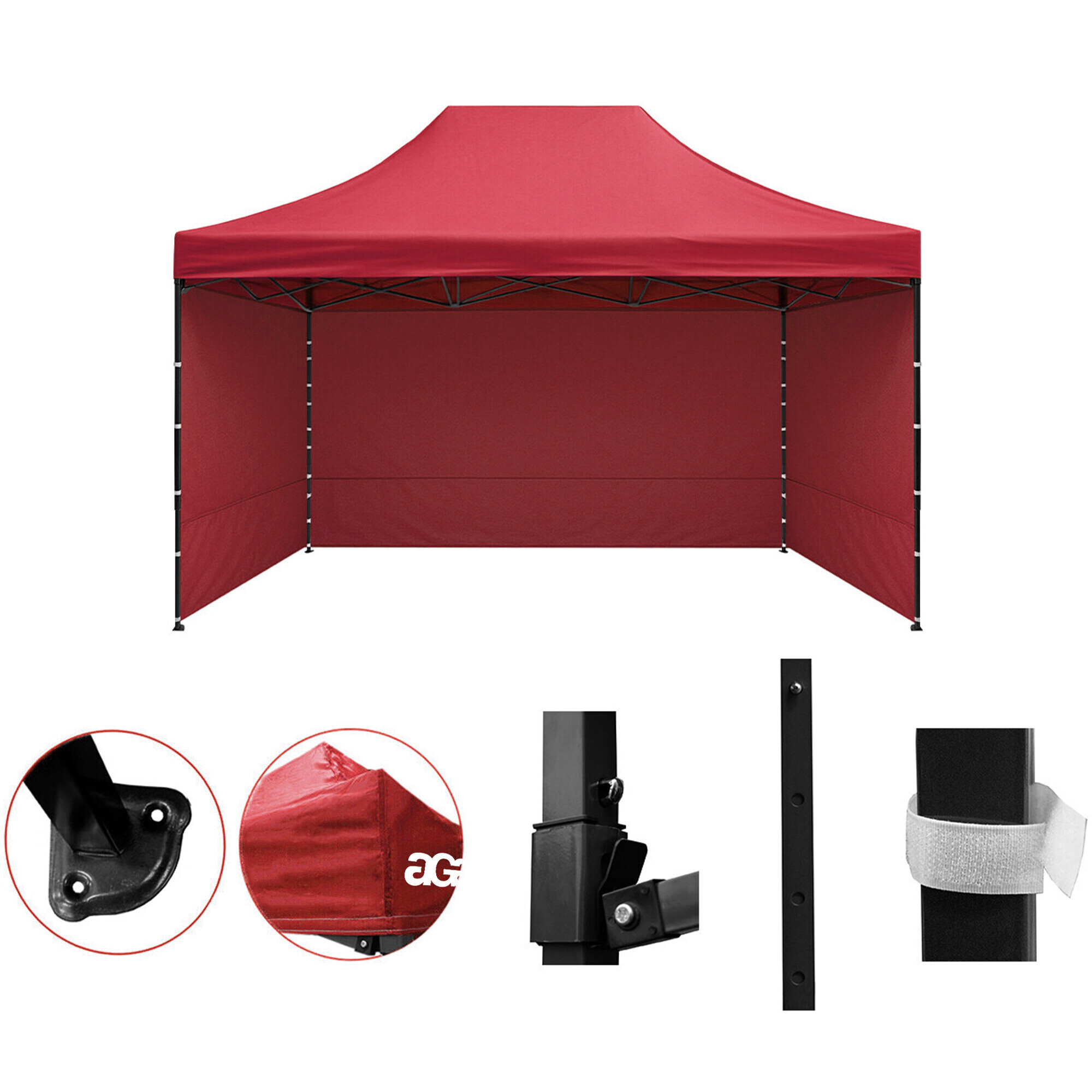 Strecha z odolného 420D PU Oxfordu a bočnice z PVC Oxford 210D poskytujú ochranu proti vetru aj slnku a vytvárajú pohodlné zázemie pre obchodníkov aj návštevníkov. Bočnice je možné kedykoľvek rýchlo zložiť alebo pripevniť vďaka suchým zipsom, takže stánok ľahko prispôsobíte situácii.