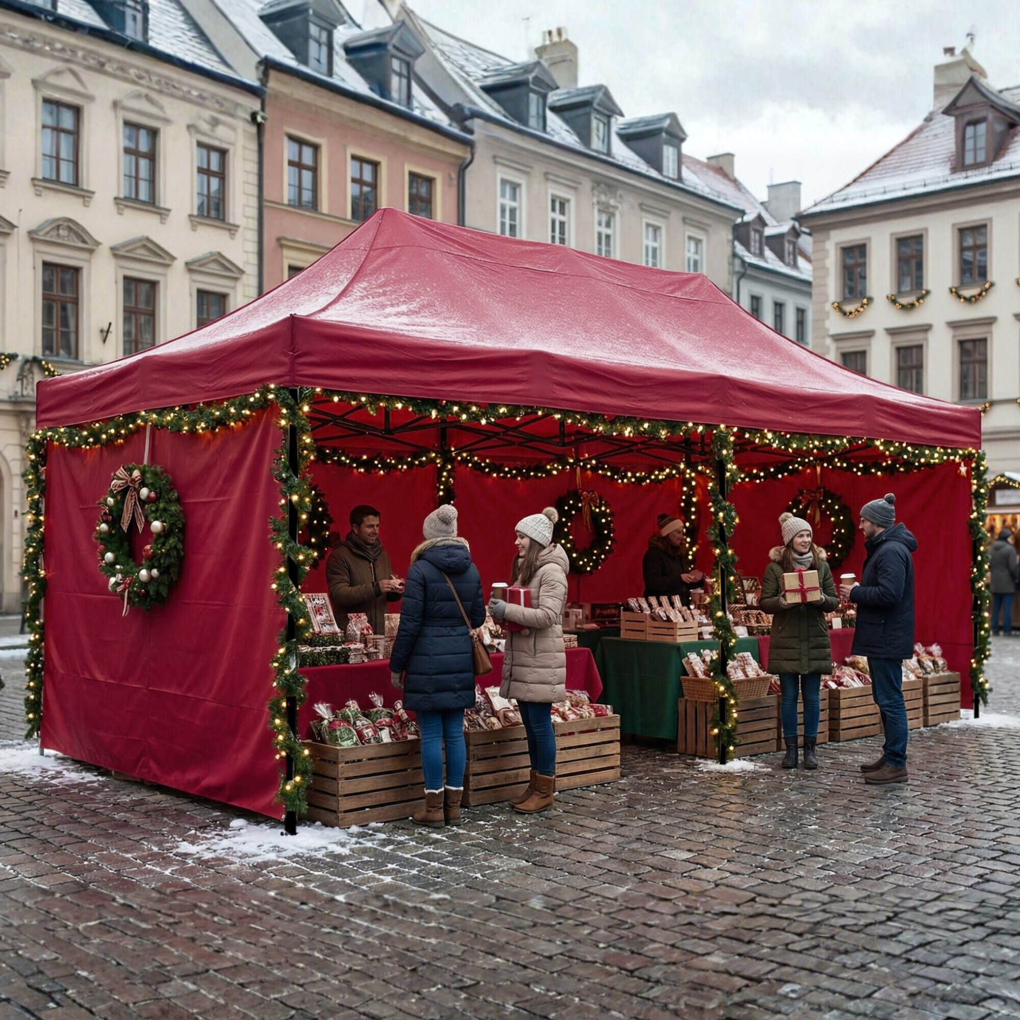 Strecha z 420D PU Oxfordu chráni pred dažďom aj slnkom, zatiaľ čo bočnice z PVC Oxford 210D vytvárajú kryté a reprezentatívne prostredie pre vystavovateľov aj návštevníkov. Bočnice možno ľahko pripevniť alebo zložiť vďaka suchým zipsom, takže stánok rýchlo prispôsobíte aktuálnym podmienkam.