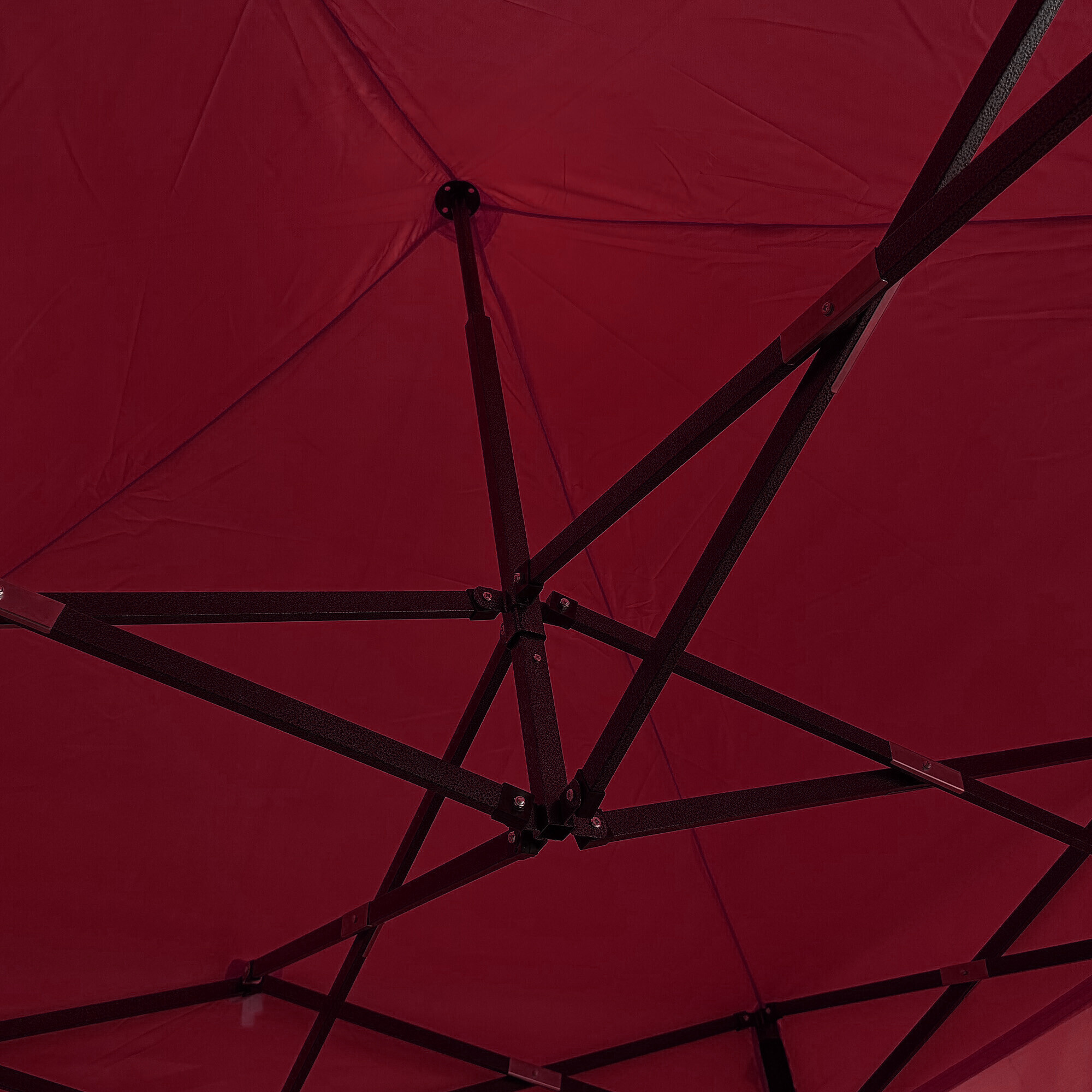 Konstrukciu tvorí oceľový rám s nožnicovým mechanizmom, ktorý je povrchovo chránený práškovým lakom proti korózii. Oproti bežným skladacím stanom má tento model skrutkované spoje, čo zvyšuje pevnosť, predlžuje životnosť a uľahčuje prípadný servis alebo výmenu dielov. Vďaka trom stupňom regulácie je možné výšku nastaviť od 213 cm až do 290 cm, takže stánok ľahko prispôsobíte konkrétnym podmienkam.