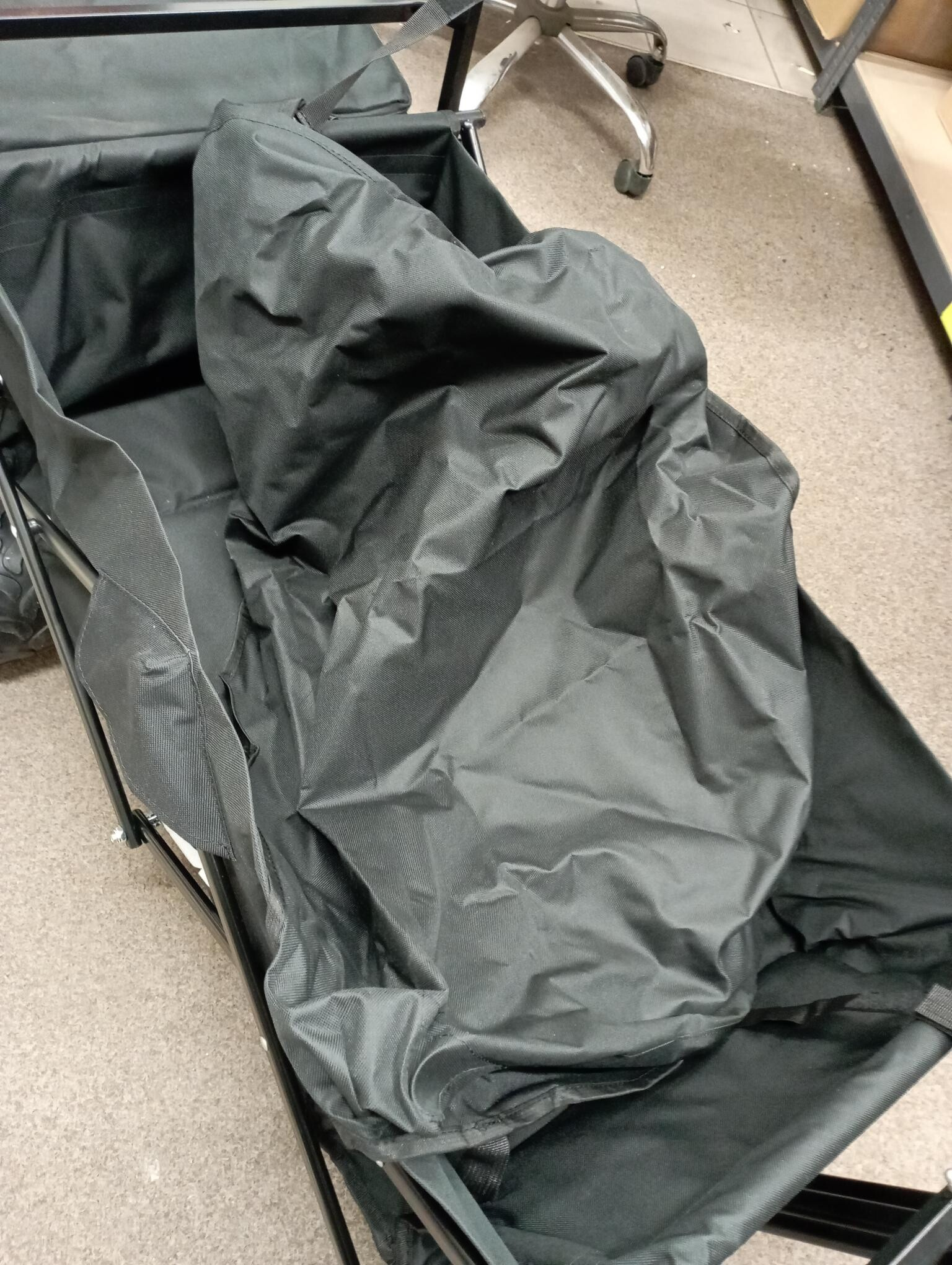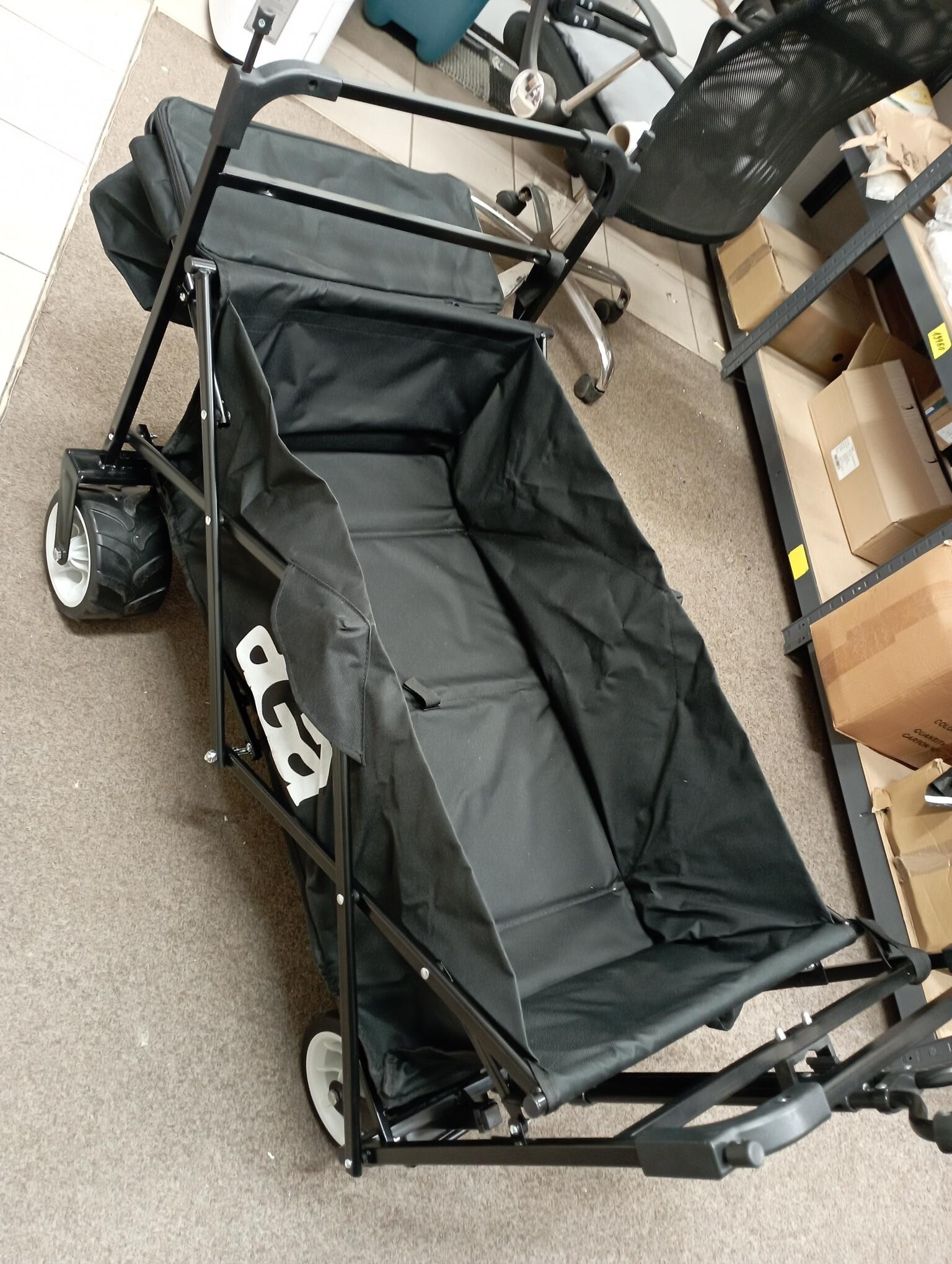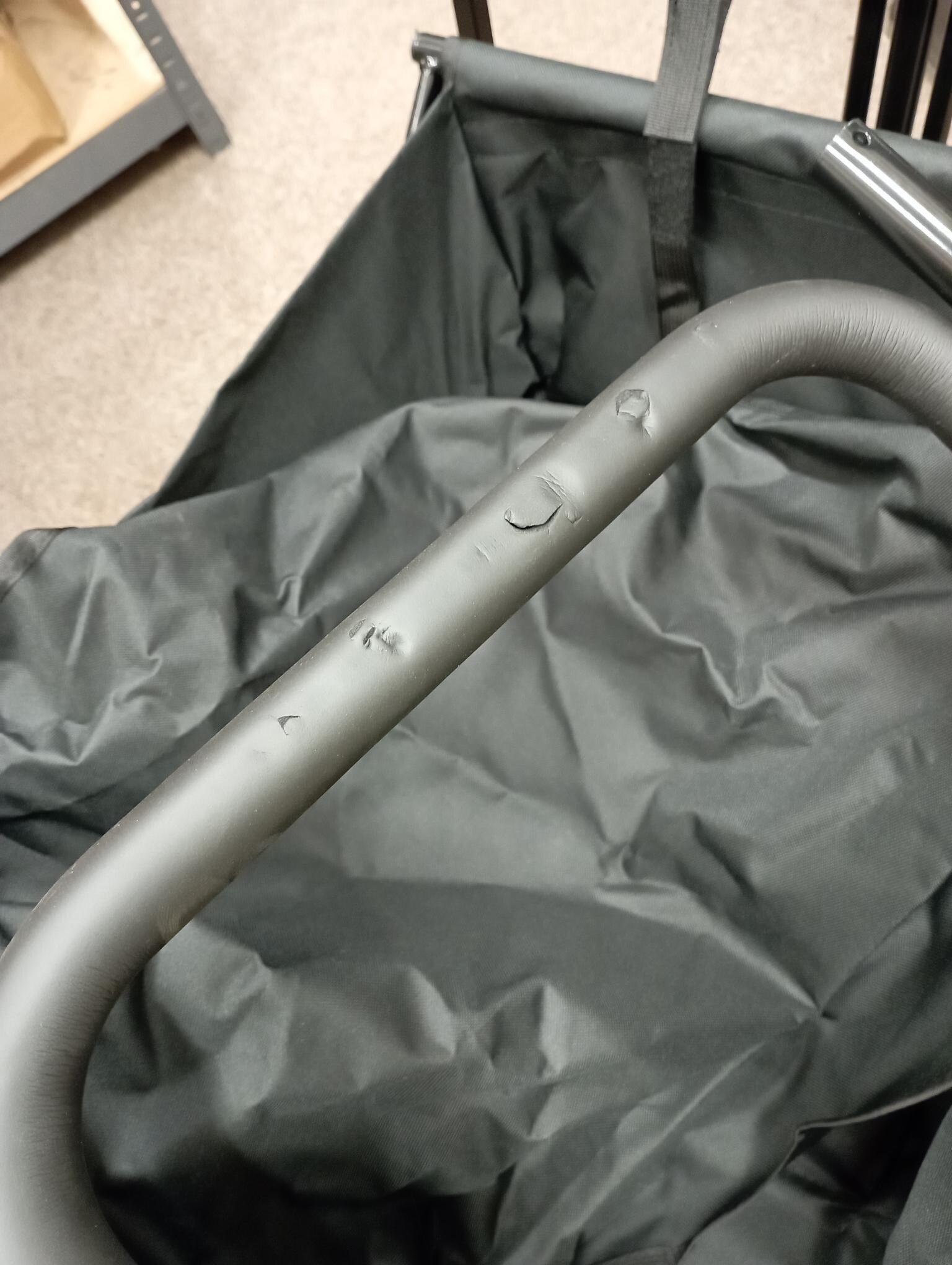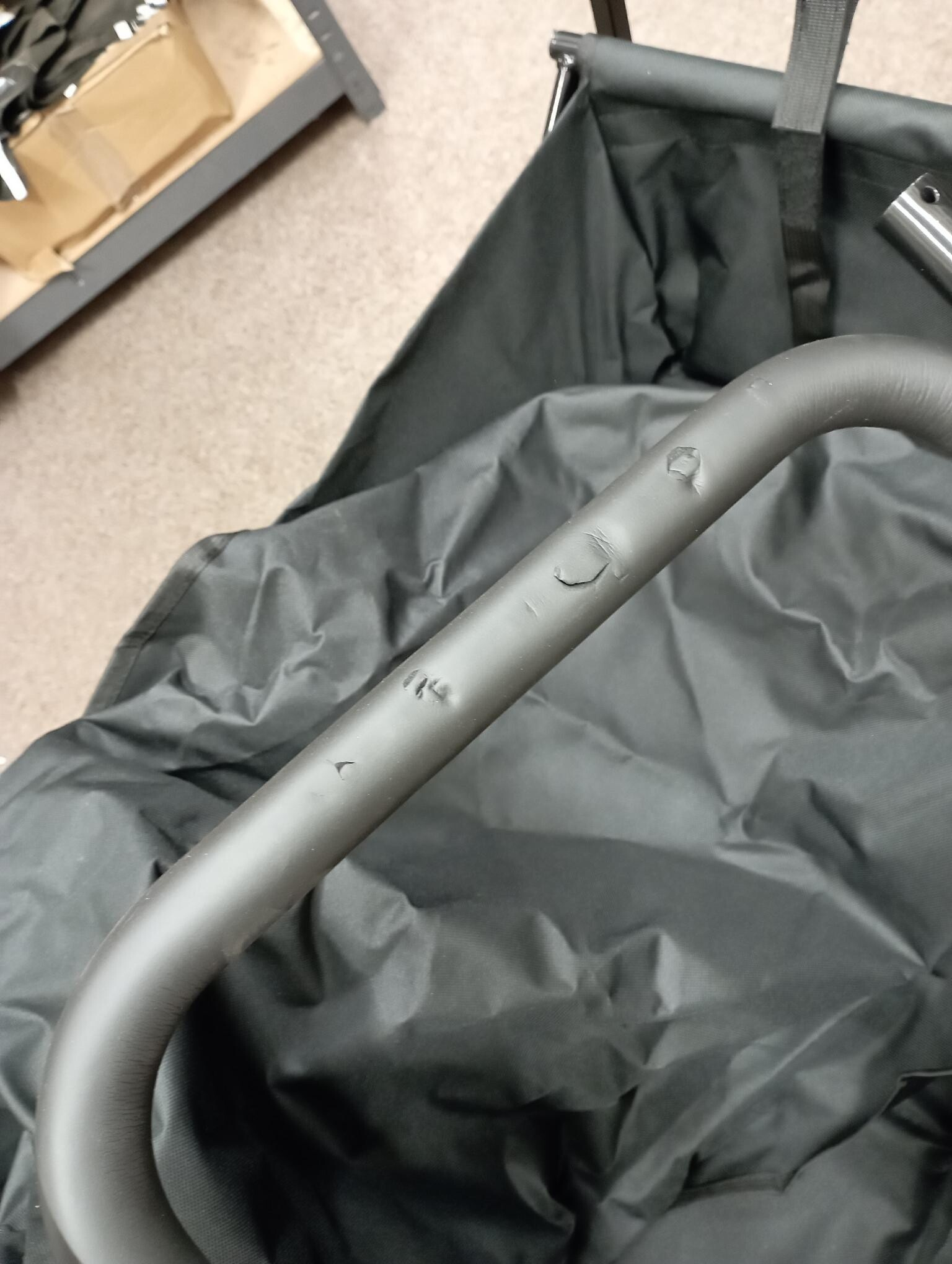 Tento vozík je kompletný, stabilný a plne funkčný. V rámci kontroly sme zaznamenali drobné kozmetické nedostatky – penová časť rukoväte je čiastočne poškodená a celý vozík je ľahko zaprášený z uskladnenia. Tieto vady sú iba vzhľadového charakteru a nijako neobmedzujú používanie ani nosnosť vozíka.