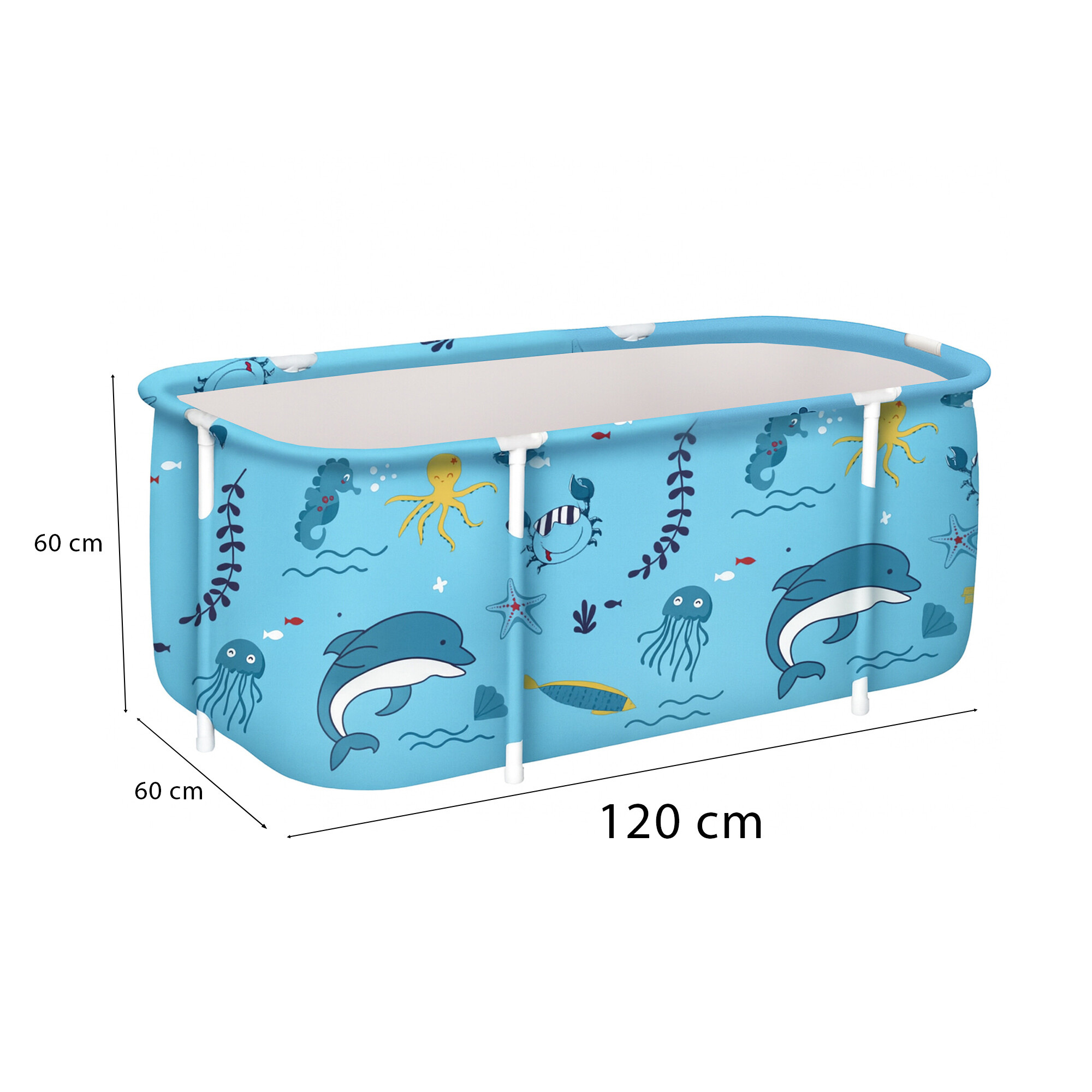 Skladacia prenosná vaňa má rozmery 120 × 60 × 60 cm, takže ponúka dostatok priestoru pre pohodlný kúpeľ aj v menších domácnostiach.