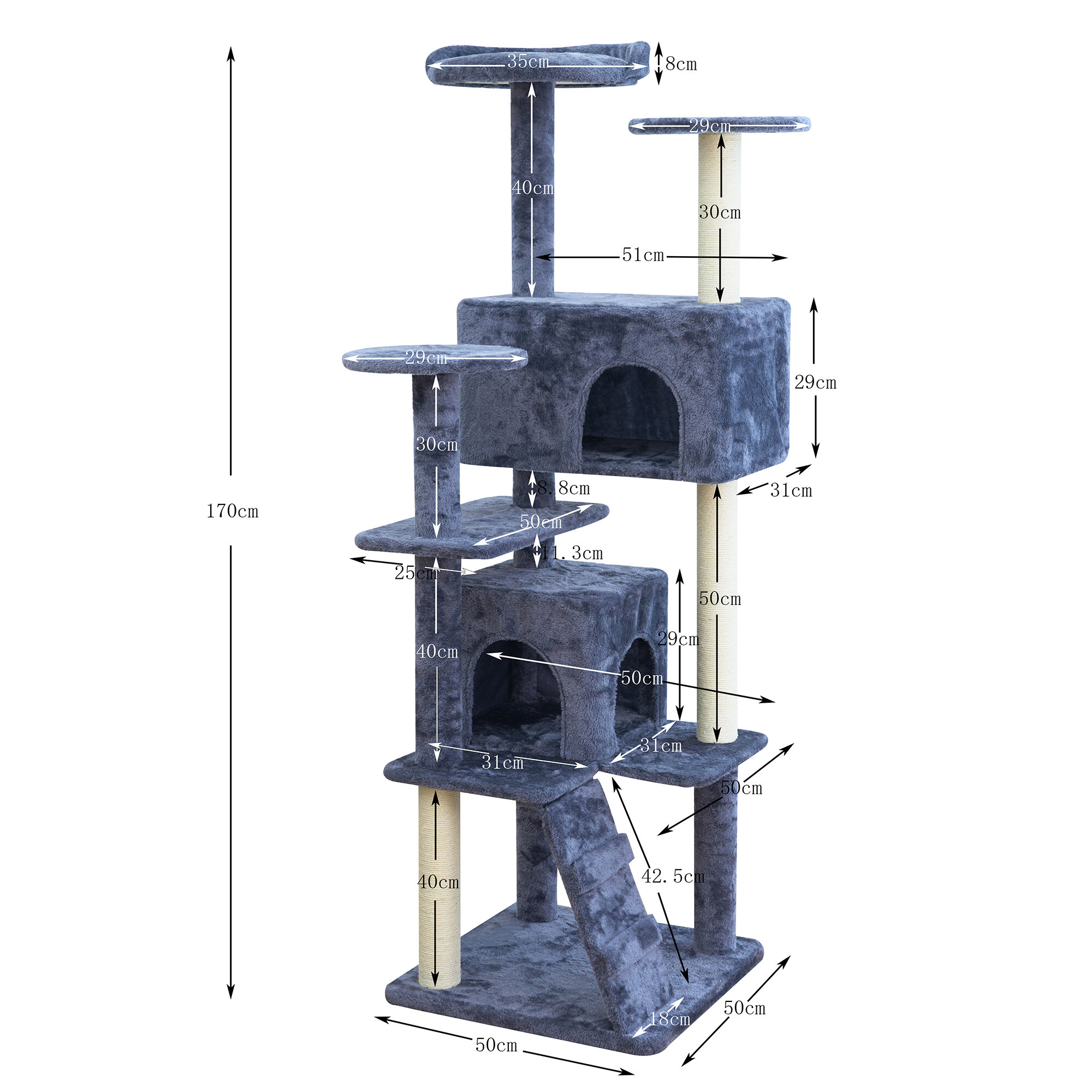 - Škrabadlo obsahuje: 2 domčeky pre možnosť úkrytu, 3 odpočívadlá, rebrík a stĺpiky čiastočne potiahnuté sisalom