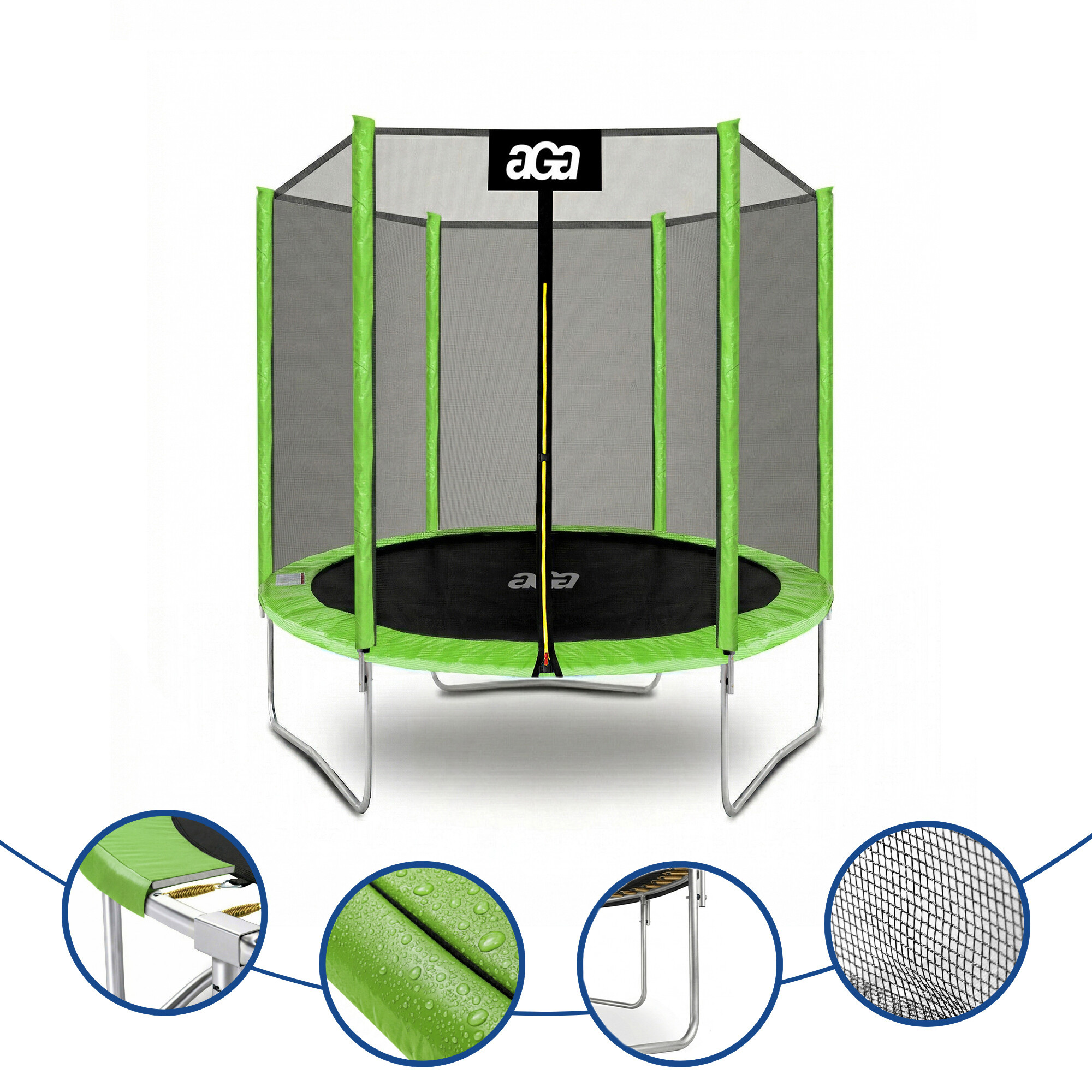 Odrazová plocha trampolíny je vyrobená z polypropylénovej tkaniny (PP Mesh) s vodeodpudivým povrchom a odolnosťou voči UV žiareniu.
