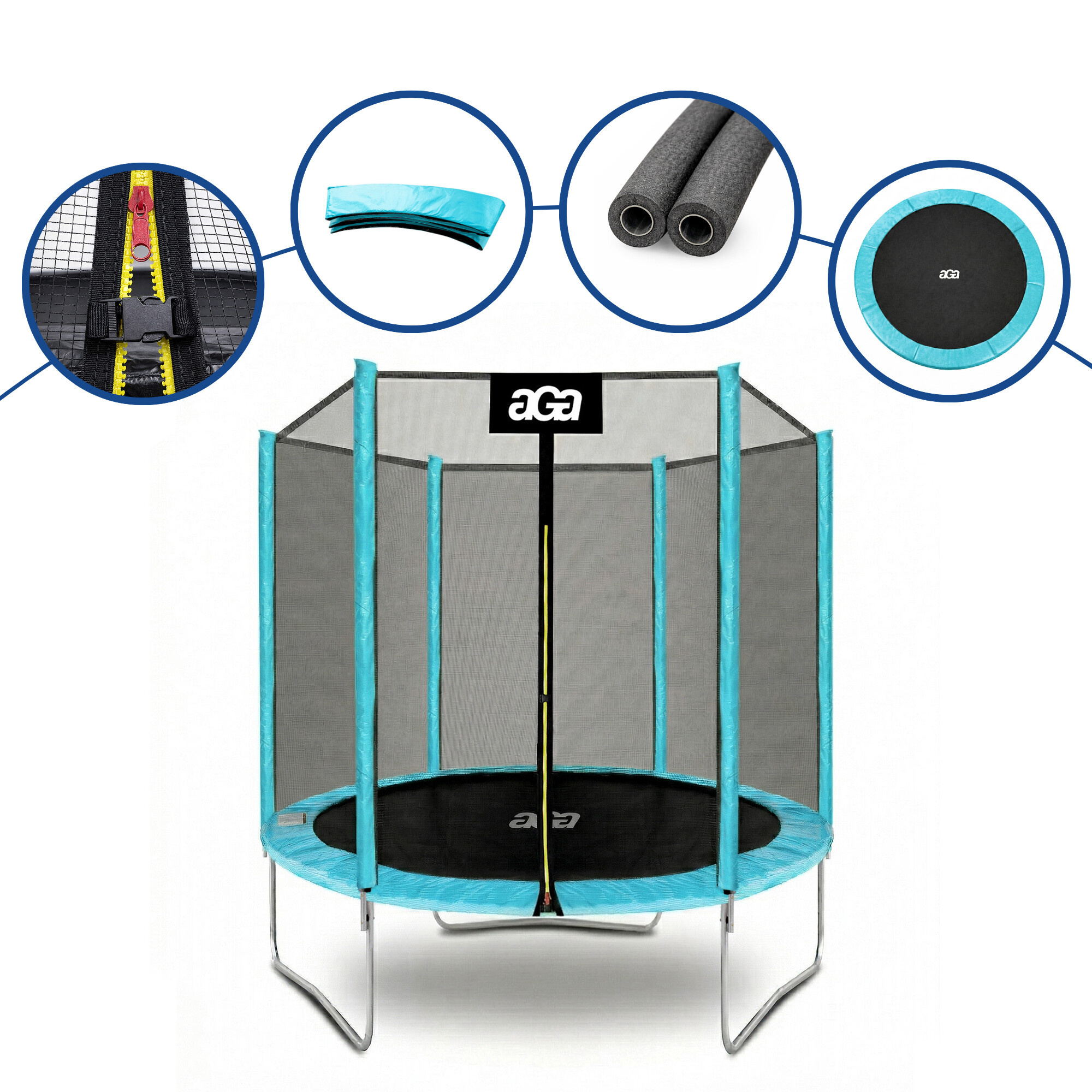 Maximálnu možnú bezpečnosť trampolíny potom zabezpečuje polstrovaný obvodový pás (kryt pružín), vyrobený z PVC, ktorý prekrýva pružiny po celom obvode trampolíny.
