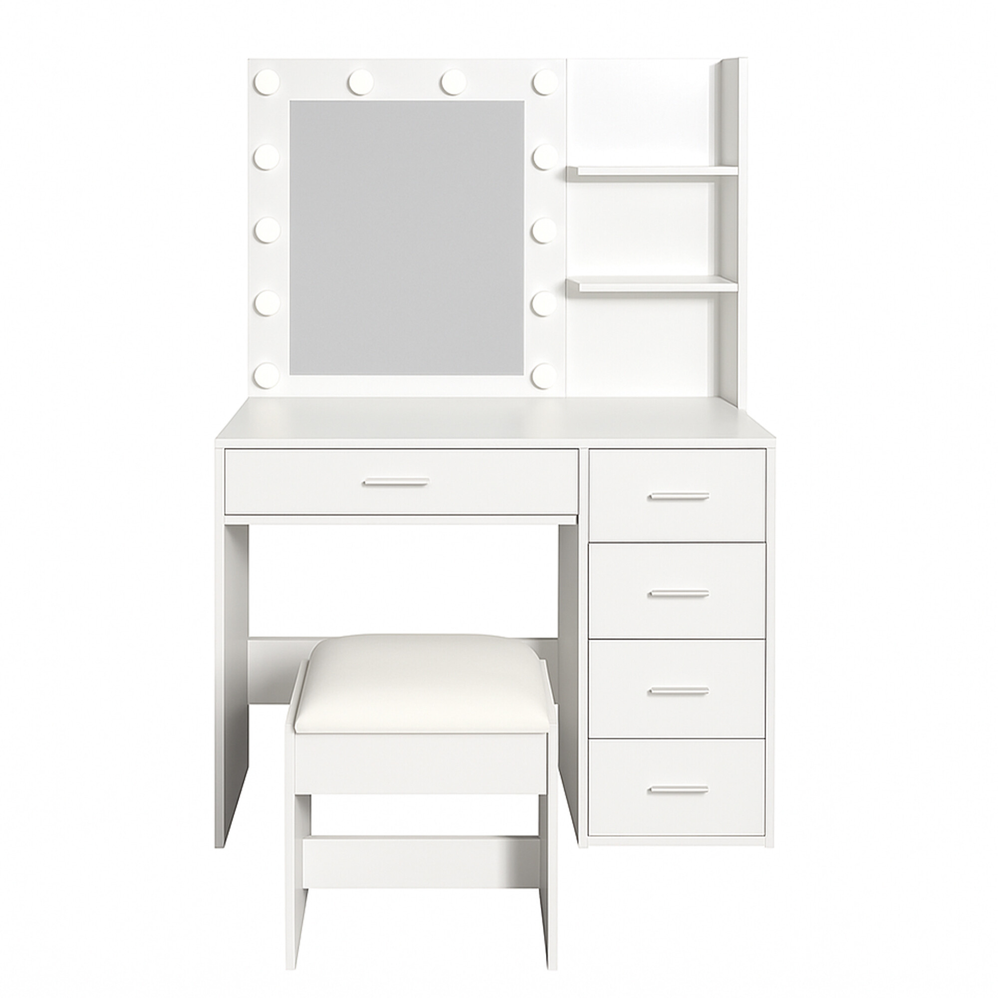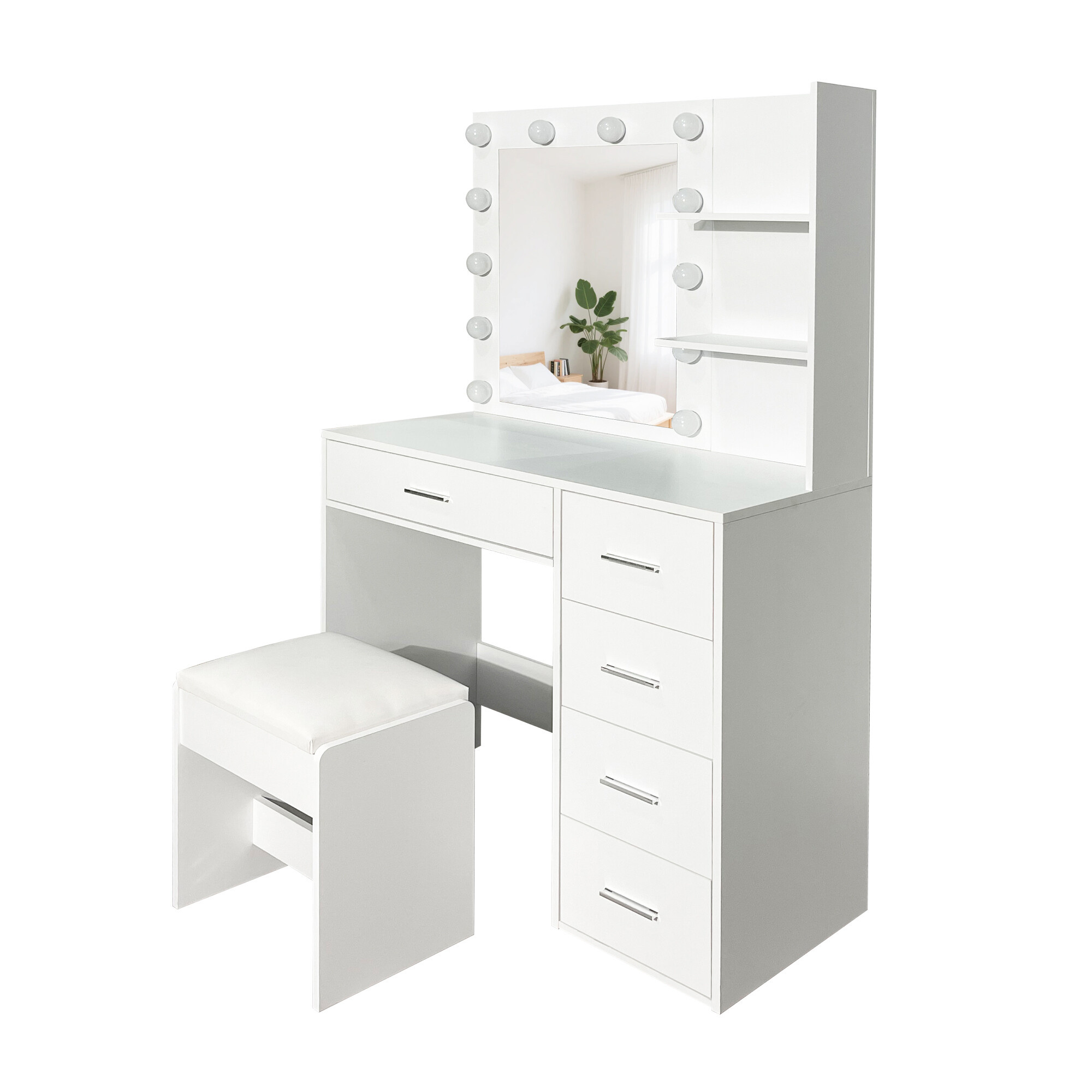 Doprajte si každodennú dávku luxusu s týmto moderným toaletným stolíkom so zrkadlom a LED osvetlením. Štýlový biely stolík v matnom prevedení sa stane nielen praktickým, ale aj estetickým doplnkom každej spálne či šatníka.
