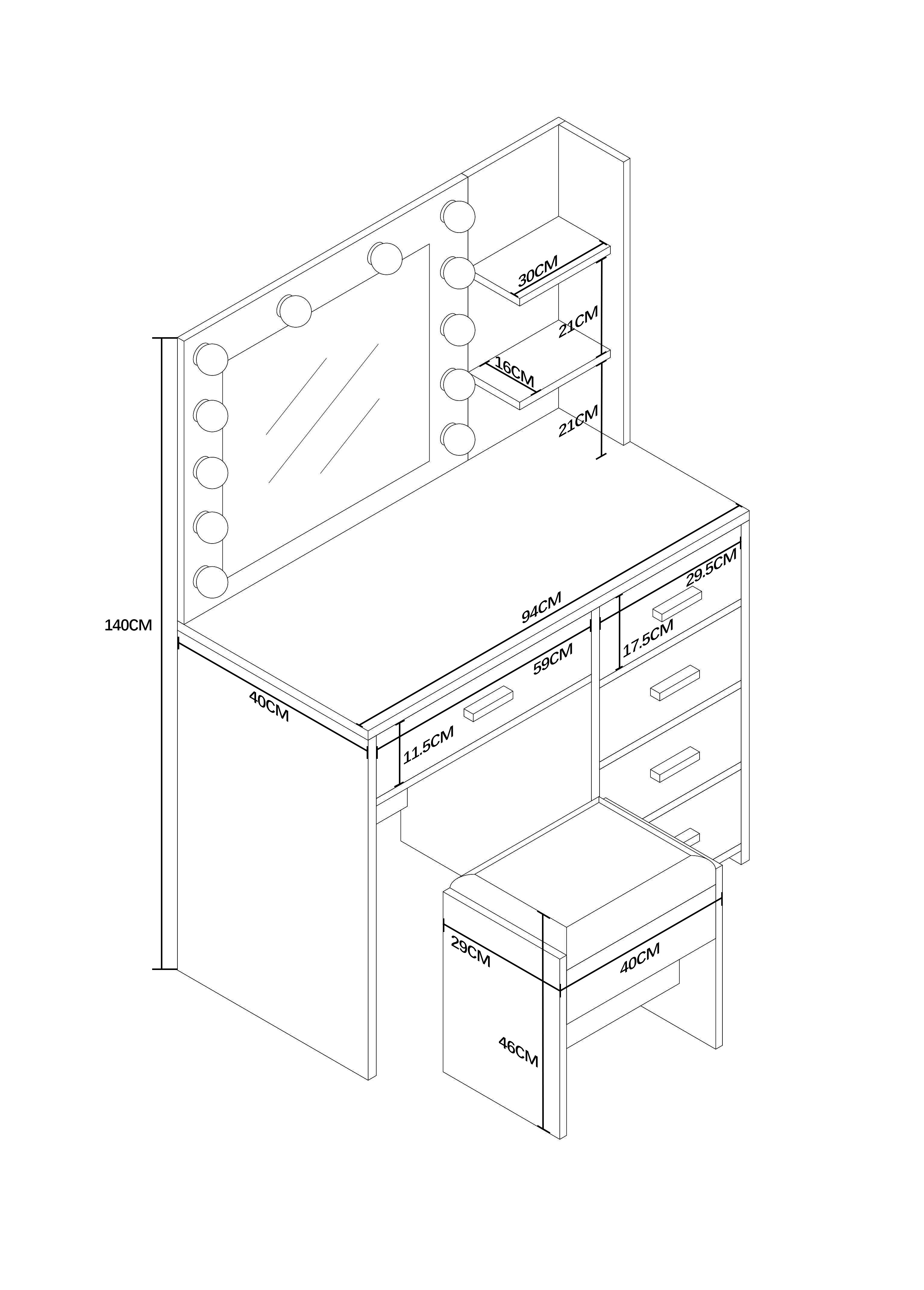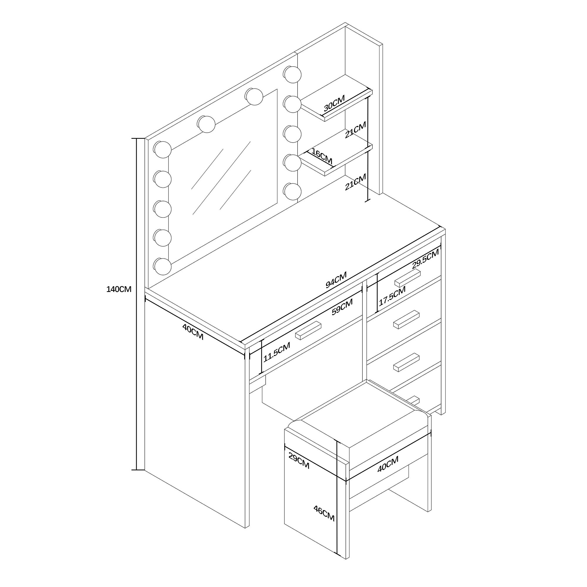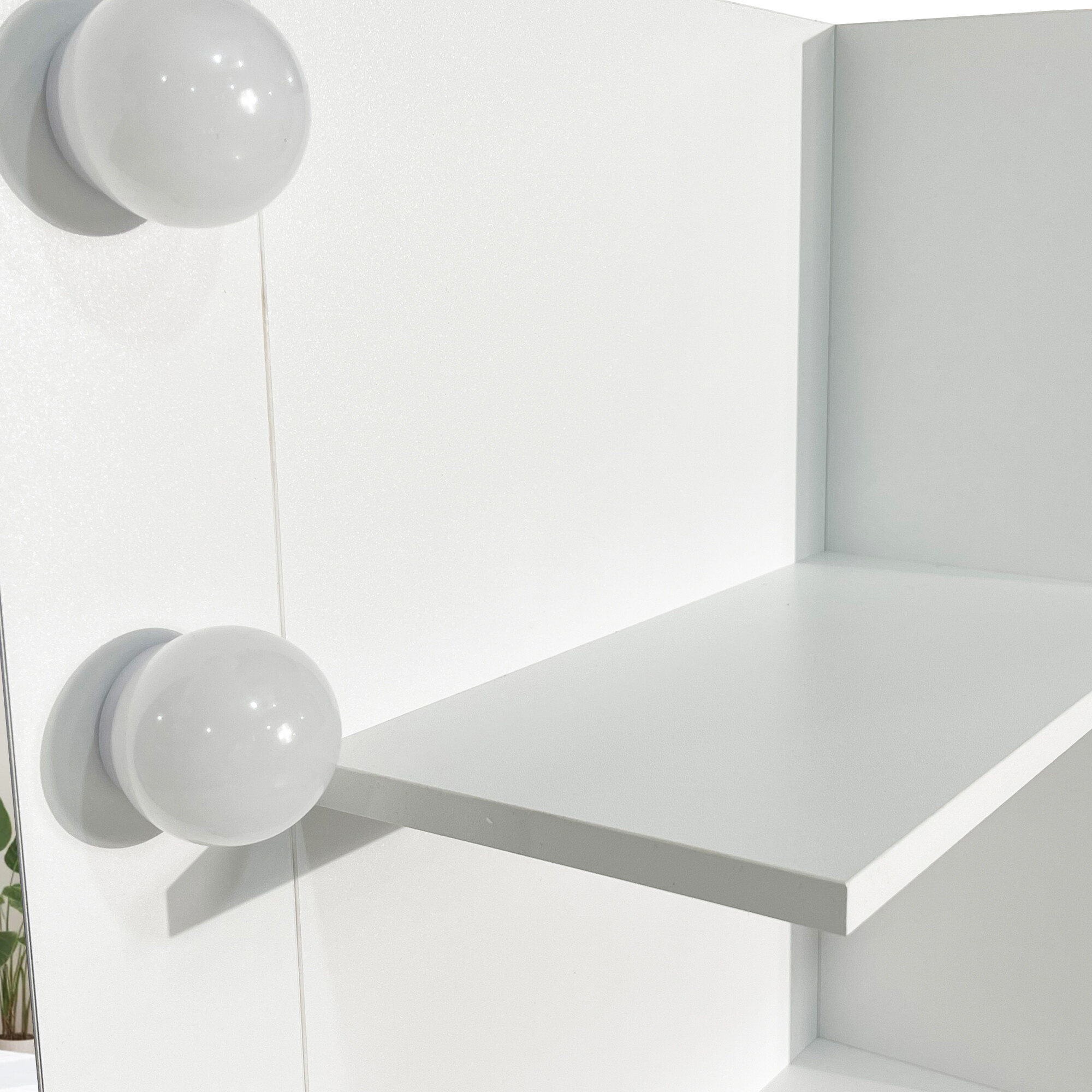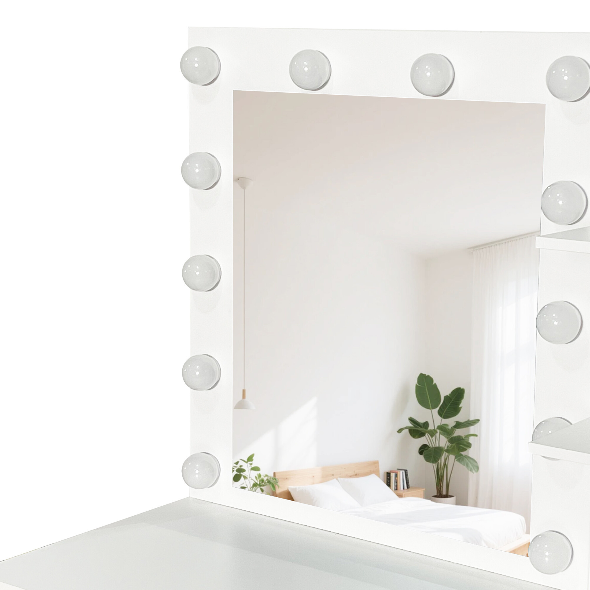Dominantou stolíka je veľké zrkadlo s 12 LED žiarovkami. Vďaka tomu si vždy zaistíte ideálne osvetlenie pre líčenie, úpravu vlasov alebo večernú starostlivosť o pleť.