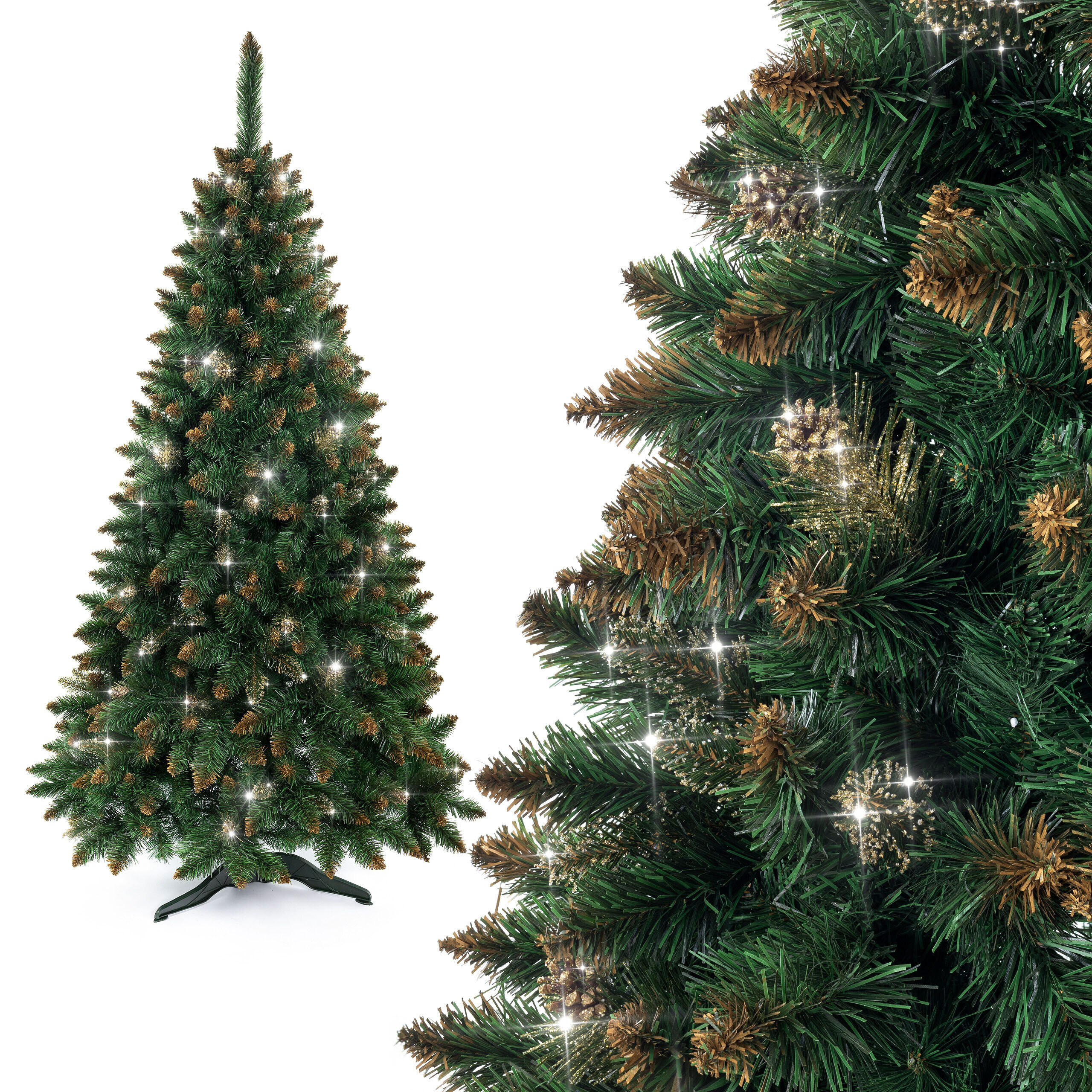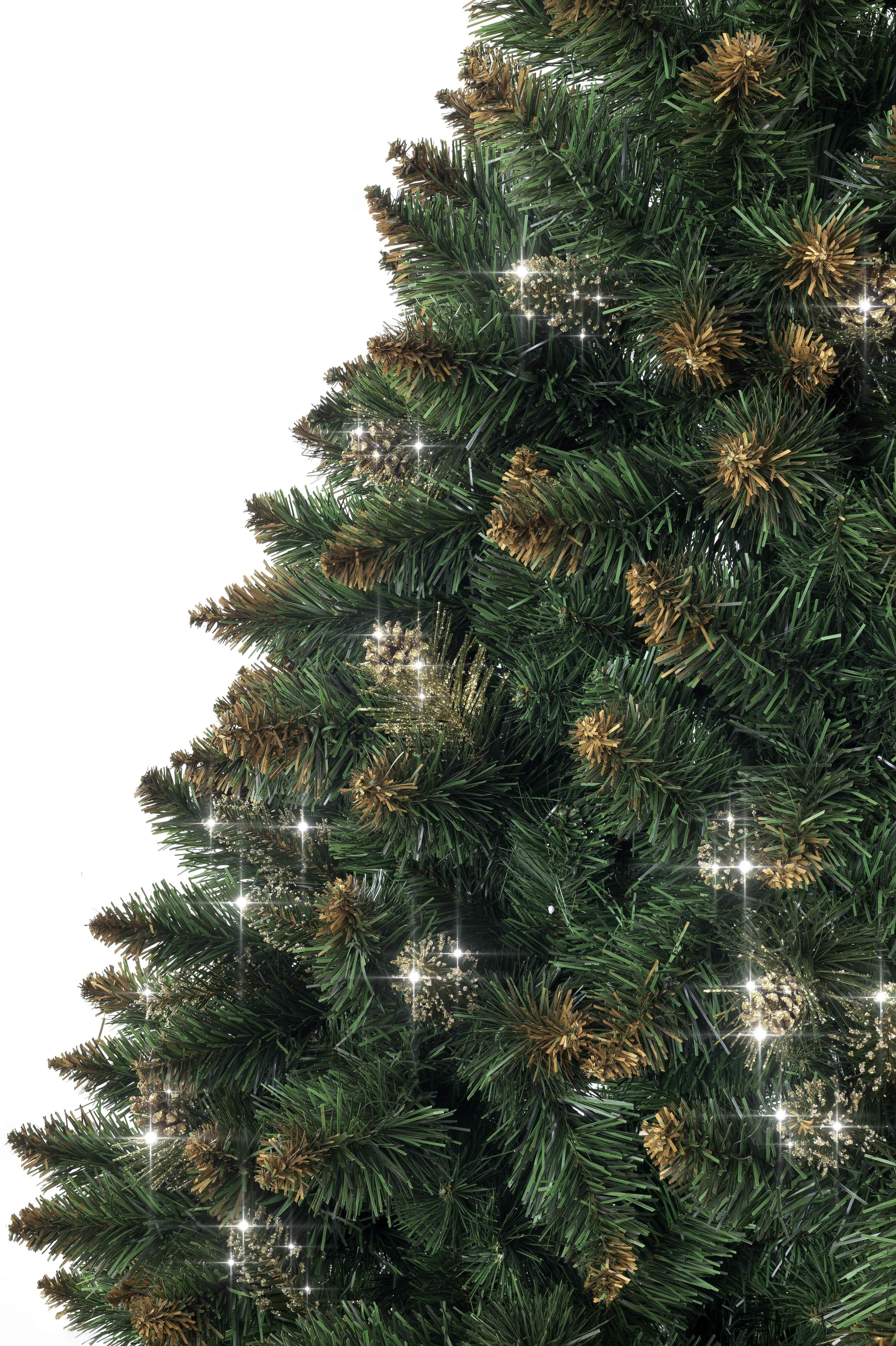 Luxusný umelý vianočný stromček s celkovou výškou 180 cm v prírodnom vzhľade krásnej zelenej hustej borovice, ktorá je ozdobená zlatými trblietkami.