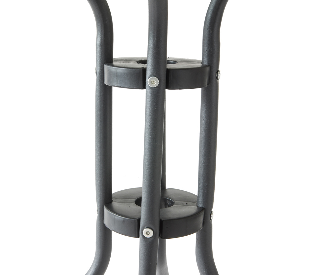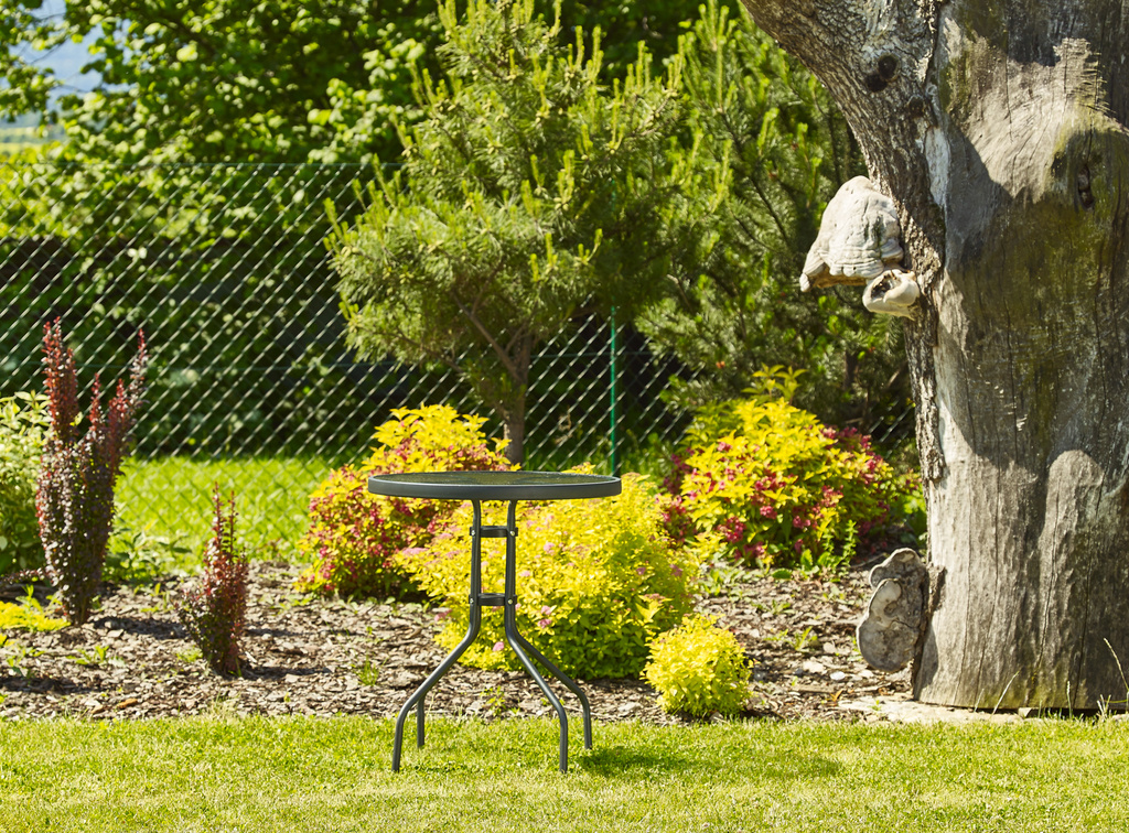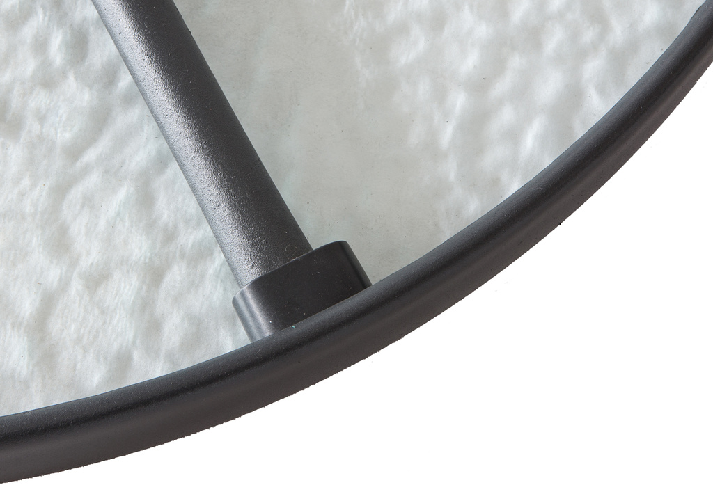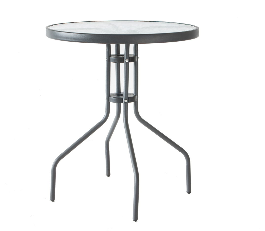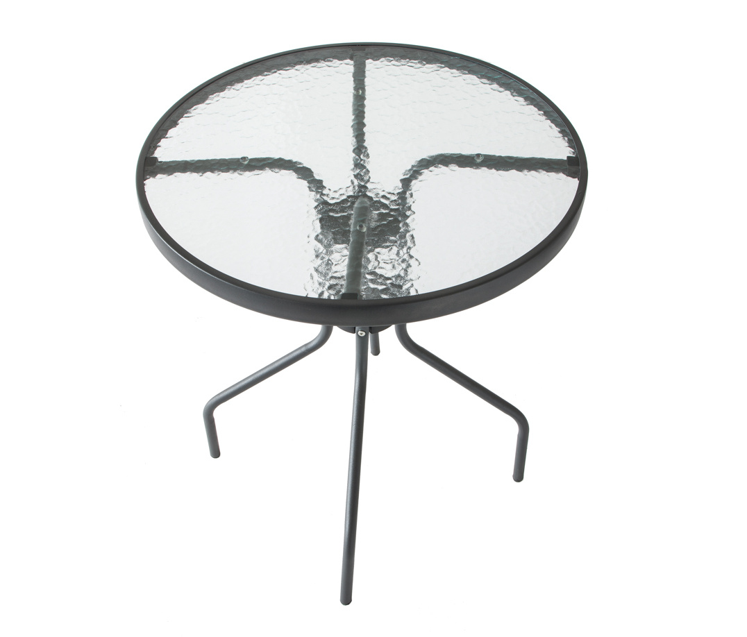 Záhradný stôl s pevným kovovým rámom a vrúbkovanou sklenenou doskou v modernom dizajne, vhodný do záhrad, terasy, kaviarne, altánky, balkóny alebo pláže.