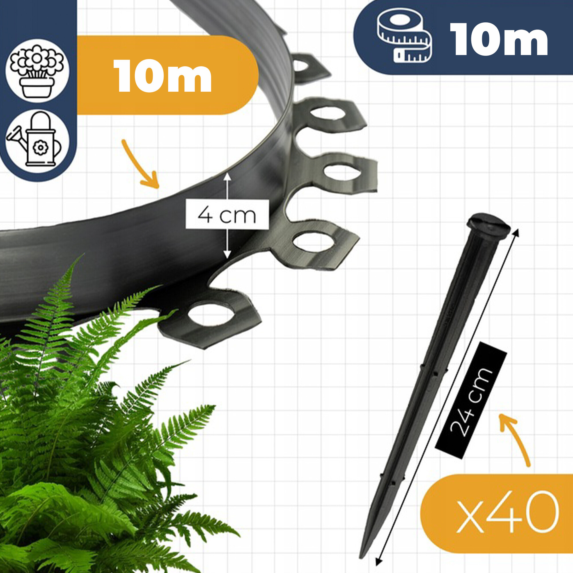 Plastový obrubník do záhrady je odolný voči UV žiareniu, mrazu a vlhkosti, čo zaisťuje dlhú životnosť aj pri celoročnom použití. V balení nájdete 1 rolku 10 metrov a tiež 20 kotiev o dĺžke 24 cm, ktoré zaručujú pevné uchytenie obrubníka v zemi.