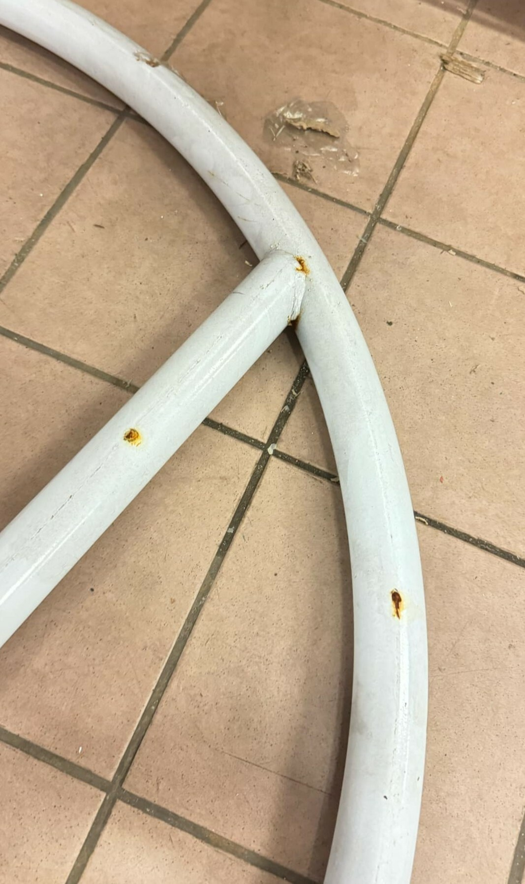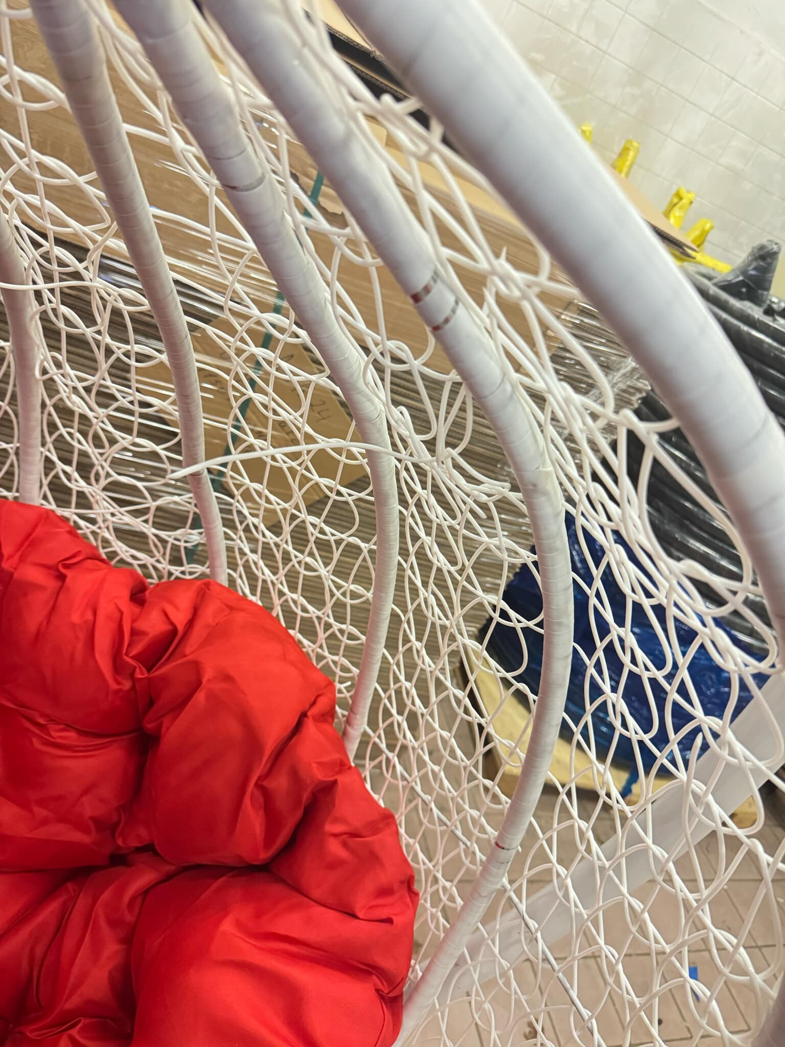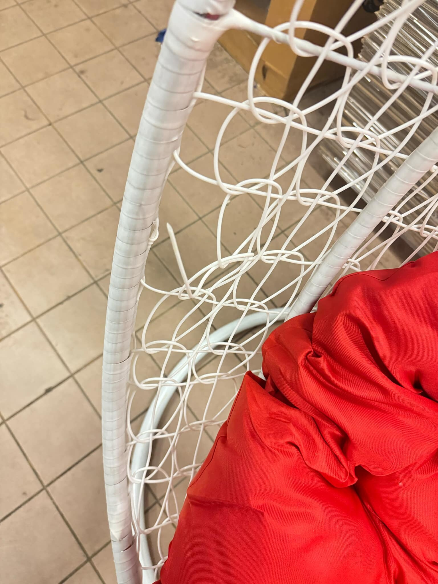 Hojdacie kreslo má odreniny, hrdzu na viacerých miestach, pokrivenú konštrukciu, rozpletajúci sa výplet. Na opravu svojpomocne.