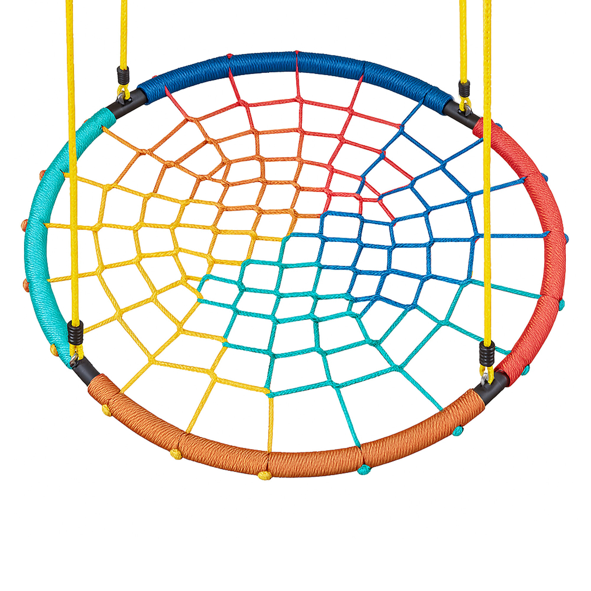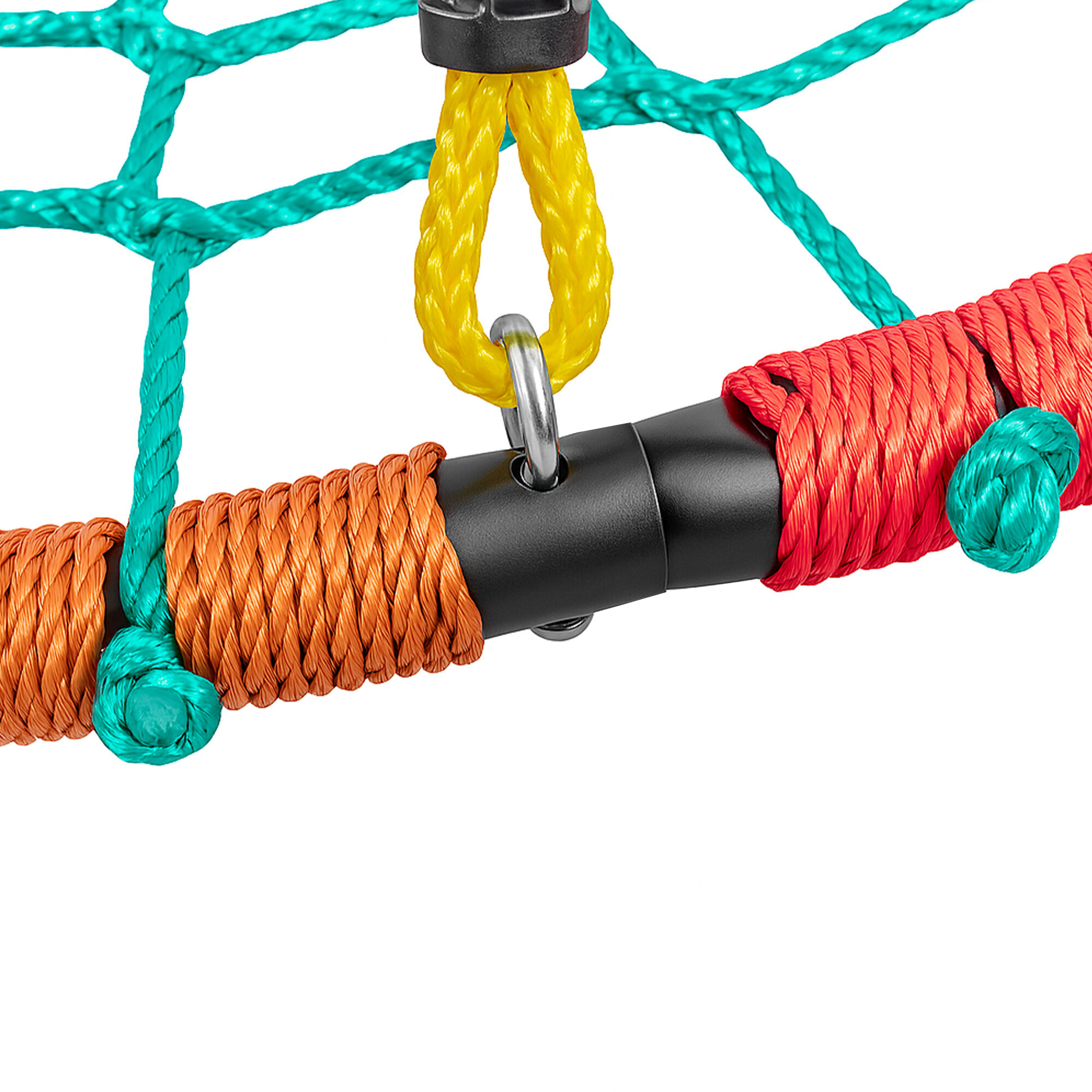 Sedadlo je potiahnuté lanovou sieťou, kovový rám je tiež chránený lanom.výšku hojdacieho kruhu možno plynule nastaviť pomocou závesných lán.
