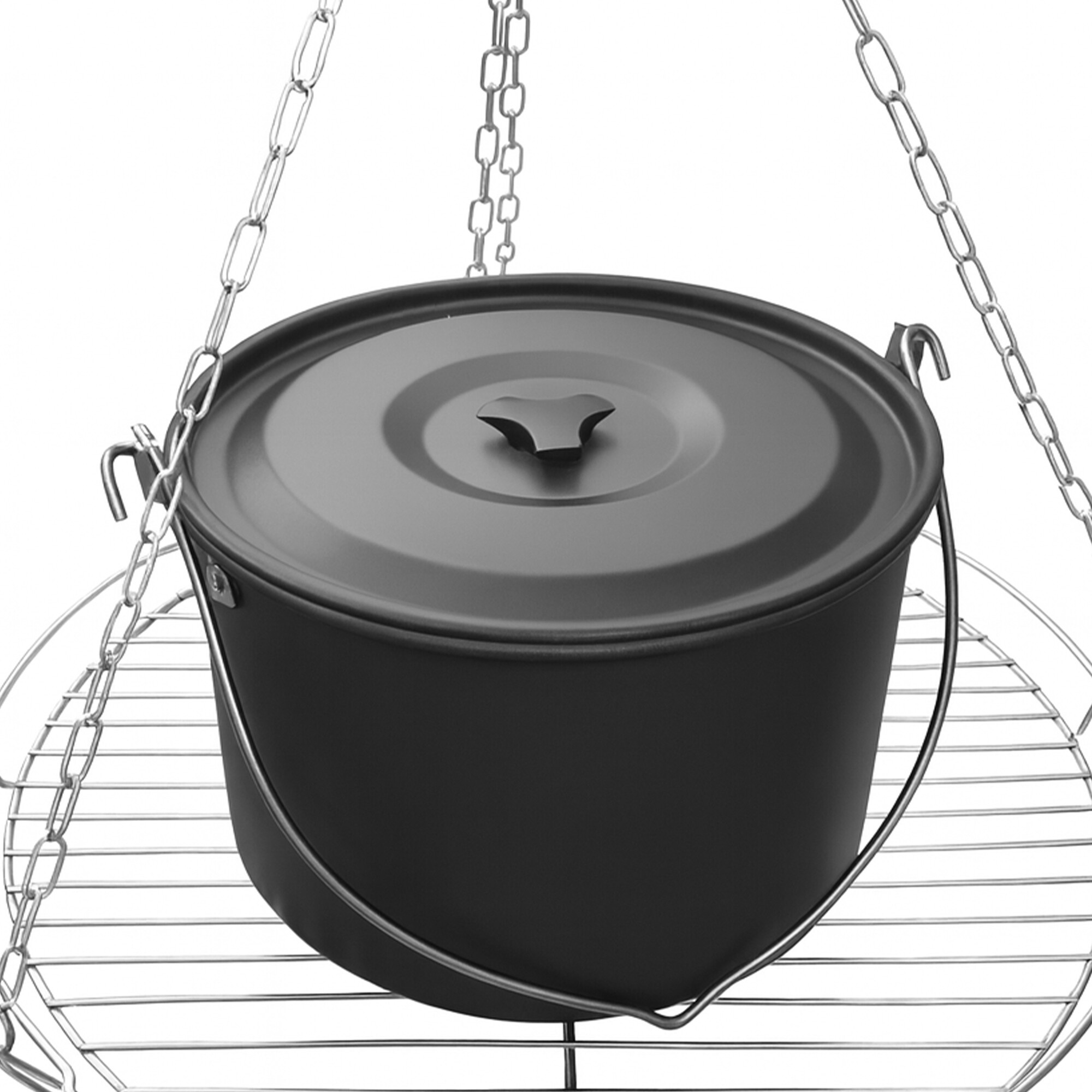 Výškovo nastaviteľný záhradný gril 3v1 spája v jednom riešení ohnisko, závesný rošt a kotlík. Vďaka šikovnému reťazovému systému ľahko zvolíte výšku roštu alebo kotlíka podľa intenzity ohňa, mäso už nikdy nespálite a guláš bude chutiť presne tak, ako má.