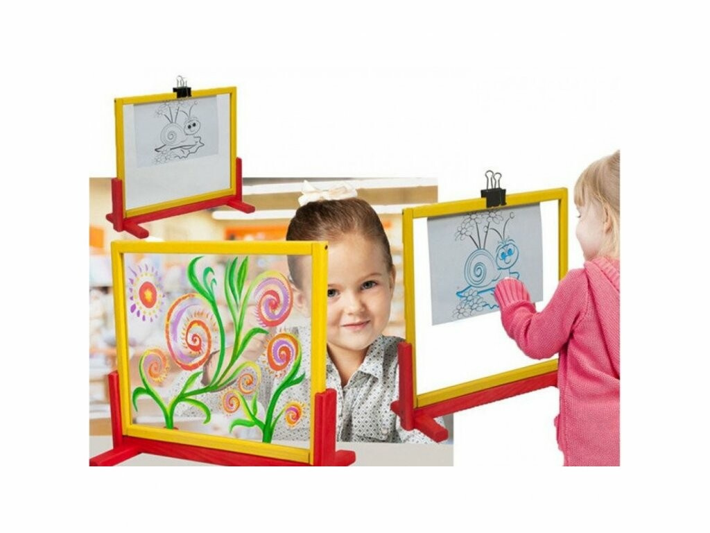Detská magnetická kreatívna tabuľa z priehľadného bezpečnostného skla (plexiskla), na ktorú môžete maľovať rôzne vzory a kresby farbami a fixkami.