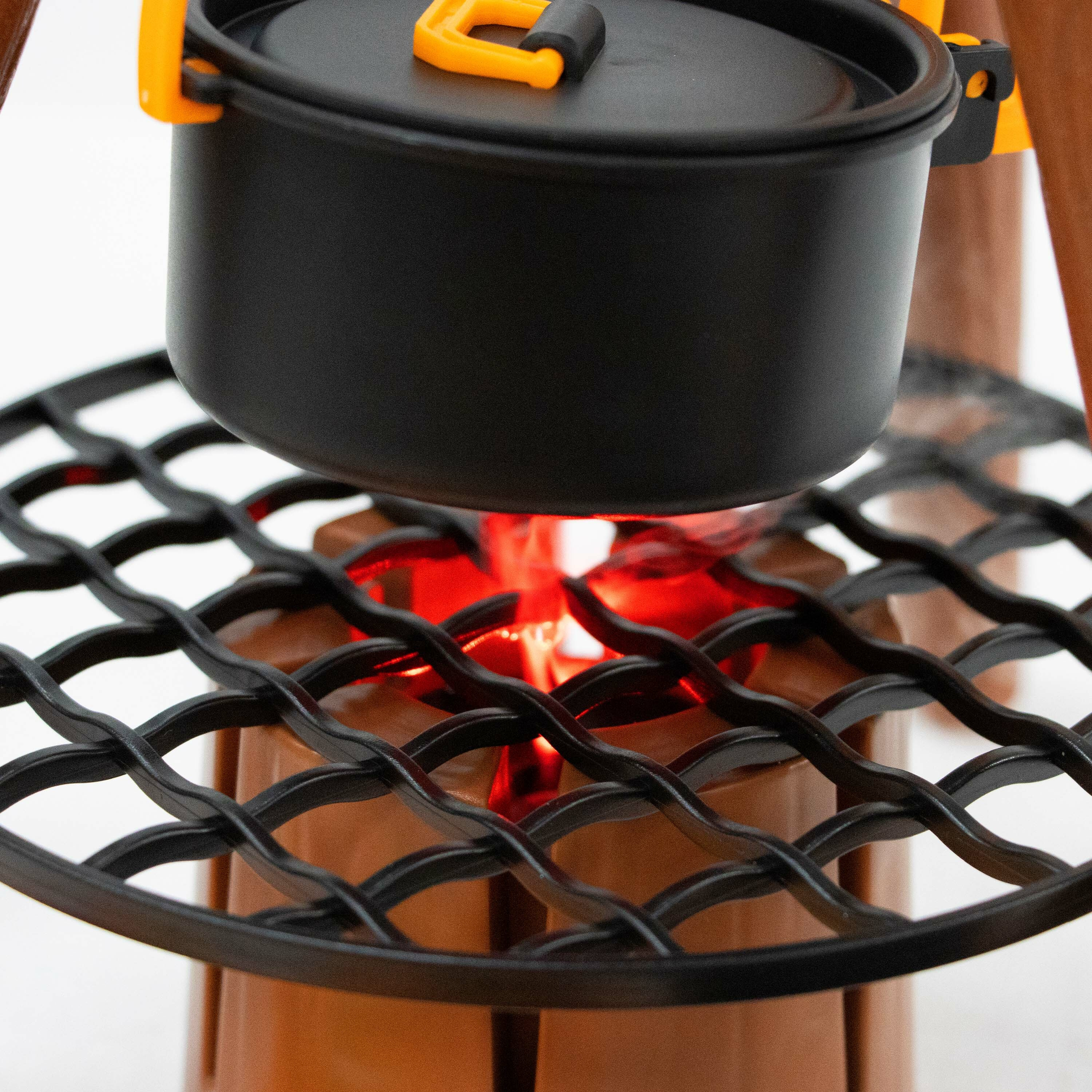 Súprava pozostáva zo skutočne funkčných prvkov - trojnožky nad krbom, závesnej kanvice s pokrievkou, v ktorej môžete variť.