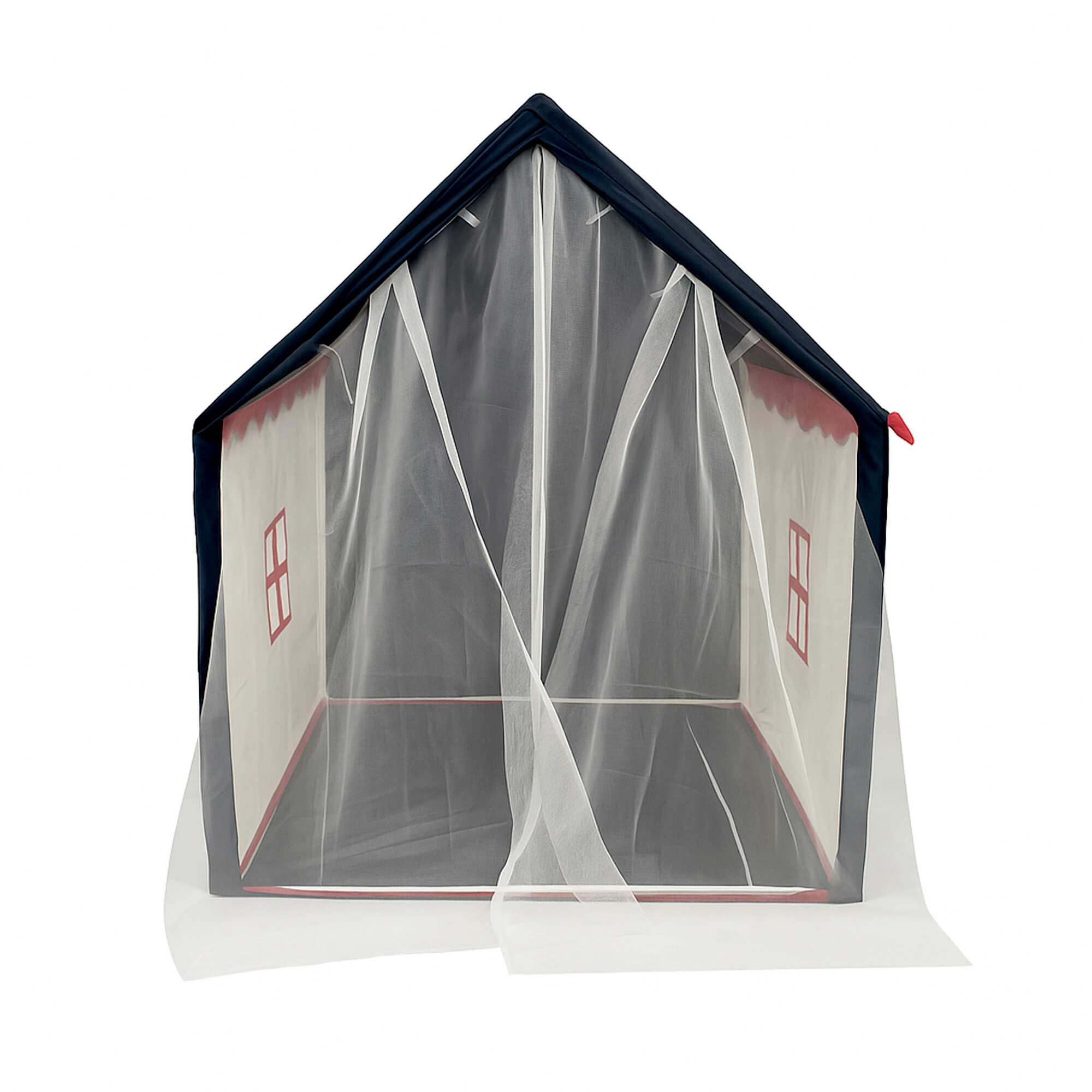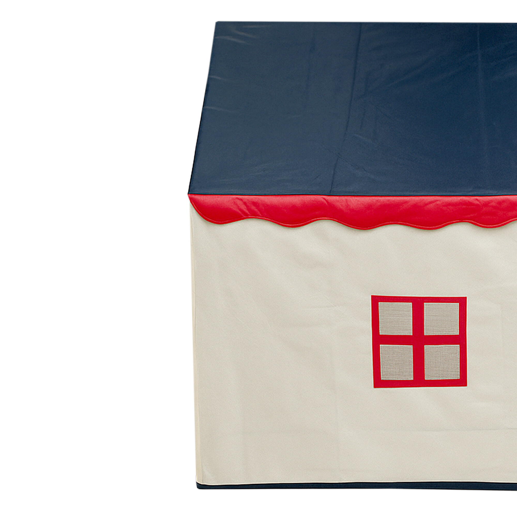 Stan má stabilnú konštrukciu a je potiahnutý pevnou textíliou v elegantnej kombinácii tmavomodrej, červenej a béžovej farby. Na bokoch nájdete okienka pre dostatok svetla a vzduchu a vstupný otvor s ľahkou sieťovinou, ktorú možno ľahko odhrnúť.