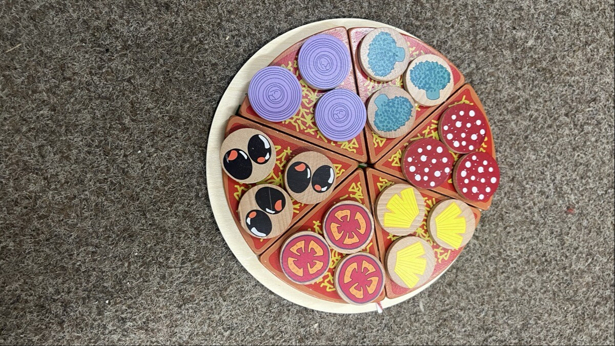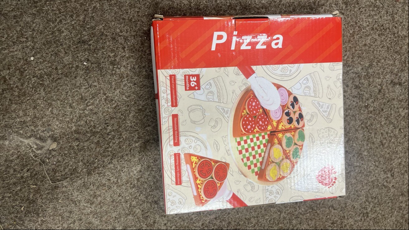 - Set obsahuje, drevený okrúhly nôž, lopatku na naberanie kúsku pizze, drevenú dosku a pizzu s ingredienciami