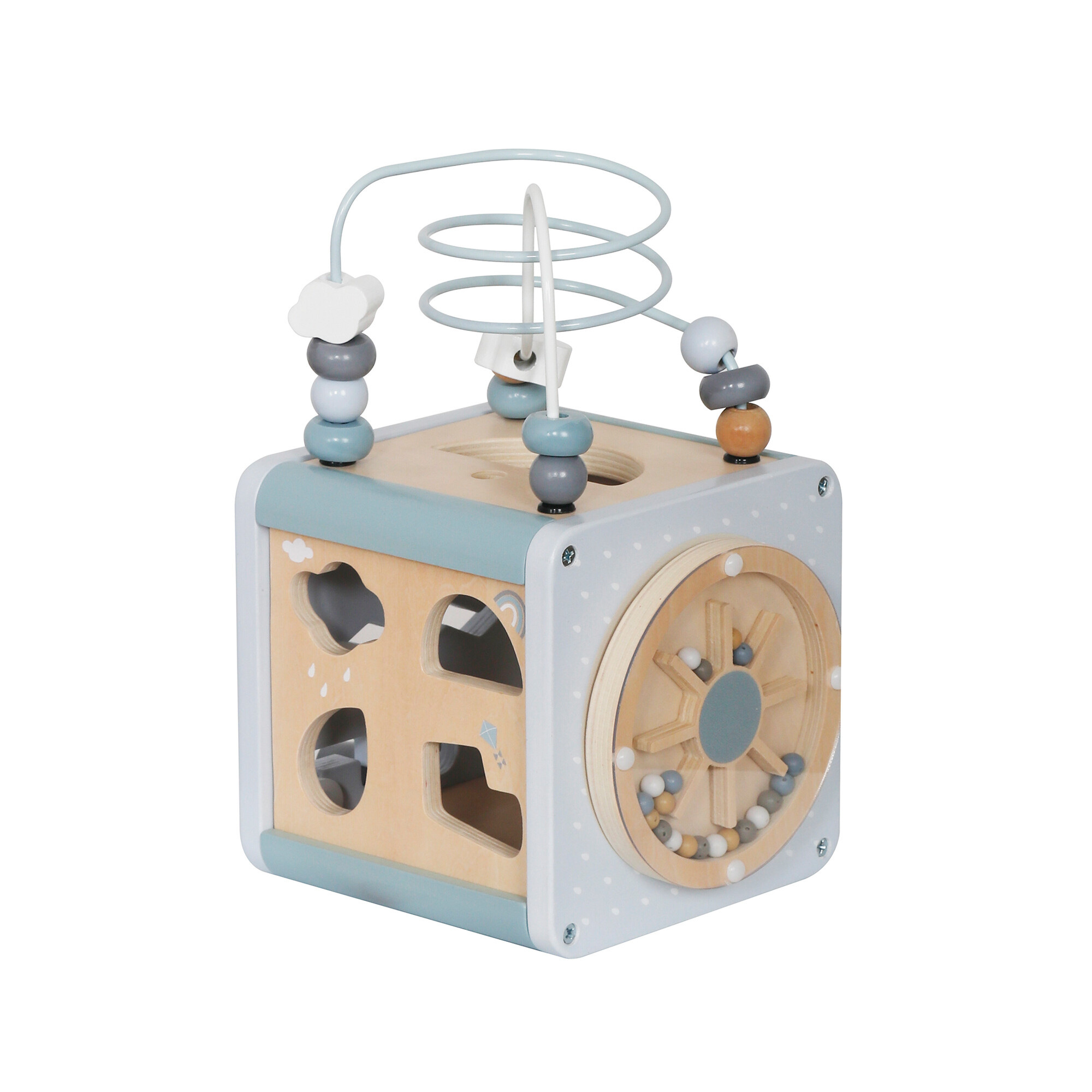 Pestrofarebná drevená interaktívna pomôcka v podobe edukačnej kocky, je kvalitnou drevenou hračkou pre malé šikulky.