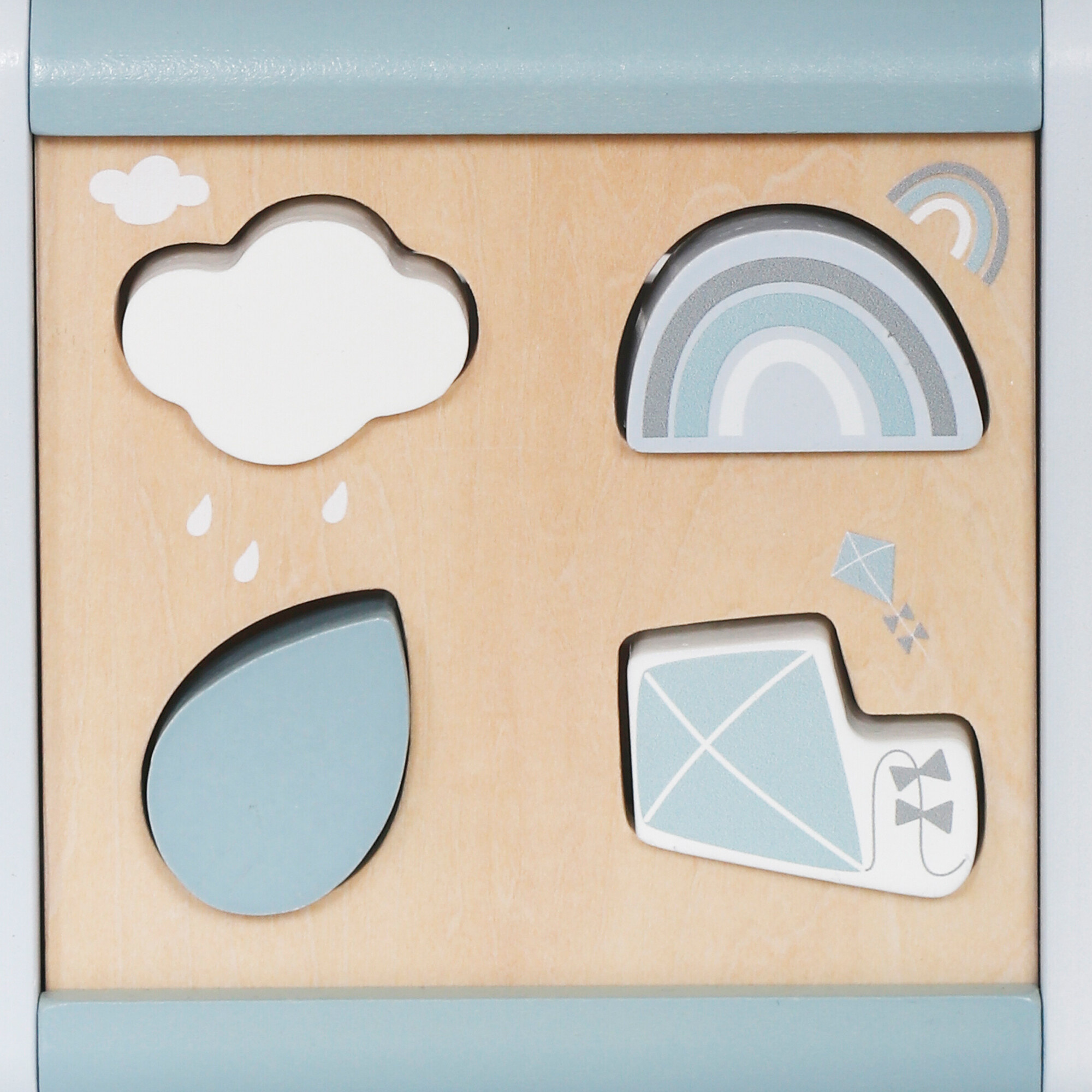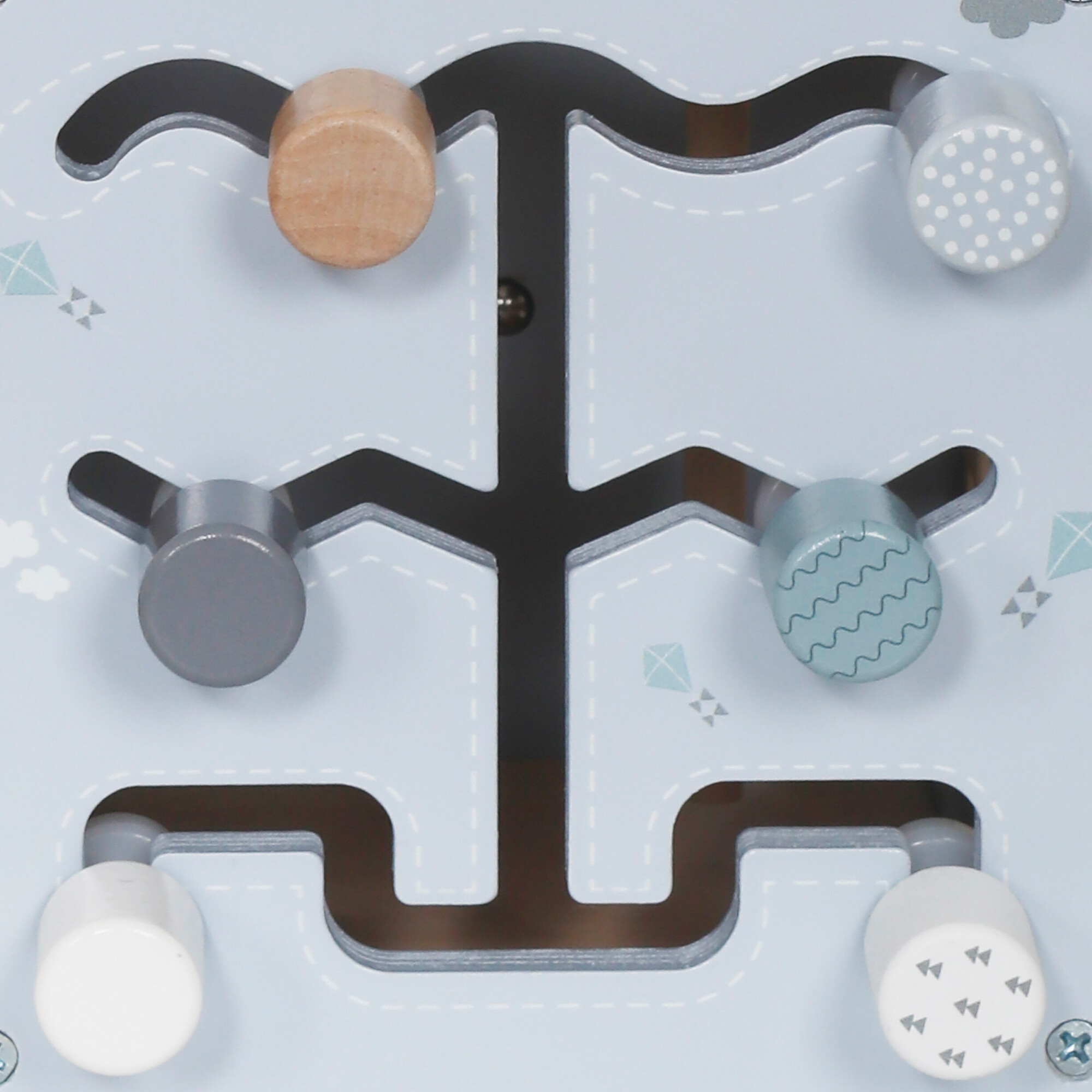 Na vrchnej strane kocky je umiestnený motorický labyrint. Posúvaním korálikov z jednej strany na druhú si dieťa precvičí jemnú motoriku a cit v rukách.