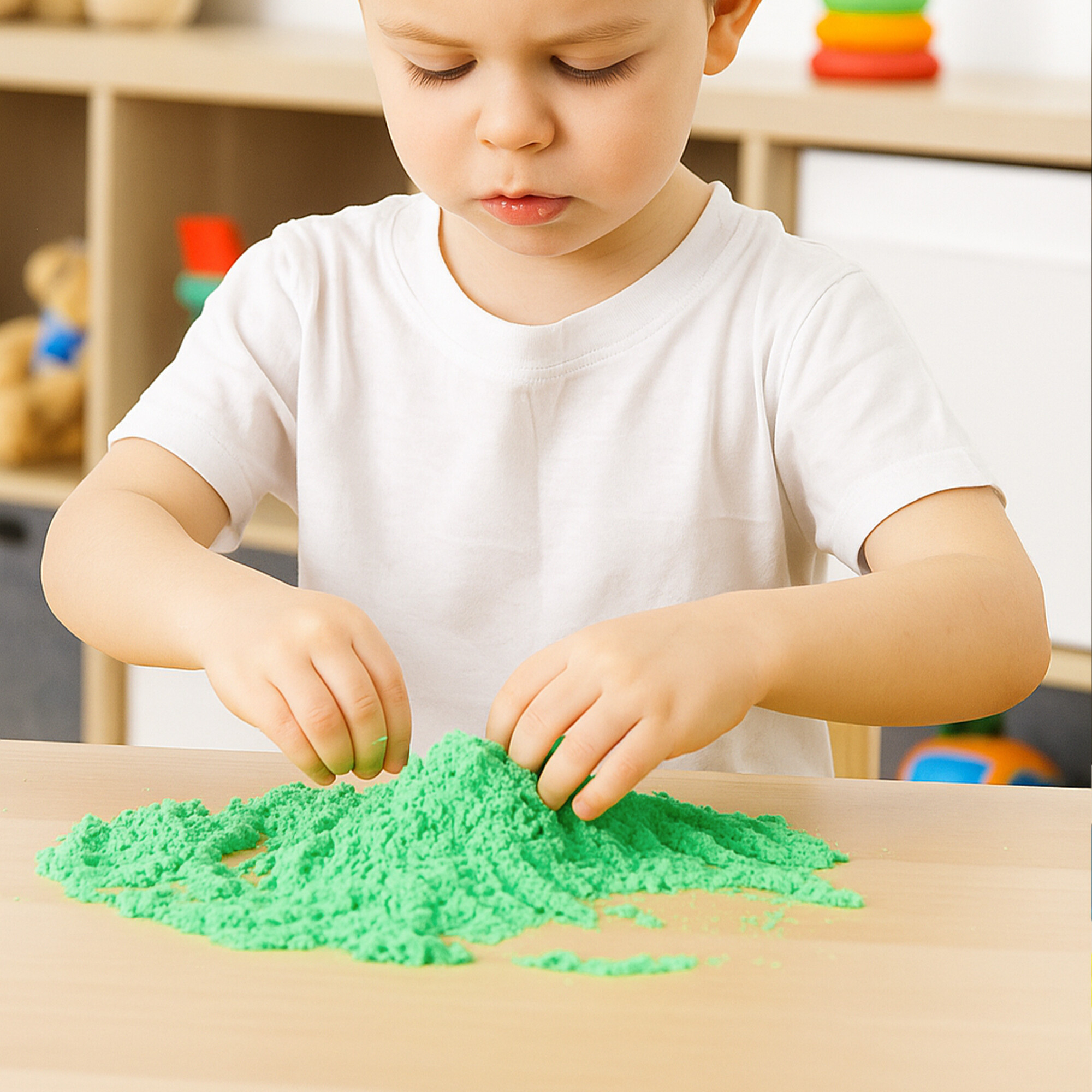 • Hra s kinetickým pieskom rozvíja jemnú motoriku, kreativitu, hmatové vnímanie a tvorivú predstavivosť detí