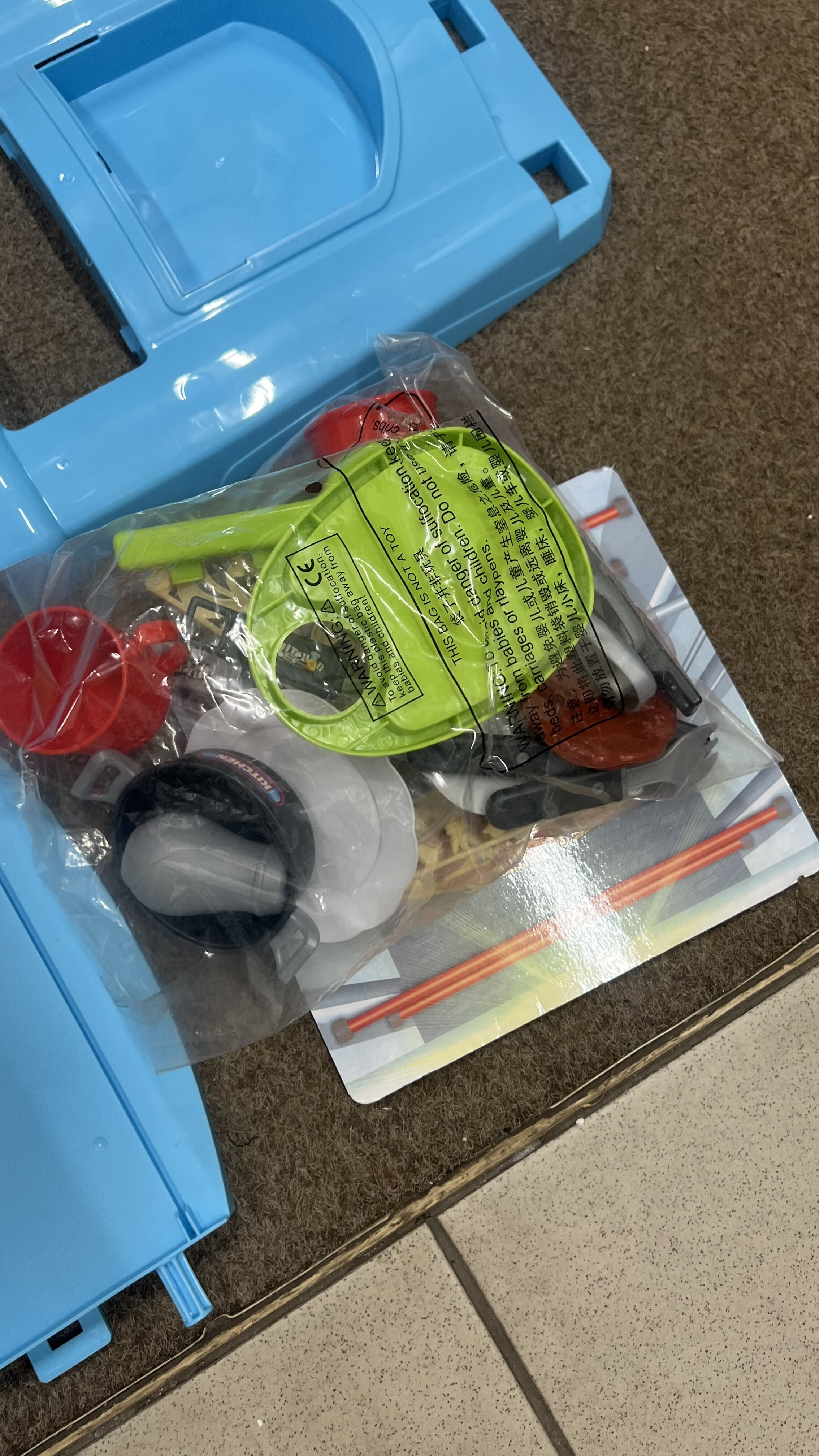 - Obsahuje množstvo rôzneho príslušenstva ako sú hrniec, panvička, pokrievky, taniere, kuchynské náradie, hrnček, potraviny a pod.