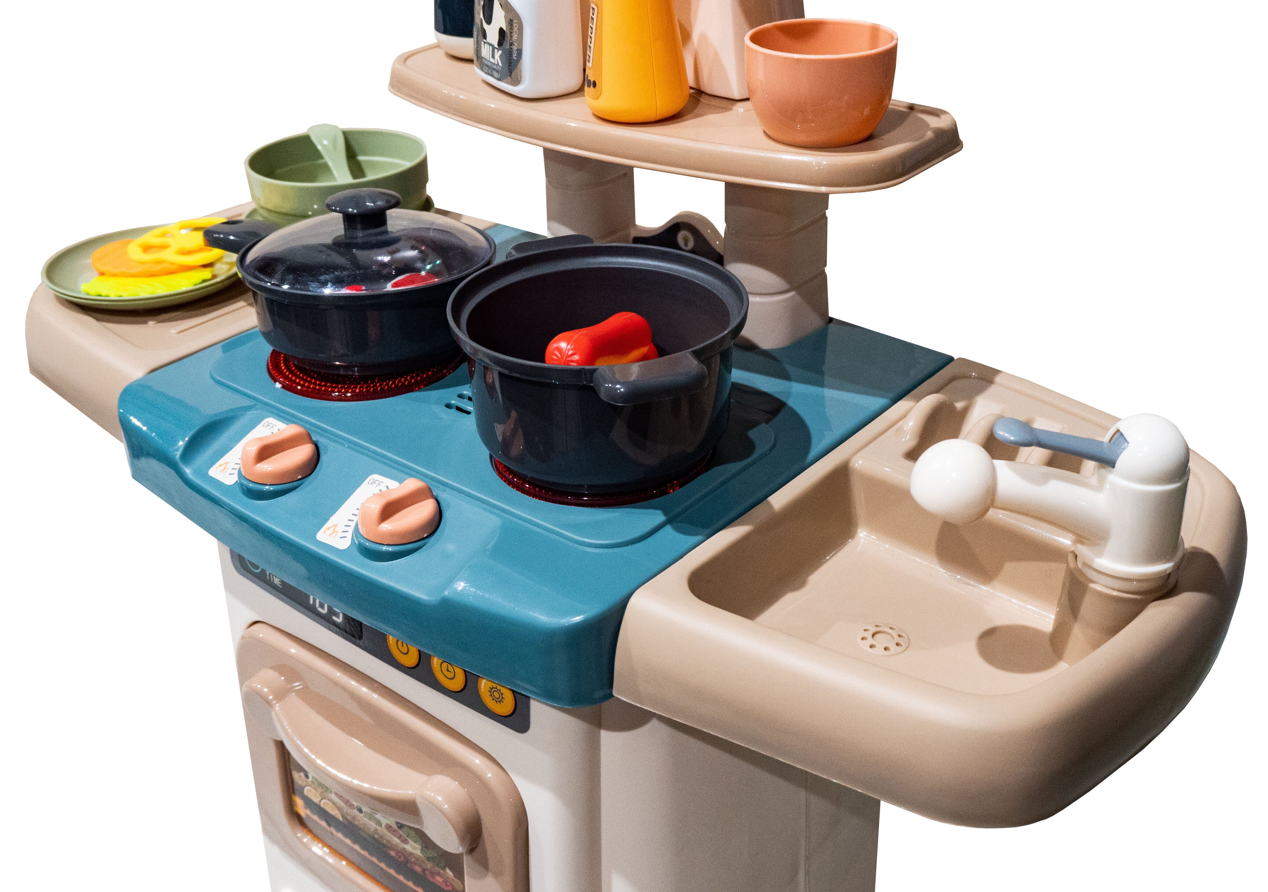 - Obsahuje množstvo rôzneho príslušenstva ako sú hrniec, panvička, pokrievky, taniere, náradie, jedlo a pod.