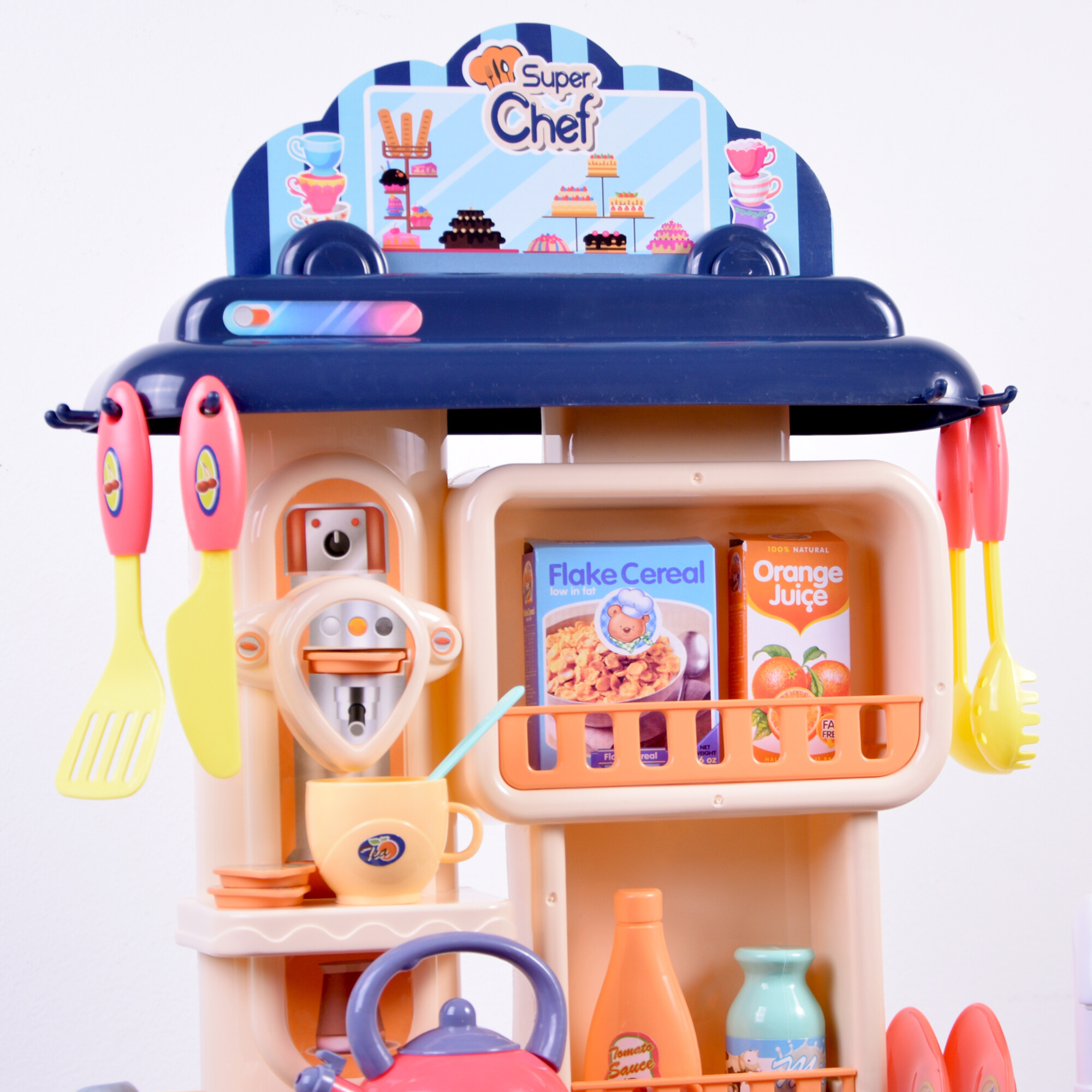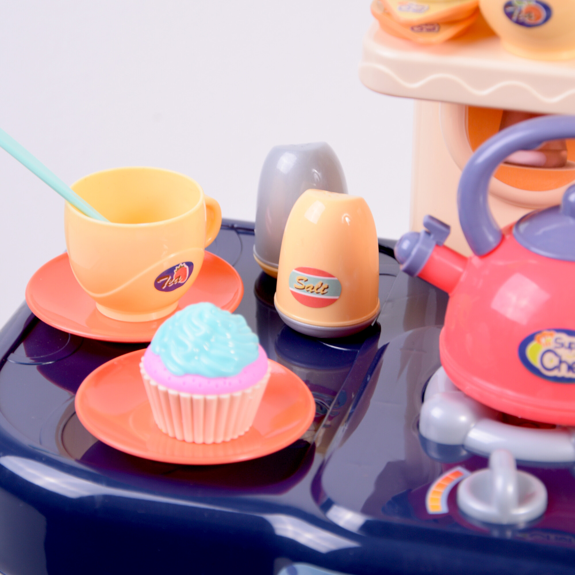 Horák sporáka má funkciu vypúšťania studenej pary, ktorá deťom umožní zažiť skutočné varenie. Gombíky na sporáku sa otáčajú a cvakajú, čím sa hra stáva interaktívnejšou a zábavnejšou.Plastová kuchynka má tiež drez a pumpičku s vodou, ktorá deťom umožní umývať riad. Odkladacie poličky a háčiky na kuchynské náradie poskytujú dostatok úložného priestoru pre všetko príslušenstvo.