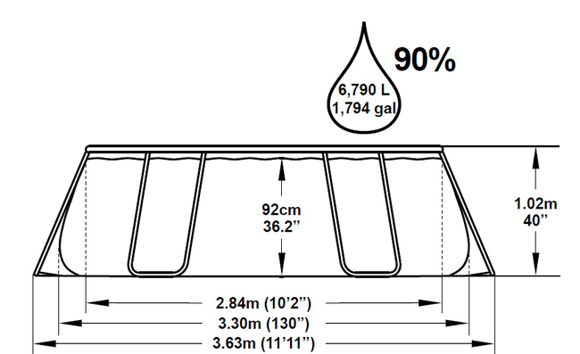 - Objem bazéna pri 90 % naplnení: 6 790 litrov