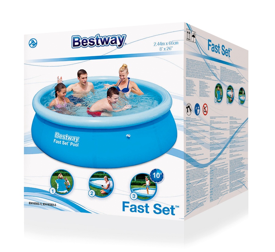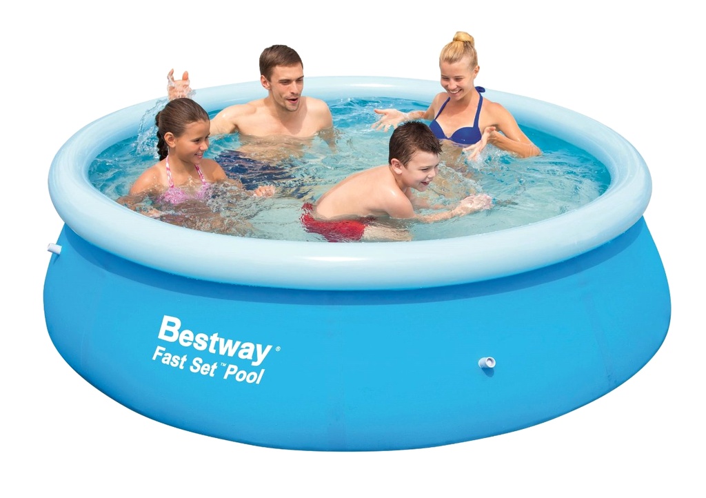 Nadzemný kruhový rodinný záhradný bazén od talianskej spoločnosti Bestway. Bazén je samonosný, stačí nafúknuť horný prstenec a naplniť bazén vodou.