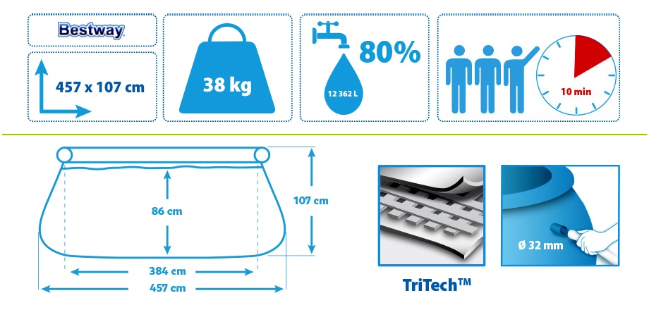 Špecifikácie bazéna Bestway Fast Set 4,57 x 1,07 m 57294 + Kartušová filtrácia.