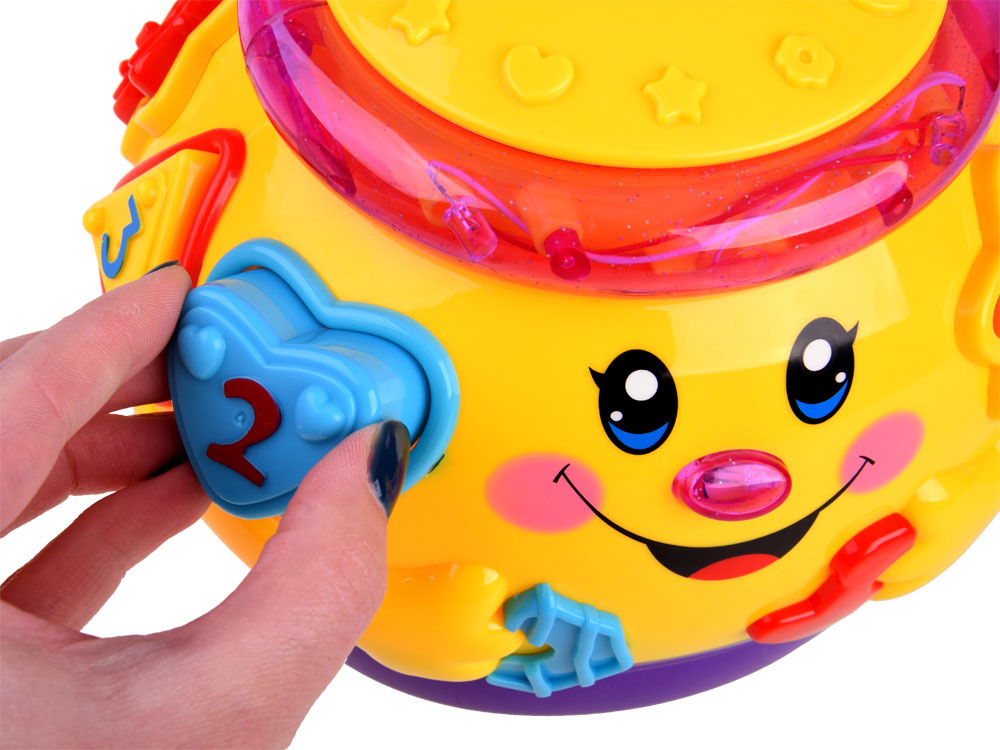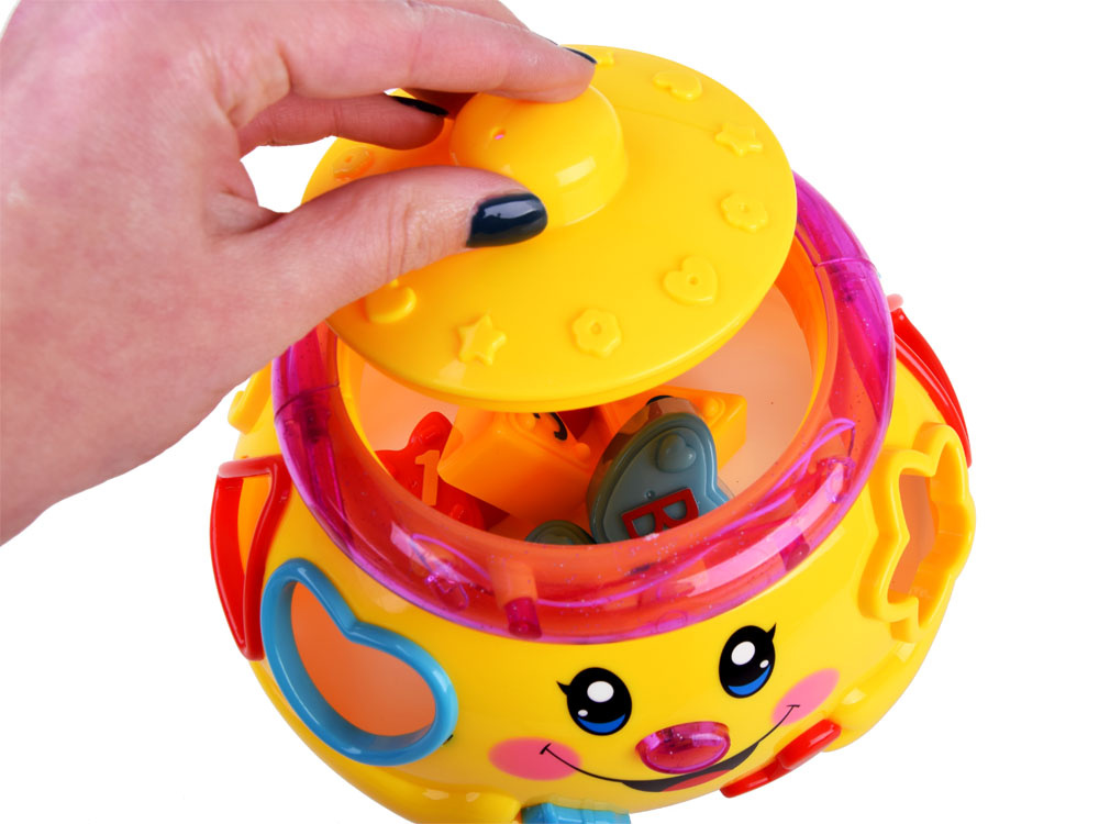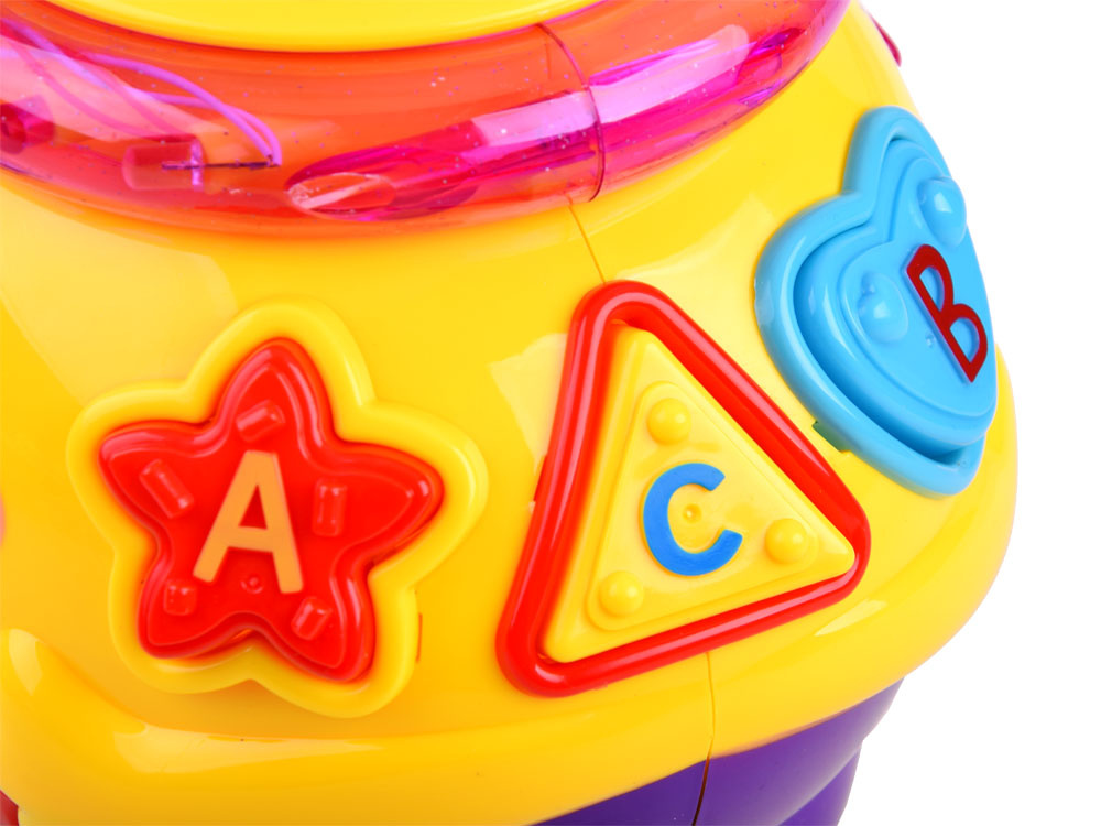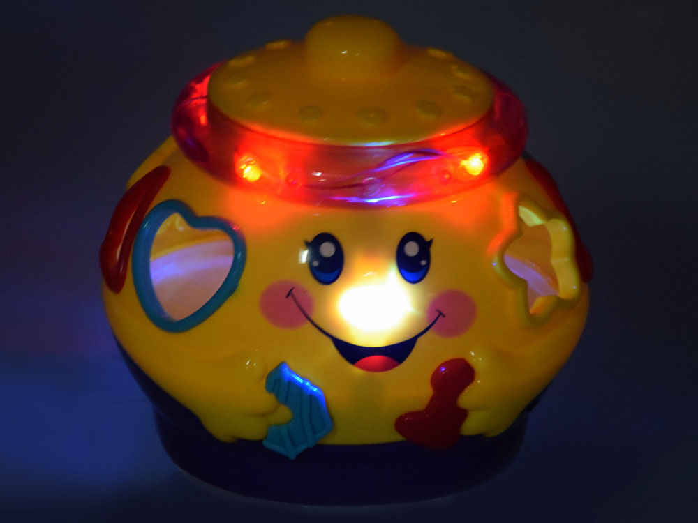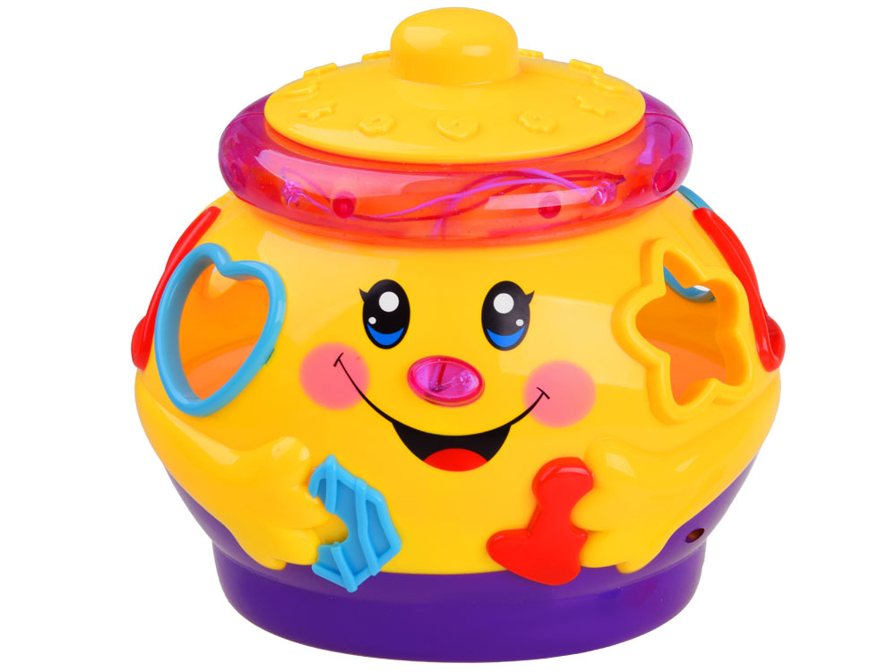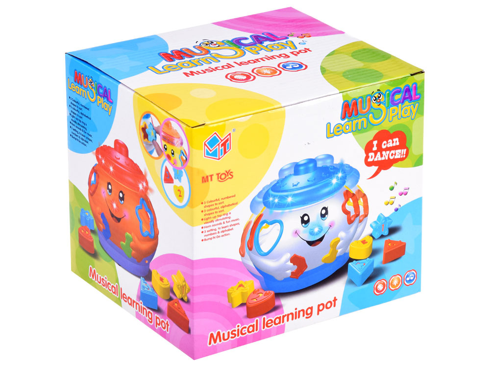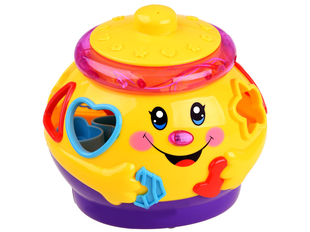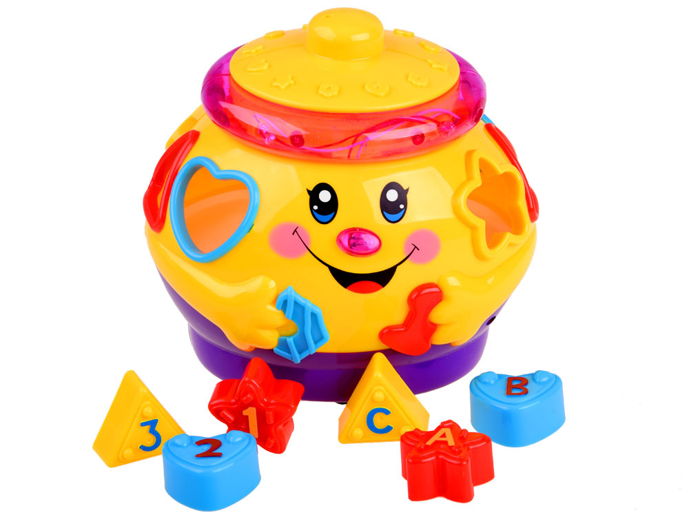 Interaktívna hračka z rady "uč sa a hraj sa", ktorá sa zameriava na učenie hrou. Hračka obsahuje 6 farebných kociek, ktoré je potrebné umiestniť do otvorov pre ne určených. Každý blok má iný tvar a je označený číslom alebo písmenom. pri hre sa dieťa učí rozlišovať tvary, farby. Farebný veselý hrniec po zapnutí hrá veselú hudbu, jazdí na kolieskach a veselo sa pohupuje, okraj svieti a bliká farebnými svetielkami. po vložení blokov do triedičov sa umiestnia do brucha hrnca. Objemné brucho hrnca pojme nielen kocky, ale pravdepodobne aj ďalšie potrebné poklady pre batoľa.